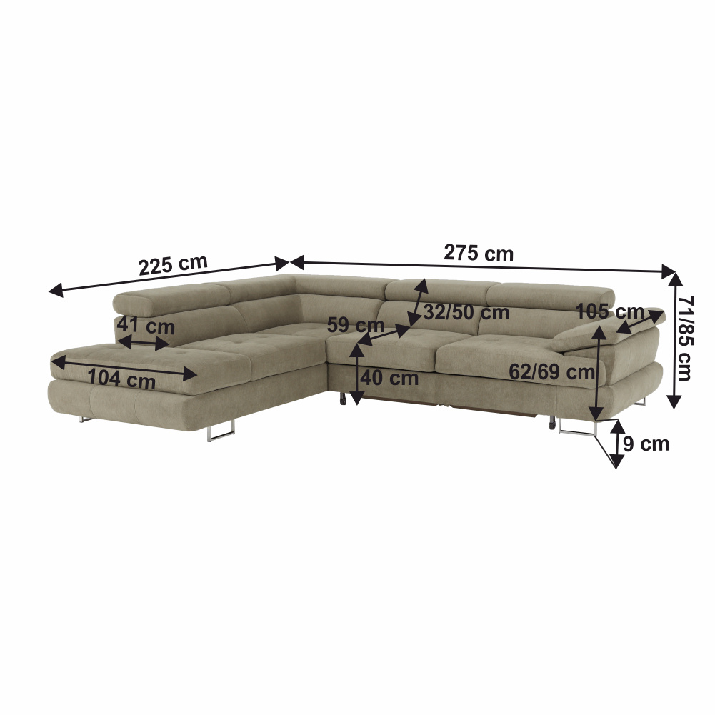 Materiál: látka Soro 13 Oděruodolnost textilie podle testu Martindale: 90 000- 100 000 oděrů Barva: světle hnědý melír Rozměry (ŠxHxV): 275x225x71/85 cm. Výška sedu: 40 cm Hloubka sedu: 59 cm Výška spodního prostoru od podlahy: 9 cm Výška zádové opěrky: 32/50 cm Hloubka sklopené zádové opěrky: 41 cm Opěrka na ruku (HxV): 105x62/69 cm Plocha na spaní: 125x200cm Šířka otomanu: 104 cm Nosnost: 90 kg Rohová Rozkládací S úložným prostorem Dekorativní prošití Zajímavá opěrka 3 polohovací opěrky hlavy 5 stupňové polohování opěrek Celočalouněná Pružinová výplň Nožičky kovové s povrchovou úpravou chrom Levé provedení Dodáváno bez dekorativních polštářků Dodáváno v demontu Nabízíme vám možnost objednat si sedačku v 7 barevných provedeních látky Soro dle vzorníku. Váš výběr napište přímo do poznámky v objednávce. Cena sedačky na individuální objednávku je verze s rozkladem a úložným prostorem BUTON R 40.250 Kč a pevná verze bez úložného prostoru BUTON P 37.090 Kč. Při individuální objednávce je třeba zaplatit 20% zálohu z dané částky. Po uhrazení zálohy bude Váš požadavek zadán do výroby. Doba dodání 6-8 týdnů.