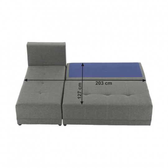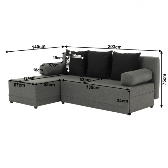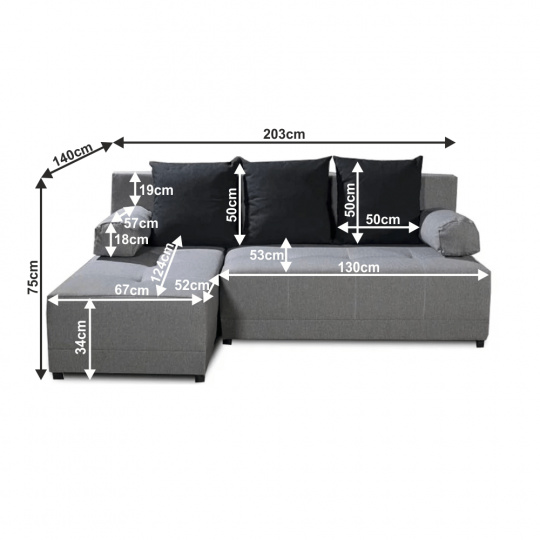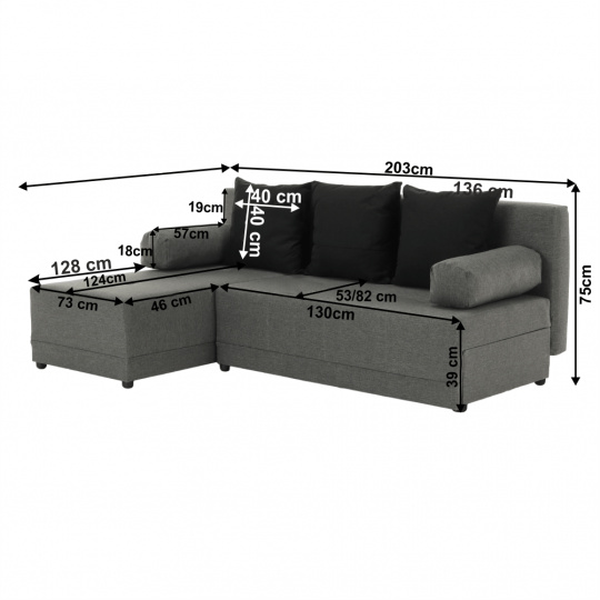Materiál: látka Barva: šedá / černá Rozměry: ŠxHxV: 203x140x75 cm Plocha na spaní: ŠxD: 127x203 cm Výška sedu: 39 cm Hloubka sedu: 53/82 cm Výška spodního prostoru od podlahy: 4 cm Výplň: molitán Nosnost na osobu: 90 kg Polštář (ŠxV): 40x40 cm 3 + 2 polštáře. Dodávané v demontu. Možnost objednání z vyobrazených barevných provedení v ceně 13.790 Kč.Při individuální objednávce je třeba zaplatit 20% zálohu z dané částky. Po uhrazení zálohy bude Vaša objednávka zadána do výroby. Doba dodání 6-8 týdnů.
