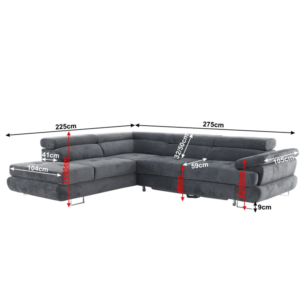 Materiál: látka Soro 97 Oděruodolnost textilie podle testu Martindale: 90 000- 100 000 oděrů Barva: šedá Rozměry (ŠxHxV): 275x225x71/85 cm. Výška sedu: 40 cm Hloubka sedu: 59 cm Výška spodního prostoru od podlahy: 9 cm Výška zádové opěrky: 32/50 cm Hloubka sklopené zádové opěrky: 41 cm Opěrka na ruku (HxV): 105x62/69 cm Šířka otomanu: 104 cm Nosnost: 90 kg Rohová Dekorativní prošití Zajímavá opěrka 3 polohovací opěrky hlavy 5 stupňové polohování opěrek Celočalouněná Pružinová výplň Levé provedení Dodáváno bez dekorativních polštářků Dodáváno v demontu Nabízíme vám možnost objednat si sedačku v 7 barevných provedeních látky Soro dle vzorníku. Váš výběr napište přímo do poznámky v objednávce. Cena sedačky na individuální objednávku je verze s rozkladem a úložným prostorem BUTON R 40.250 Kč a pevná verze bez úložného prostoru BUTON P 37.090 Kč. Při individuální objednávce je třeba zaplatit 20% zálohu z dané částky. Po uhrazení zálohy bude Váš požadavek zadán do výroby. Doba dodání 6-8 týdnů.
