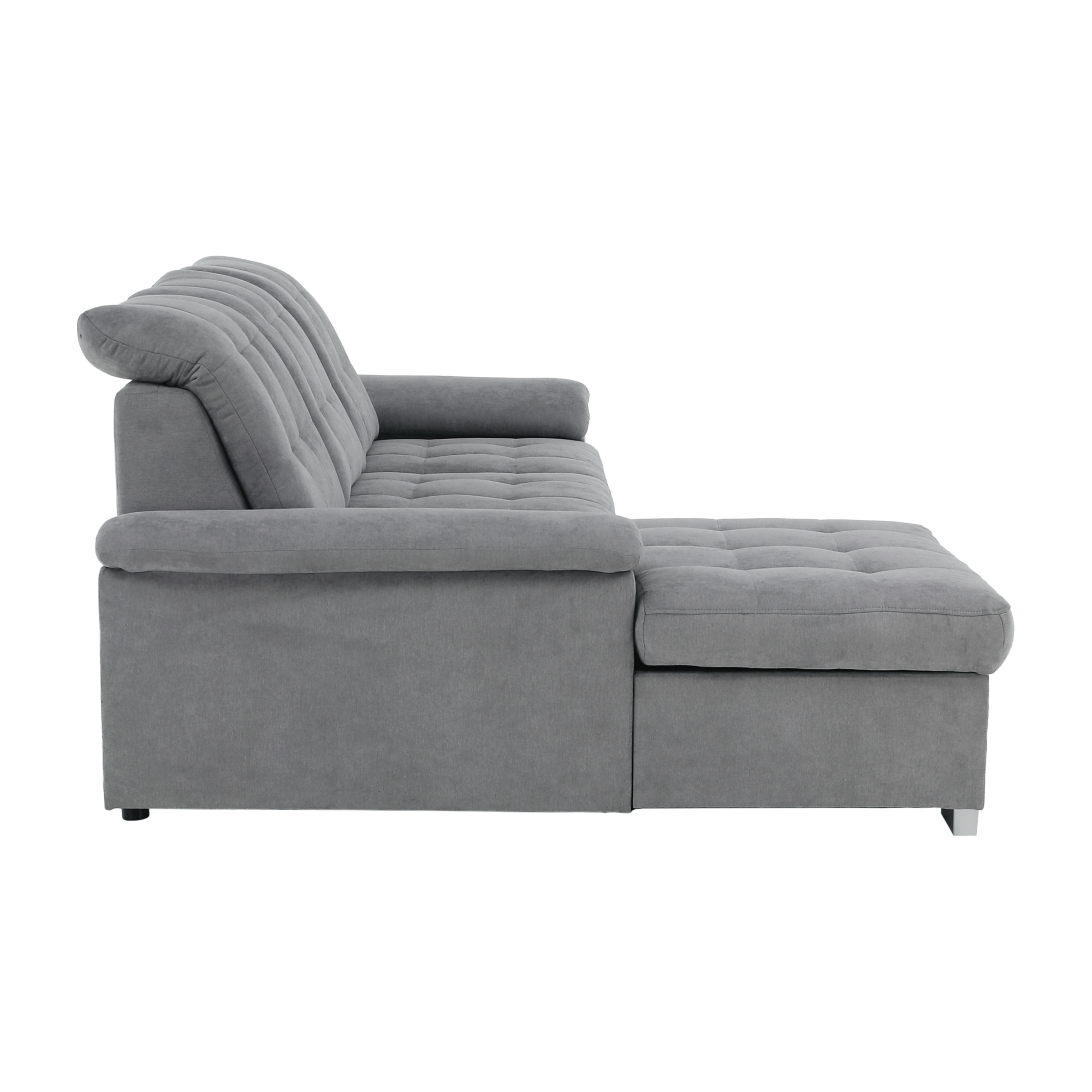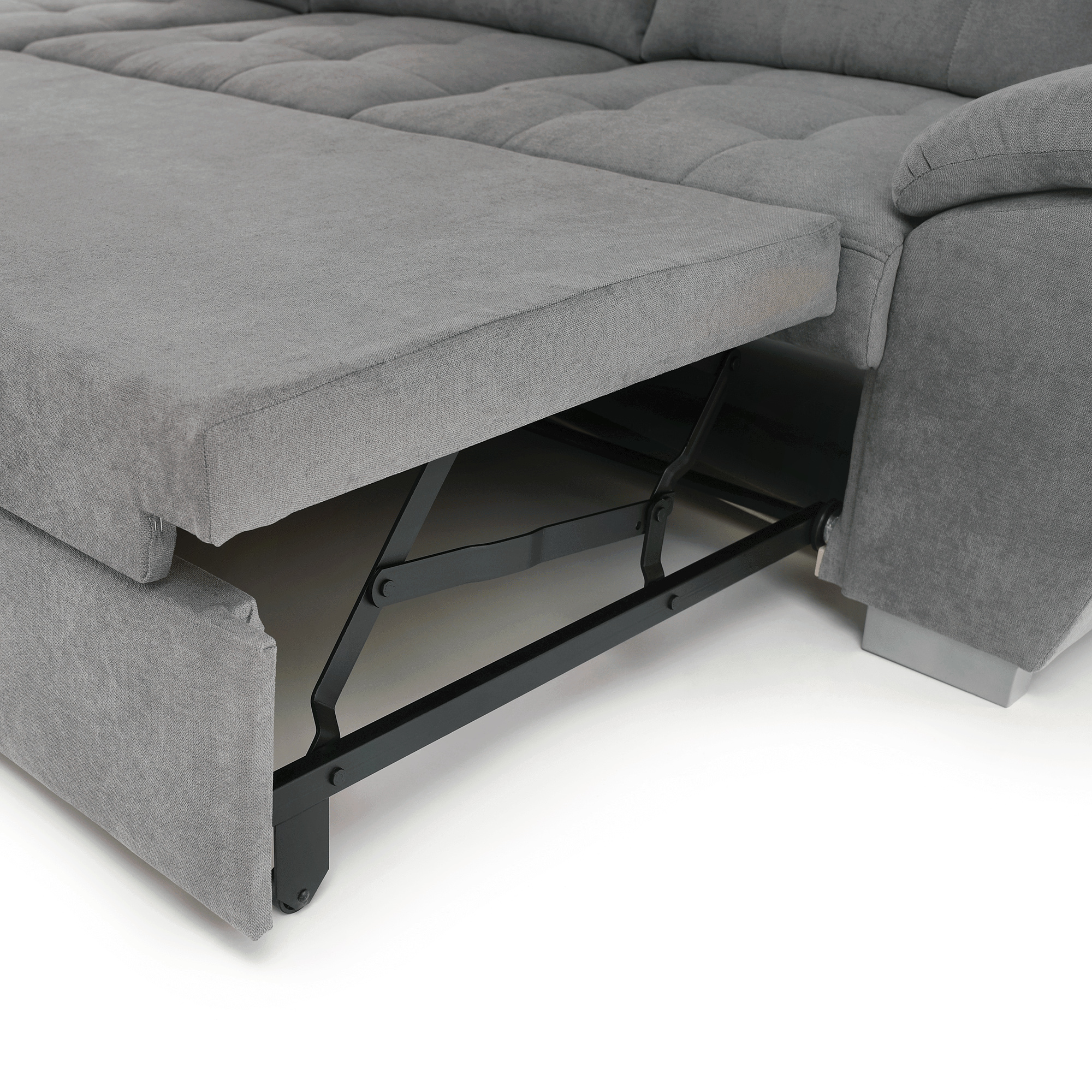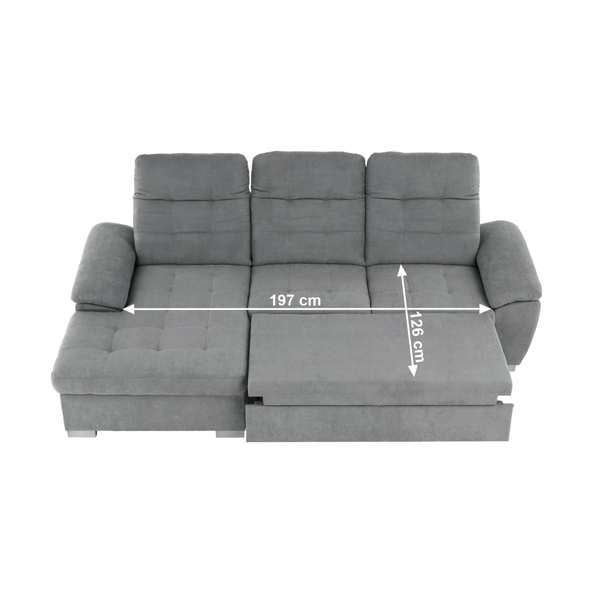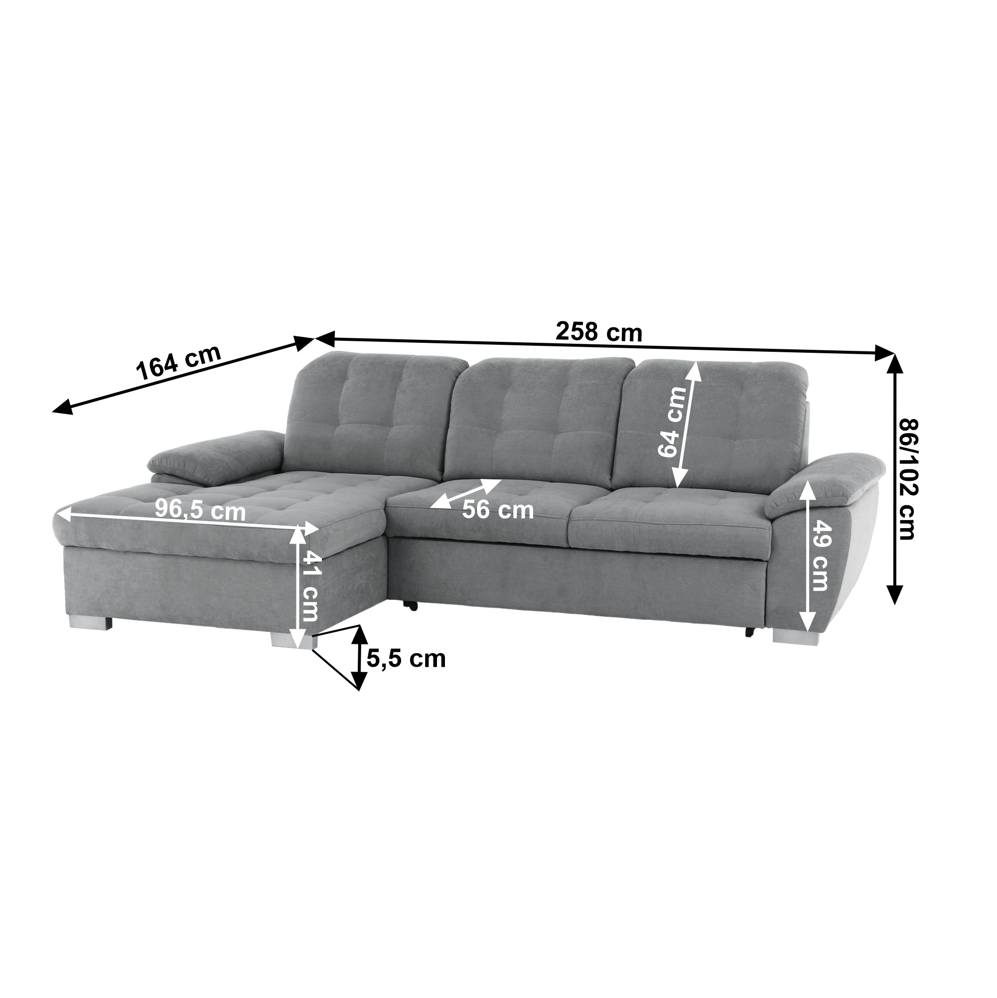 Rohová celočalouněná rozkládací sedací souprava s úložným prostorem EVANGELIN Materiál: látka Soro 90 Oděruodolnost textilie podle testu Martindale: 90 000- 100 000 oděrů Barva: šedá Rozměry (ŠxHxV): 258x164x102 / 86 cm Plocha na spaní (ŠxD): 197x126 cm Výška spodního prostoru od podlahy: 5,5 cm Výška sedu: 41 cm Hloubka sedu: 56 cm Délka pohovky s opěrkou: 184 cm Bez opěradla: 172cm Šířka bez boku: 68,5 cm Šířka Otomanů: 96,5 cm (spolu s bokem) Nosnost na osobu: 90 kg Levé provedení. Dodávané bez dekorativních polštářů Polohovací opěrky hlavy. 6 stupňové polohování opěrek Dodávané v demontu.