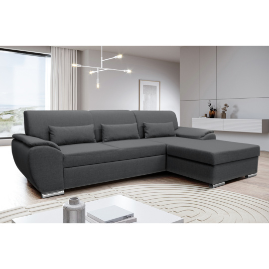 Materiál: látka Malmo 95 Oděruodolnost textilie podle testu Martindale: 30 000 oděrů Barva: šedá Rozměry (ŠxHxV): 280x174x83 cm Plocha na spaní (ŠxD): 130x210 cm Výška sedu: 43 cm Hloubka sedu: 63 cm Výška spodního prostoru od podlahy: 5 cm Plastové nožičky Barva nožiček: stříbrná 3 dekorativní polštáře Výplň: pružina/pur pěna Celočalouněná Rohová Rozkládací S úložným prostorem Pravé provedení Dodáváno v demontu