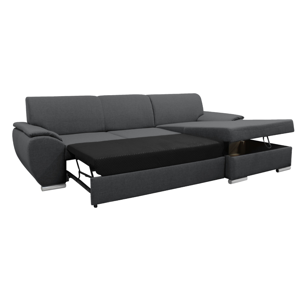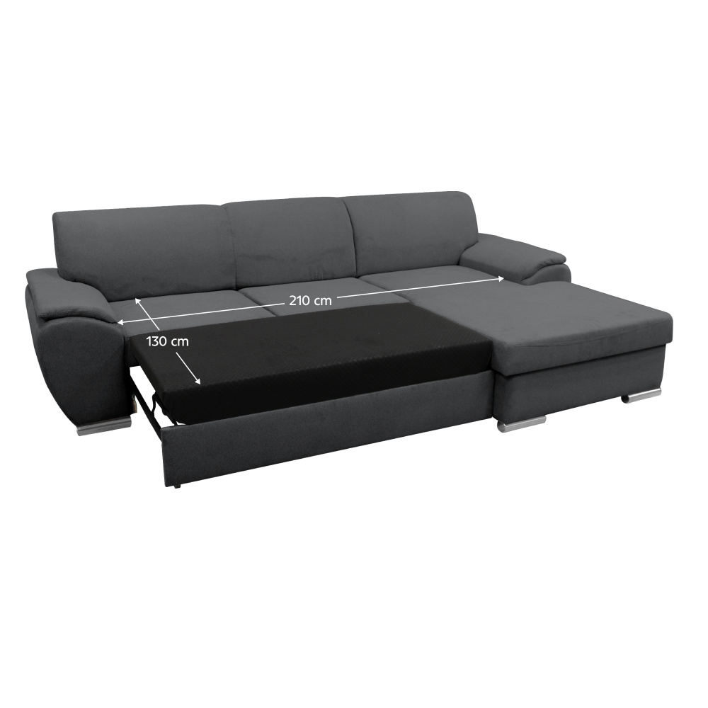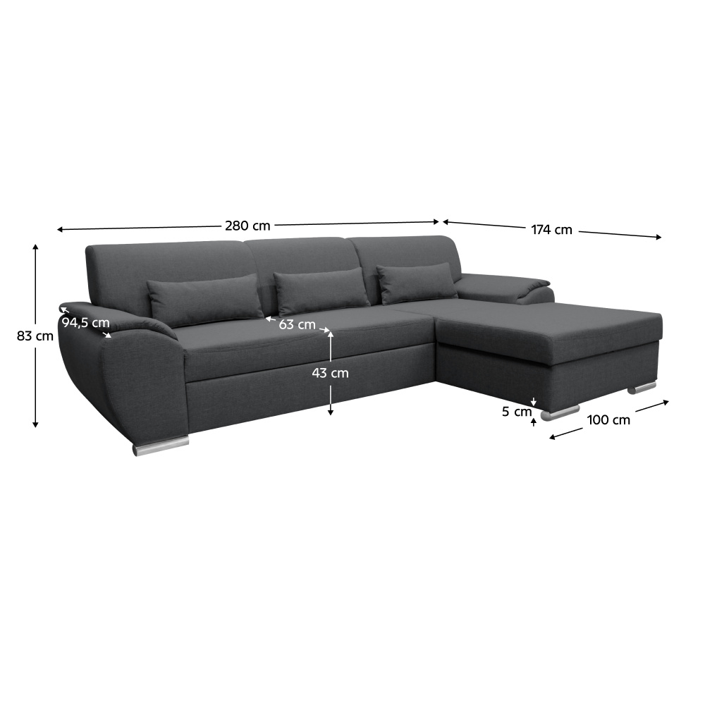 Materiál: látka Malmo 95 Oděruodolnost textilie podle testu Martindale: 30 000 oděrů Barva: šedá Rozměry (ŠxHxV): 280x174x83 cm Plocha na spaní (ŠxD): 130x210 cm Výška sedu: 43 cm Hloubka sedu: 63 cm Výška spodního prostoru od podlahy: 5 cm Plastové nožičky Barva nožiček: stříbrná 3 dekorativní polštáře Výplň: pružina/pur pěna Celočalouněná Rohová Rozkládací S úložným prostorem Pravé provedení Dodáváno v demontu