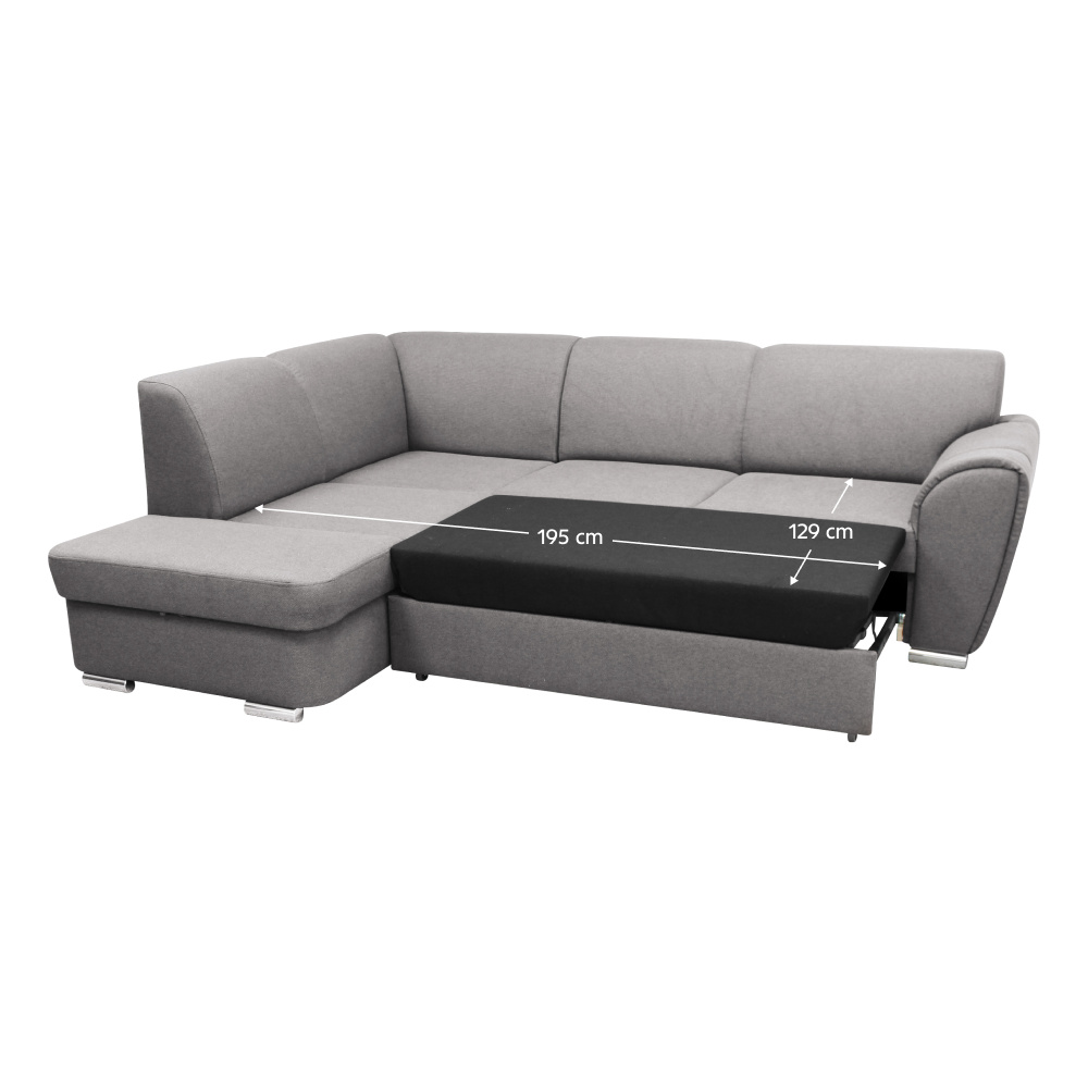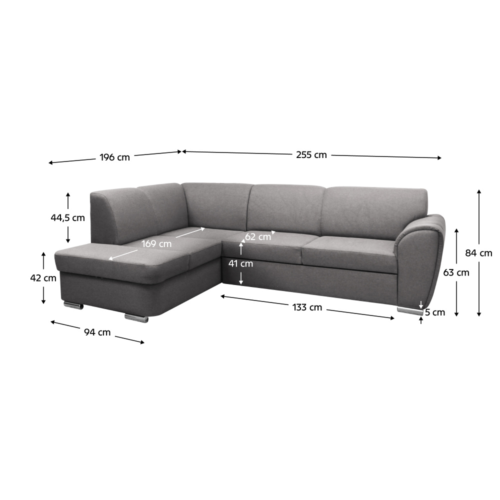 Materiál: látka Malmo 90 Oděruodolnost textilie podle testu Martindale: 30 000 oděrů Barva: šedá Rozměry (ŠxHxV): 255x196x84 cm Plocha na spaní (ŠxD): 129x195 cm Výška sedu: 41 cm Hloubka sedu: 62 cm Výška zádové opěrky: 44,5 cm Šířka sedáku: 136 cm Rozměry otomanu (ŠxH): 94x169 cm Výška spodního prostoru od podlahy: 5 cm Výška opěrky na ruku: 63 cm Výplň: pružina Falistra/PUR pěna Plastové nožičky Barva nožiček: stříbrná Celočalouněná Rozkládací Rohová Levé provedení Úložný prostor Dodáváno v demontu