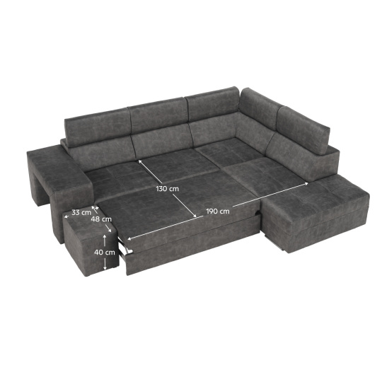 Materiál čalounění: látka Country 17 Oděruodolnost textilie podle testu Martindale: 65 000 oděrů Barva: šedá Materiál konstrukce: borového dřeva/bukového dřeva/laminátová deska Rozměry (ŠxHxV): 264x210x79/97 cm Plocha na spaní (ŠxD): 130x190 cm Výška sedu: 43 cm Hloubka sedu: 56 cm Rozměry otomanu (ŠxH): 97x165 cm Rozměry opěrky na ruku (ŠxHxV): 30x97x58 cm S taburetem Rozměry taburetu (ŠxHxV): 40x33x48 cm Celočalouněná Rozkládací Rohová S úložným prostorem Pravé provedení Na nožičkách Barva nožiček: chromová Výška spodního prostoru od podlahy: 4,5 cm Polohovací opěrky hlavy 5 stupňové polohování opěrek Výplň: pružina falista/pur pěna/molitan Dodáváno v demontu Možnost objednání v 8 barevných odstínech látky Country v ceně 35 990 Kč. s dodací lhůtou 6-8 týdnů. Při individuální objednávce je třeba zaplatit 20% zálohu z dané částky. Po uhrazení zálohy bude Váš požadavek zadán do výroby.