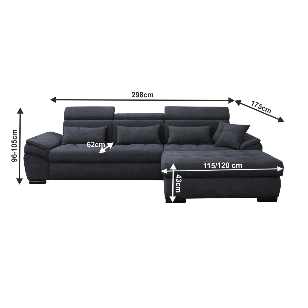 ;"Materiál: látka Alfa 120 Oděruodolnost textilie podle testu Martindale: 55 000 oděrek Barva: 20 šedá Rozměry (ŠxHxV): 298x175x96 / 105 cm plocha na spaní (ŠxD): 125x220 cm Výška sedu: 43 cm Hloubka sedu: 62 cm Výška spodního prostoru od podlahy: 5 cm Šířka otomanu: 115/120 cm Hloubka otomanu: 140 cm Nosnost na osobu: 90 kg celočalouněná rohová rozkládací S úložným prostorem Dodávána s polštáři S polohovacími opěrkami hlavy 5 polohovacích opěrek pravé provedení Dodávané v demontu. Možnost objednání v 8 barevných provedeních látky Alfa v ceně 41.590 Kč. Při individuální objednávce je třeba zaplatit 20% zálohu z dané částky. Po uhrazení zálohy bude Vaša objednávka zadána do výroby. Dodací lhůta 6-8 týdnů.