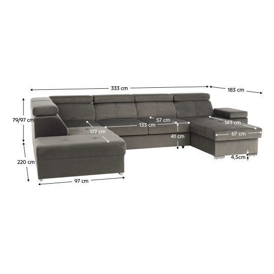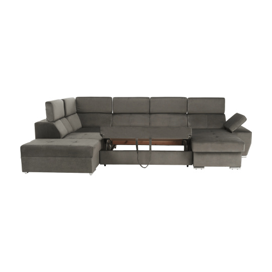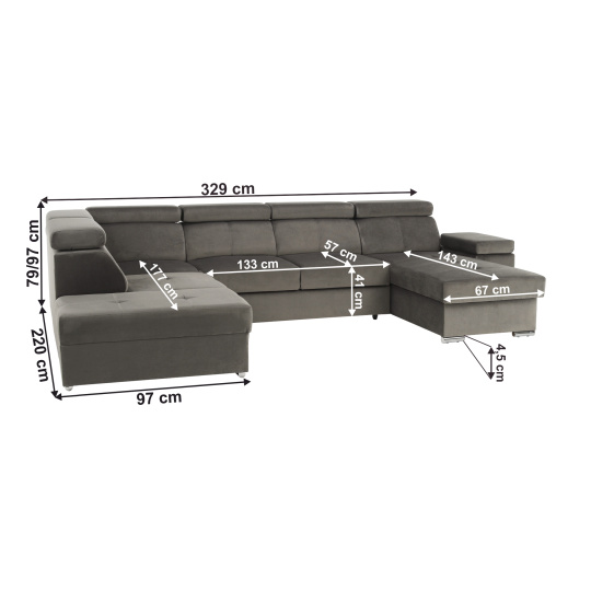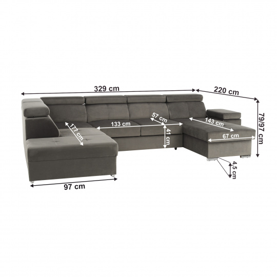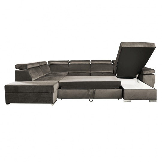 Materiál: látka KRONOS Oděruodolnost textilie podle testu Martindale: 60 000 oděrek Barva: šedohnědá taupe 15 Rozměry: (ŠxHxV): 333x220x79 / 97 cm Rozměry plochy na spaní (ŠxD): 256x129 cm Hloubka sedu: 57 cm Výška sedu: 41 cm Výška spodního prostoru od podlahy: 4,5 cm Šířka volného prostoru mezi otomany: 133 cm 6 kovových noh 6 polohovacích opěrek hlavy 5 stupňové polohování opěrek 1 polohovací opěrka ruky S úložným prostorem rozkládací celočalouněná Exkluzivní a moderní vzhled pravé provedení Výplň sezení: pružiny faliste a pur pěna T30KG / m3, tloušťka pěny 10 cm Výplň opěrky: elastické pásy a pur pěna T25 / m3, tloušťka pěny 7 cm Dekorativní polštáře nejsou součástí balení Dodávané v demontu Možnost objednání v 6 barevných provedeních látky Kronos za cenu 39.950 Kč. Při individuální objednávce je třeba zaplatit 20% zálohu z dané částky. Po uhrazení zálohy bude Váš požadavek zadán do výroby. Dodací lhůta 6-8 týdnů.