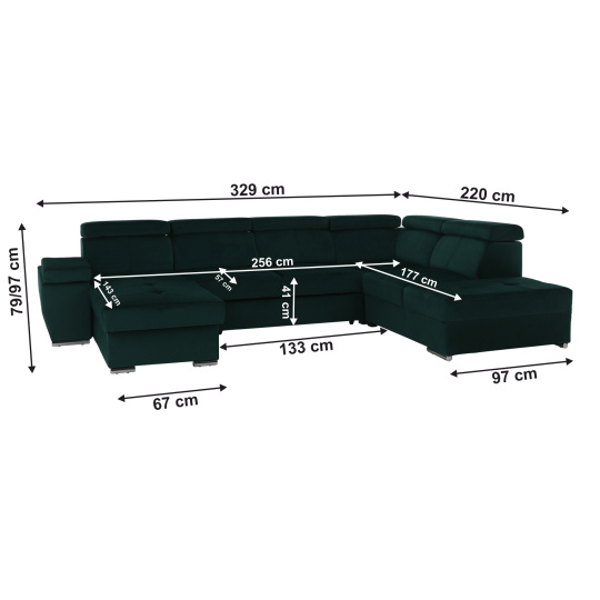 Materiál: látka KRONOS Oděruodolnost textilie podle testu Martindale: 50 000 oděrek Barva: smaragdová 19 Rozměry: (ŠxHxV): 333x220x79 / 97 cm Rozměry plochy na spaní (ŠxD): 256x129 cm Hloubka sedu: 57 cm Výška sedu: 41 cm Výška spodního prostoru od podlahy: 4,5 cm Šířka volného prostoru mezi otomany: 133 cm 6 polohovacích opěrek hlavy 5 stupňové polohování opěrek 1 polohovací opěrka ruky S úložným prostorem rozkládací celočalouněná Exkluzivní a moderní vzhled Levé provedení Výplň sezení: pružiny faliste a pur pěna T30KG / m3, tloušťka pěny 10 cm Výplň opěrky: elastické pásy a pur pěna T25 / m3, tloušťka pěny 7 cm Dekorativní polštáře nejsou součástí balení Dodávané v demontu Možnost objednání v 6 barevných provedeních látky Kronos za cenu 39.950 Kč. Při individuální objednávce je třeba zaplatit 20% zálohu z dané částky. Po uhrazení zálohy bude Váš požadavek zadán do výroby. Dodací lhůta 6-8 týdnů.