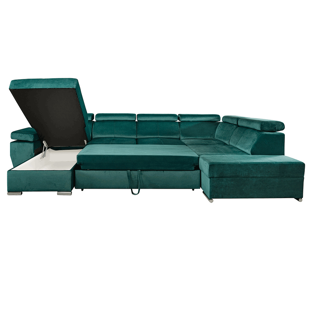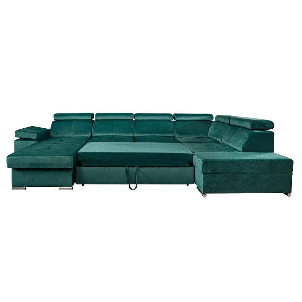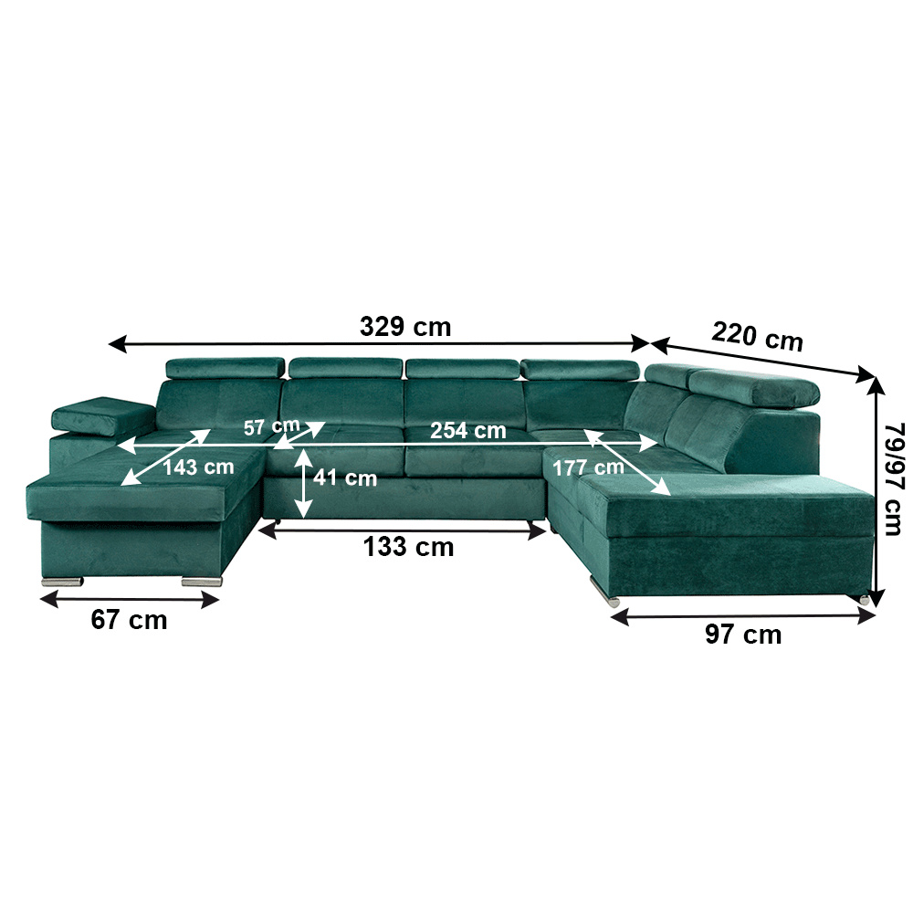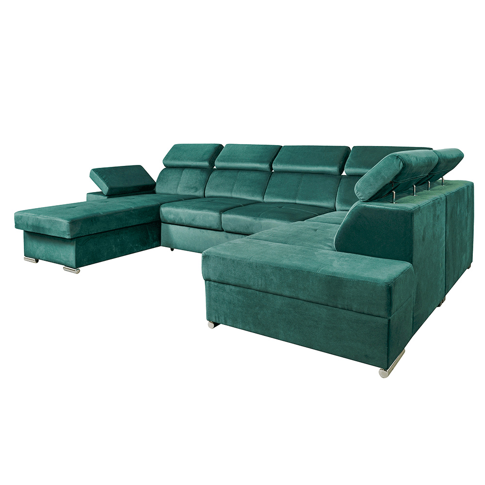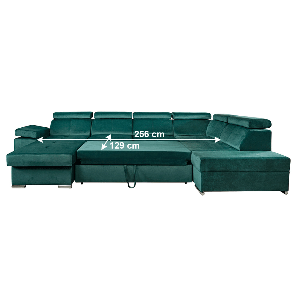 Materiál: látka KRONOS Oděruodolnost textilie podle testu Martindale: 50 000 oděrek Barva: smaragdová 19 Rozměry: (ŠxHxV): 333x220x79 / 97 cm Rozměry plochy na spaní (ŠxD): 256x129 cm Hloubka sedu: 57 cm Výška sedu: 41 cm Výška spodního prostoru od podlahy: 4,5 cm Šířka volného prostoru mezi otomany: 133 cm 6 polohovacích opěrek hlavy 5 stupňové polohování opěrek 1 polohovací opěrka ruky S úložným prostorem rozkládací celočalouněná Exkluzivní a moderní vzhled Levé provedení Výplň sezení: pružiny faliste a pur pěna T30KG / m3, tloušťka pěny 10 cm Výplň opěrky: elastické pásy a pur pěna T25 / m3, tloušťka pěny 7 cm Dekorativní polštáře nejsou součástí balení Dodávané v demontu Možnost objednání v 6 barevných provedeních látky Kronos za cenu 39.950 Kč. Při individuální objednávce je třeba zaplatit 20% zálohu z dané částky. Po uhrazení zálohy bude Váš požadavek zadán do výroby. Dodací lhůta 6-8 týdnů.
