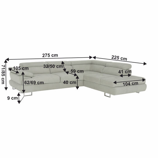 Materiál: látka Soro 83 Oděruodolnost textilie podle testu Martindale: 90 000- 100 000 oděrů Barva: světle šedá Rozměry (ŠxHxV): 275x225x71/85 cm. Výška sedu: 40 cm Hloubka sedu: 59 cm Výška spodního prostoru od podlahy: 9 cm Výška zádové opěrky: 32/50 cm Hloubka sklopené zádové opěrky: 41 cm Opěrka na ruku (HxV): 105x62/69 cm Šířka otomanu: 104 cm Nosnost: 90 kg Rohová Dekorativní prošití Zajímavá opěrka 3 polohovací opěrky hlavy 5 stupňové polohování opěrek Celočalouněná Pružinová výplň Nožičky kovové s povrchovou úpravou chrom Pravé provedení Dodáváno bez dekorativních polštářků Dodáváno v demontu Nabízíme vám možnost objednat si sedačku v 7 barevných provedeních látky Soro dle vzorníku. Váš výběr napište přímo do poznámky v objednávce. Cena sedačky na individuální objednávku je verze s rozkladem a úložným prostorem BUTON R 40.250 Kč a pevná verze bez úložného prostoru BUTON P 37.090 Kč. Při individuální objednávce je třeba zaplatit 20% zálohu z dané částky. Po uhrazení zálohy bude Váš požadavek zadán do výroby. Doba dodání 6-8 týdnů.