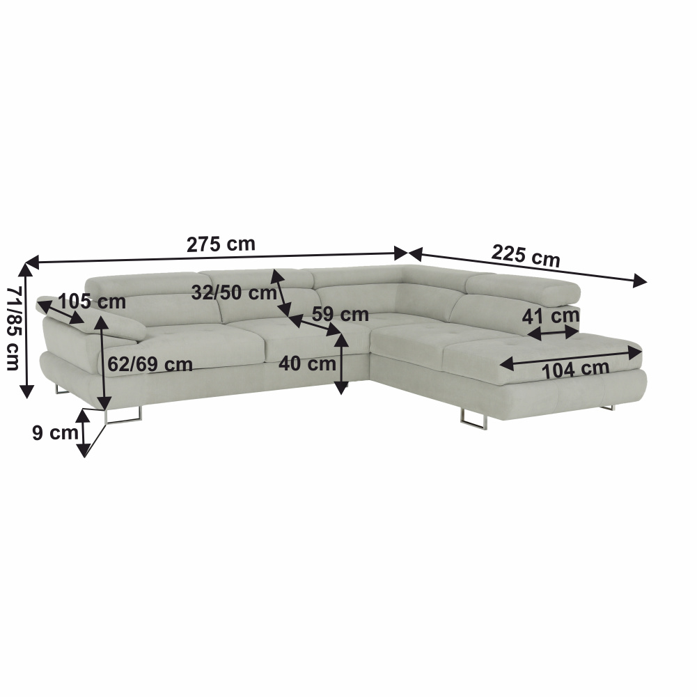 Materiál: látka Soro 83 Oděruodolnost textilie podle testu Martindale: 90 000- 100 000 oděrů Barva: světle šedá Rozměry (ŠxHxV): 275x225x71/85 cm. Výška sedu: 40 cm Hloubka sedu: 59 cm Výška spodního prostoru od podlahy: 9 cm Výška zádové opěrky: 32/50 cm Hloubka sklopené zádové opěrky: 41 cm Opěrka na ruku (HxV): 105x62/69 cm Šířka otomanu: 104 cm Nosnost: 90 kg Rohová Dekorativní prošití Zajímavá opěrka 3 polohovací opěrky hlavy 5 stupňové polohování opěrek Celočalouněná Pružinová výplň Nožičky kovové s povrchovou úpravou chrom Pravé provedení Dodáváno bez dekorativních polštářků Dodáváno v demontu Nabízíme vám možnost objednat si sedačku v 7 barevných provedeních látky Soro dle vzorníku. Váš výběr napište přímo do poznámky v objednávce. Cena sedačky na individuální objednávku je verze s rozkladem a úložným prostorem BUTON R 41.450 Kč a pevná verze bez úložného prostoru BUTON P 38.190 Kč. Při individuální objednávce je třeba zaplatit 20% zálohu z dané částky. Po uhrazení zálohy bude Váš požadavek zadán do výroby. Doba dodání 6-8 týdnů.