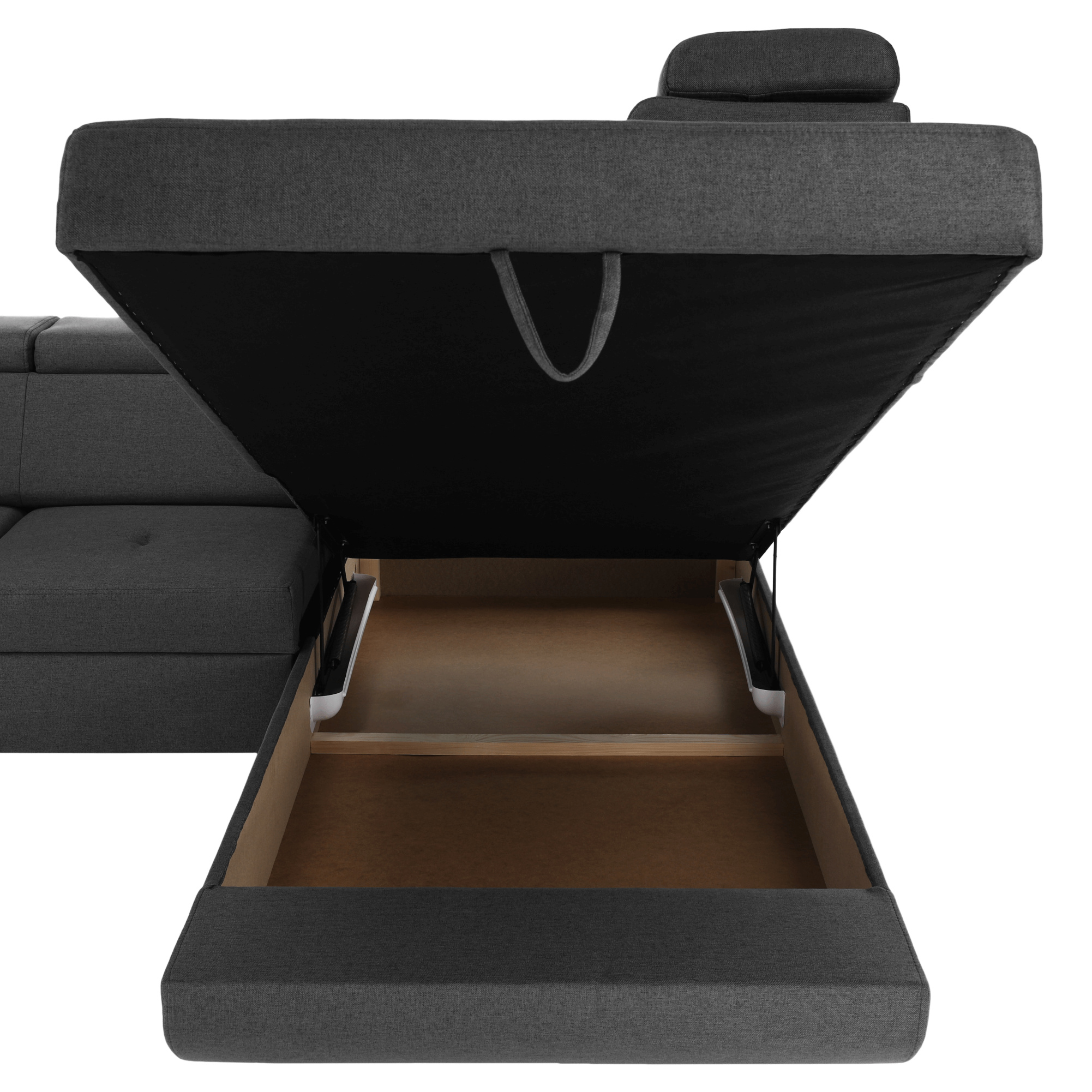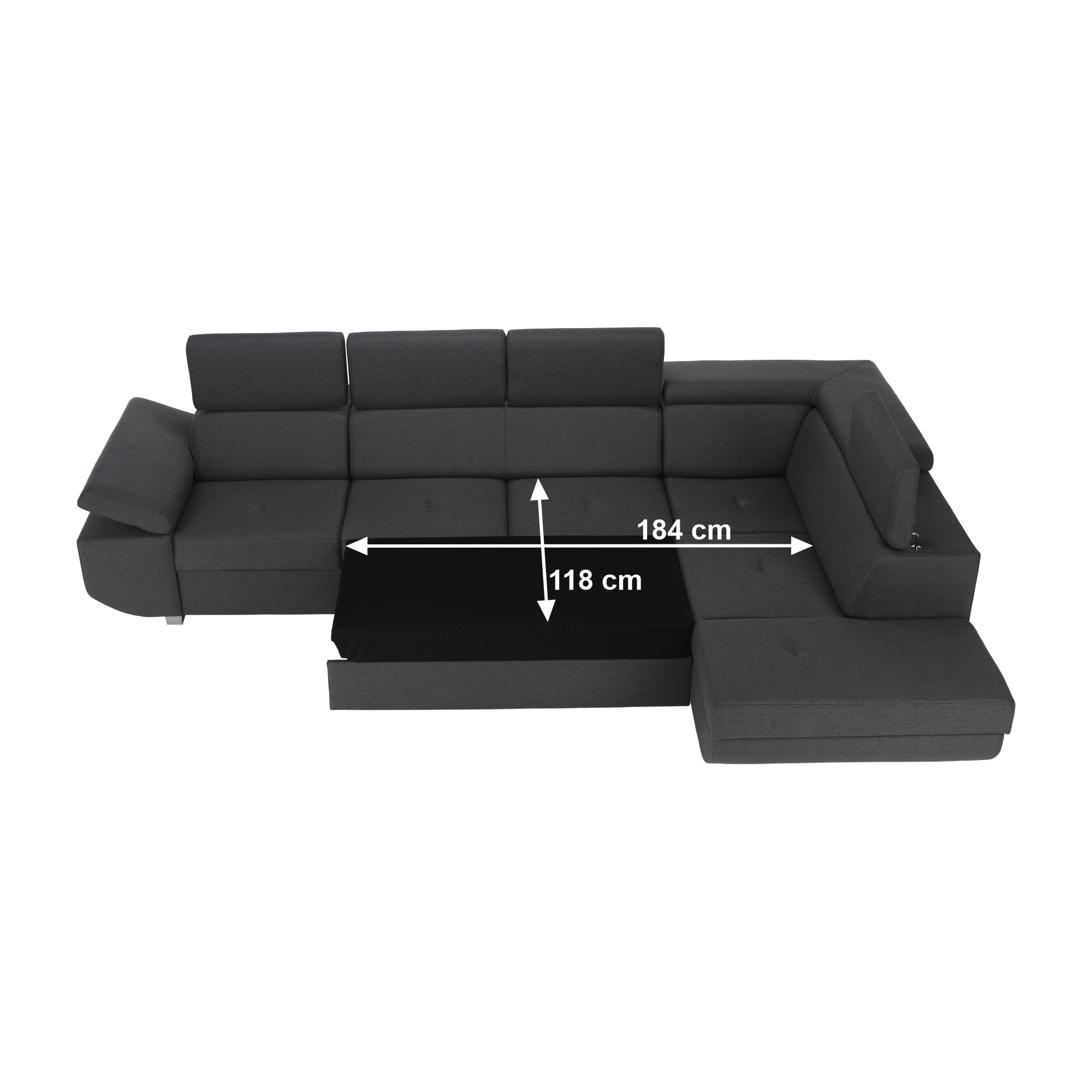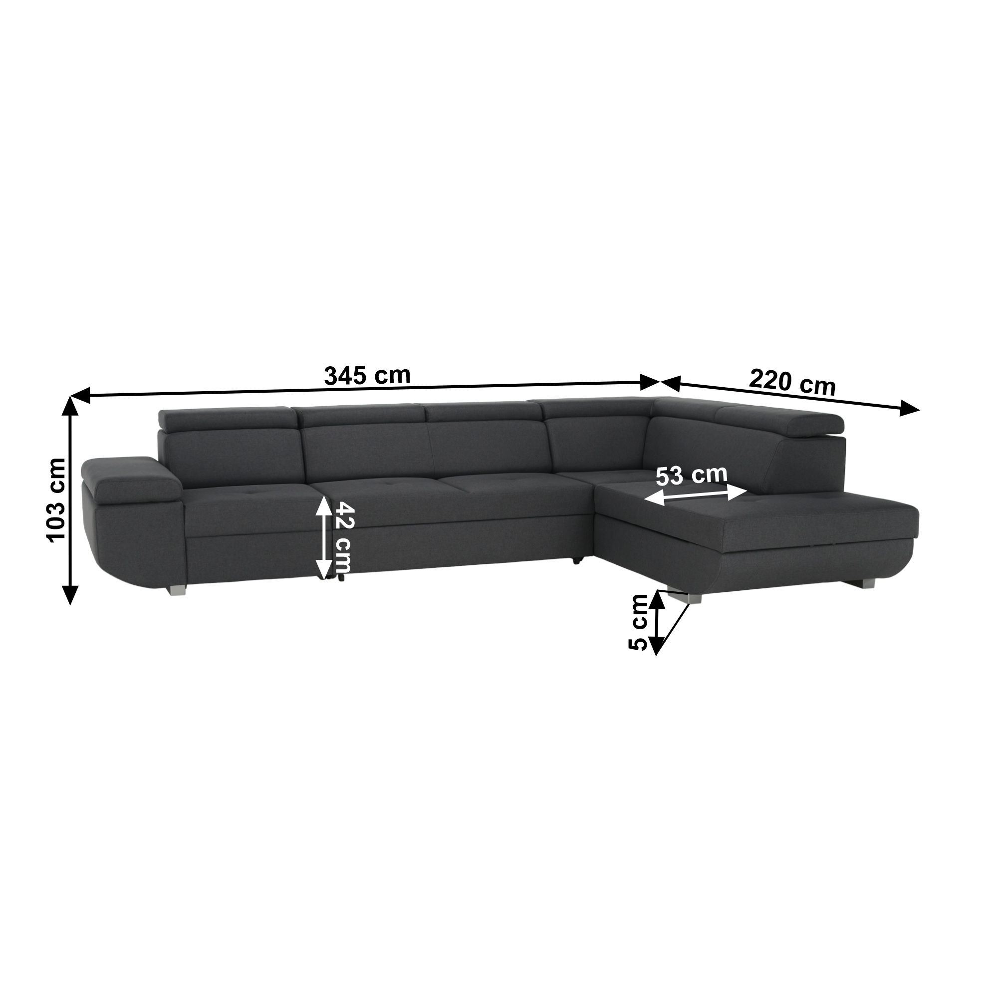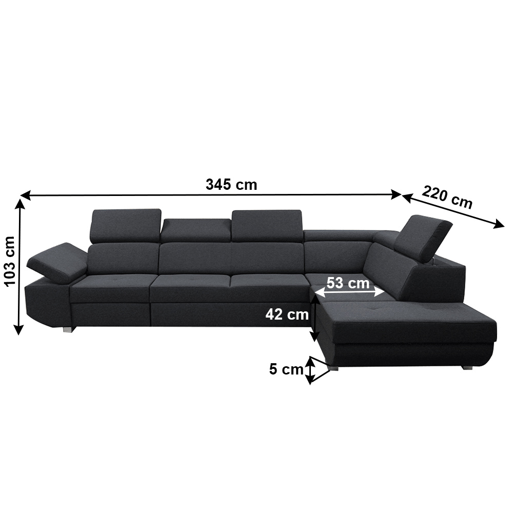 Materiál: látka Stark Oděruodolnost textilie podle testu Martindale: 50 000 oděrek Barva: 382 tmavě šedá Rozměry (ŠxHxV): 345x220x103 cm Plocha na spaní (ŠxD): 118x184 cm Výška sedu: 42 cm Hloubka sedu: 53 cm Výška spodního prostoru od podlahy: 5 cm celočalouněná rohová rozkládací kovové nožičky 4 polohovací opěrky hlavy a krční páteře Opěrka na ruce s funkcí sklápění S úložným prostorem pravé provedení Voděodolný materiál Dodávané v demontu. Nabízíme možnost objednat sedačku až v 6 barevných provedeních látky Stark v ceně 43.390,- Kč. Při individuální objednávce je třeba zaplatit 20% zálohu z dané částky. Po uhrazení zálohy bude Váš požadavek zadána do výroby. Doba dodání 6-8 týdnů.