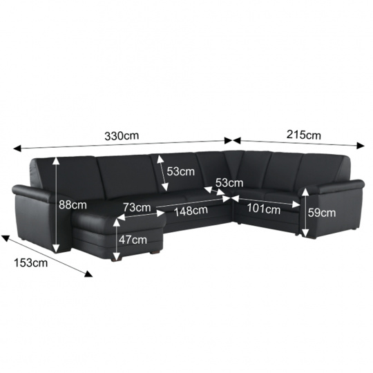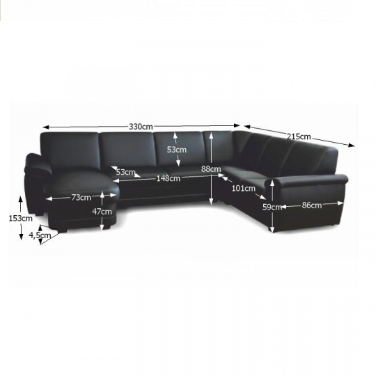Materiál: ekokůže Oděruodolnost textilie podle testu Martindale: 100 000 oděrů Barva: černá Rozměry (ŠxHxV): 330x215/153x88 Plocha na spaní (ŠxD): 120x260 cm Výška sedu: 47 cm Hloubka sedu: 53 cm Šířka volného prostoru mezi otomany: 148 cm Výška spodního prostoru od podlahy: 3 cm Možnost poskládat vlastní rozměr Pružinová výplň Ve tvaru U Levé provedení Rozkládací S úložným prostorem Dodávána v demontu Nabízíme vám možnost zvolit si barevný odstín ze sedmi barev látky Cablo a ze sedmi barev ekokůže. Odstíny naleznete v přiloženém vzorníku. Výběr barevného odstínu poznamenejte při objednávání přímo do poznámky. Při individuální objednávce je třeba zaplatit 20% zálohu z dané částky. Po uhrazení zálohy bude Váš požadavek zadán do výroby. Dodací doba 6-8 týdnů. Cena takto složené sedačky v jiné barvě závisí na počtu jednotlivých dílů, které ji tvoří. Doporučujeme prověřit si konečnou cenu.