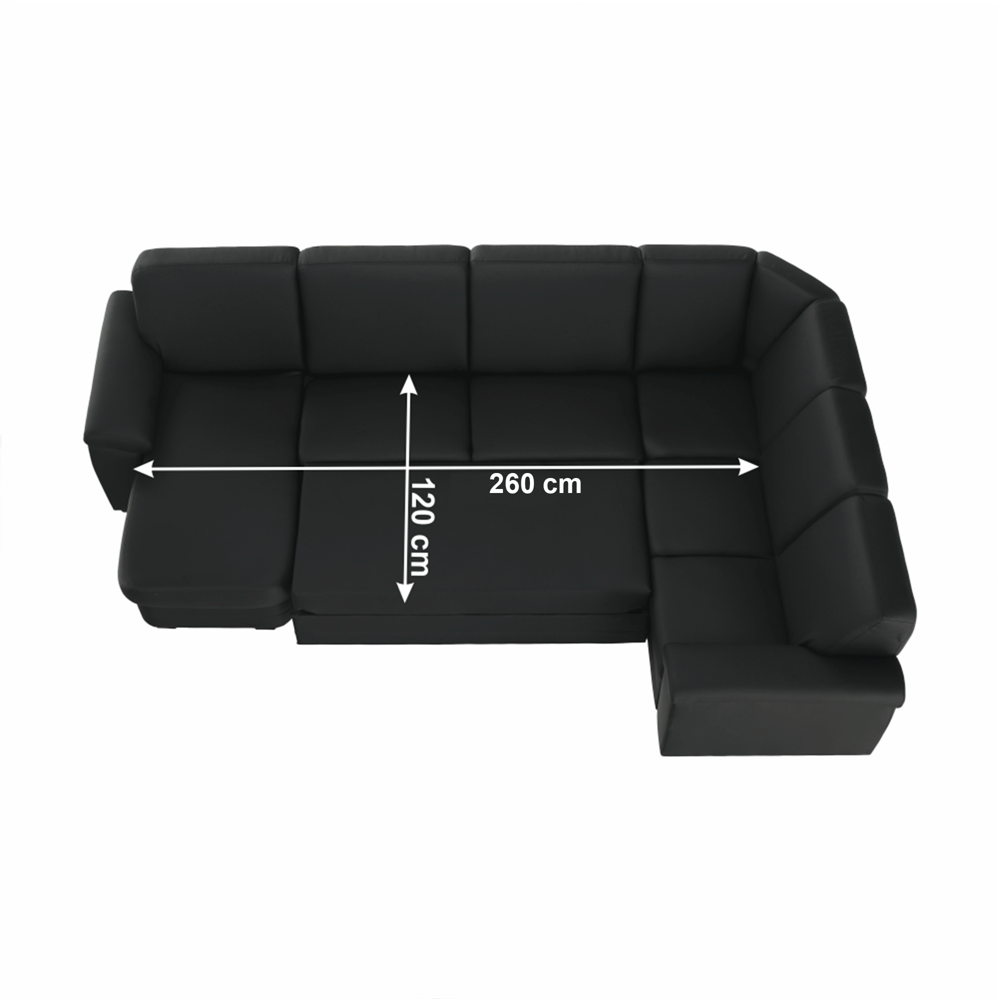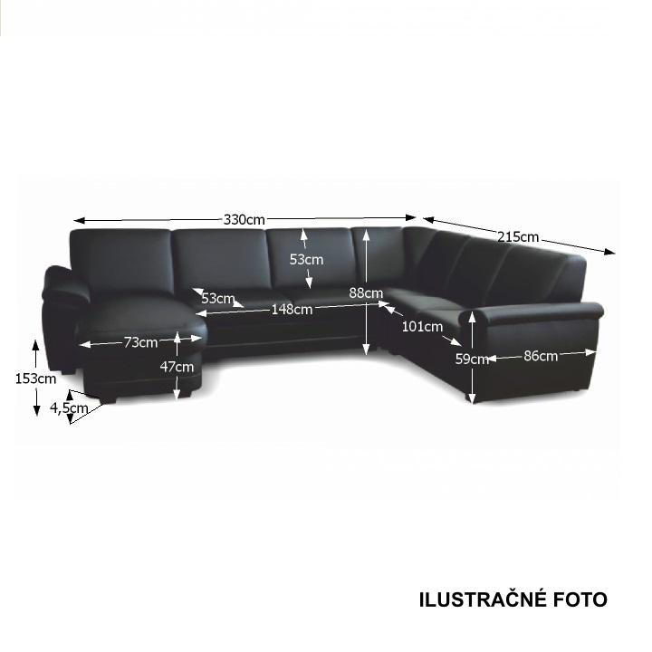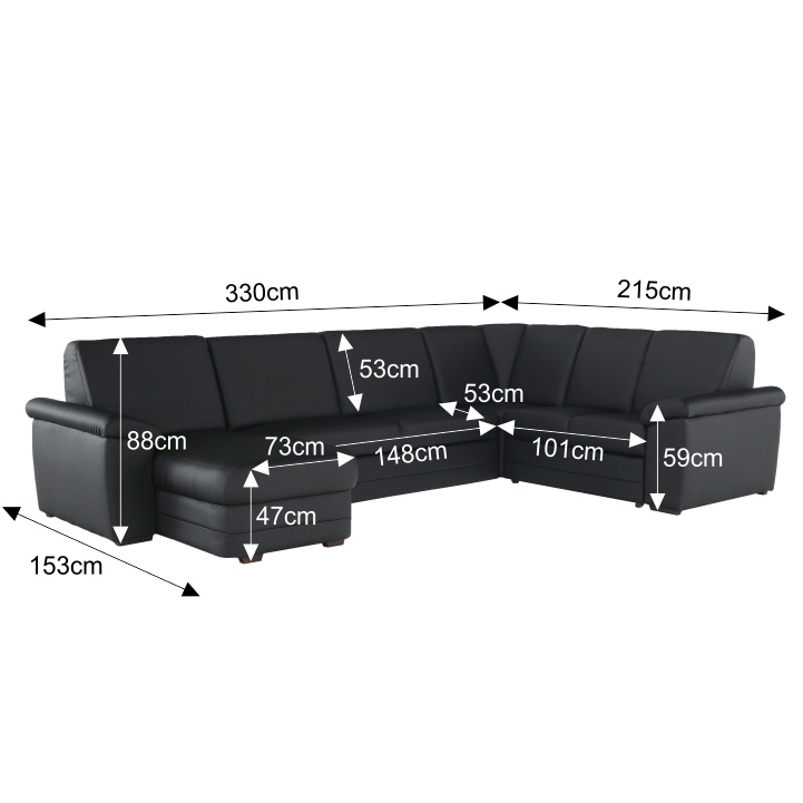 Materiál: ekokůže Oděruodolnost textilie podle testu Martindale: 100 000 oděrů Barva: černá Rozměry (ŠxHxV): 330x215/153x88 Plocha na spaní (ŠxD): 120x260 cm Výška sedu: 47 cm Hloubka sedu: 53 cm Šířka volného prostoru mezi otomany: 148 cm Výška spodního prostoru od podlahy: 3 cm Možnost poskládat vlastní rozměr Pružinová výplň Ve tvaru U Levé provedení Rozkládací S úložným prostorem Dodávána v demontu
