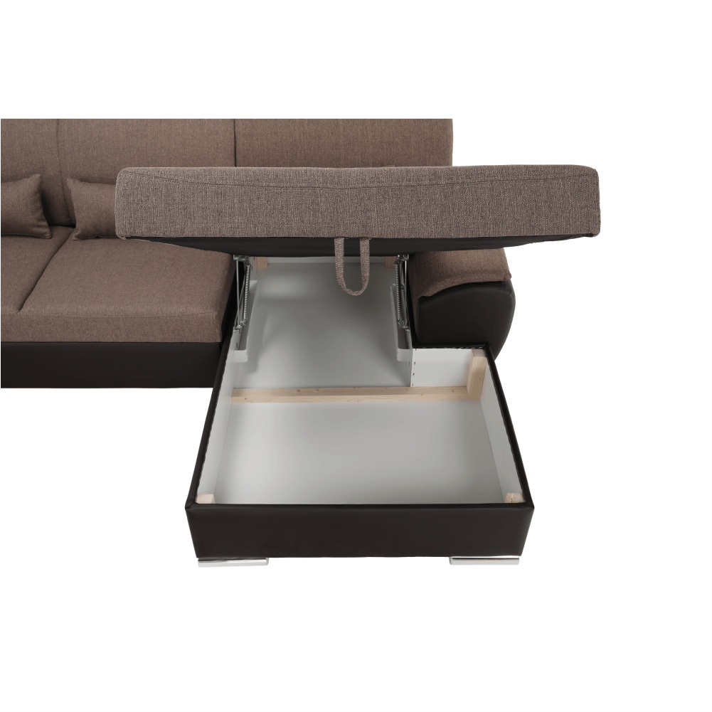 ;"Celočalouněná rozkládací sedací souprava EMILY U s úložným prostorem. levé provedení. Materiál: ekokůže hnědá / látka Portland 24 hnědá. Oděruodolnost textilie Portland podle testu Martindale: 52 000 oděrek Oděruodolnost ekokůže podle testu Martindale: 100 000 oděrek Rozměry (ŠxVxH): 343x83x272 / 174, plocha na spaní (DxŠ): 275x129 cm. Výška spodního prostoru od podlahy: 5 cm Nosnost na osobu: 90 kg Možnost objednání v 4 barevných odstínech ekokůže a v 6 barevných odstínech látky Portland v ceně: 42.190 Kč. Dostupná v kombinaci látka + ekokůže nebo celá v látce. Při individuální objednávce je třeba zaplatit 20% zálohu z dané částky. Po uhrazení zálohy bude Vaša objednávka zadána do výroby. Dodací lhůta 6-8 týdnů.