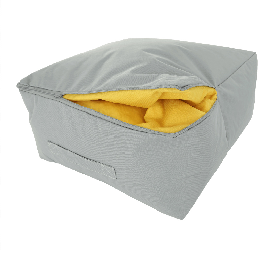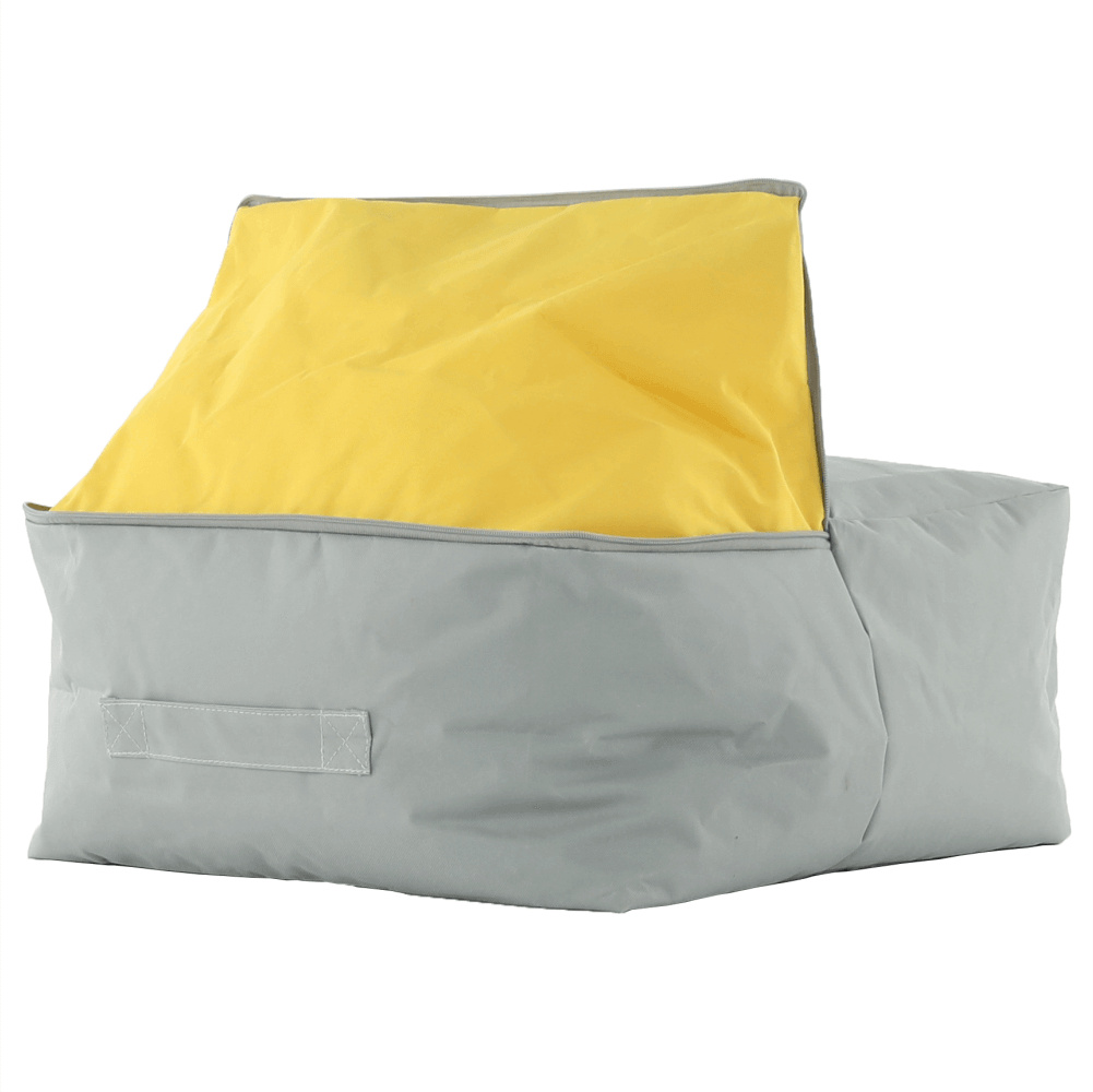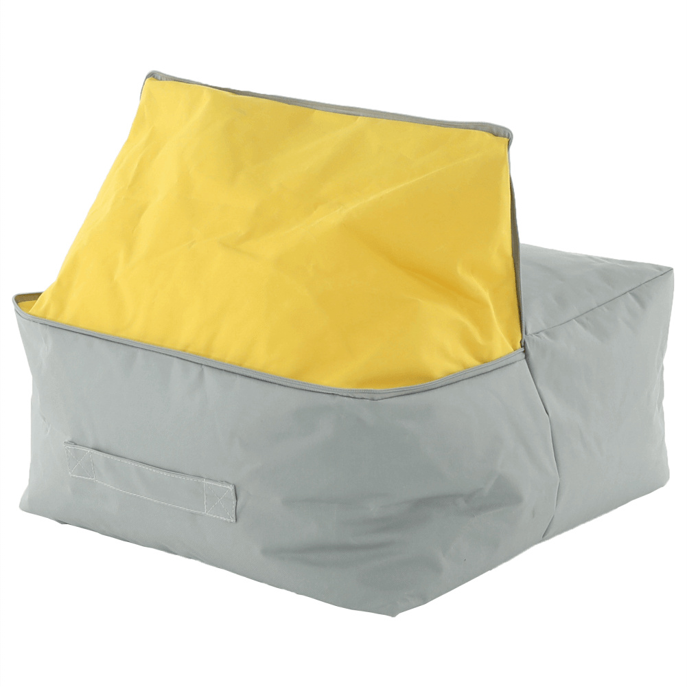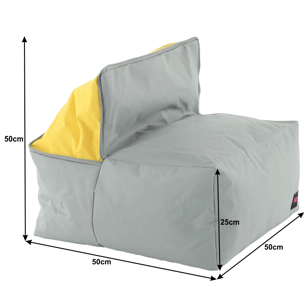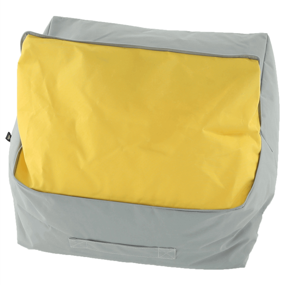 Sedací vak ALIMOR Materiál: látka / EPS (polystyrenové kuličky) Oděruodolnost textilie podle testu Martindale: 90 000 oděrek Provedení: šedá / zelená/žlutá Rozměry (ŠxHxV): 50x50x25 cm Nosnost: 100 kg Dodávané v demonte.