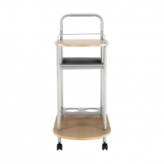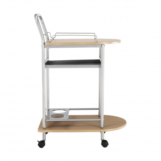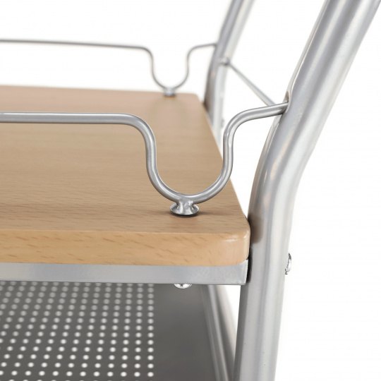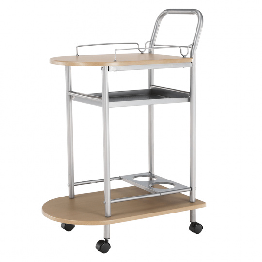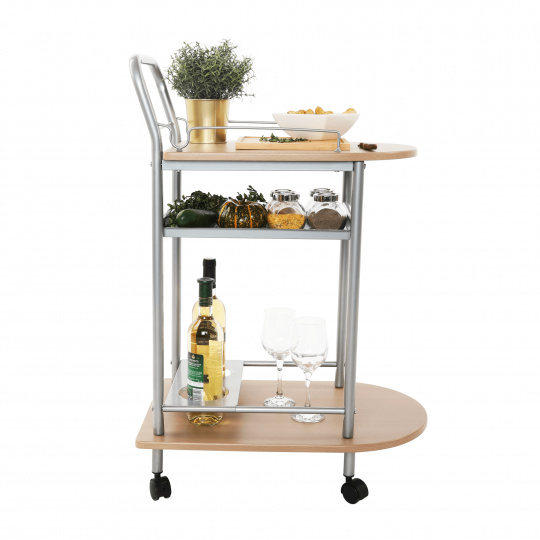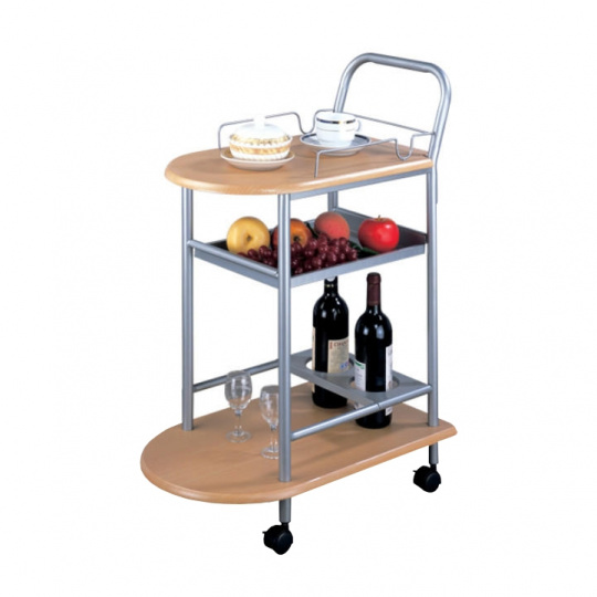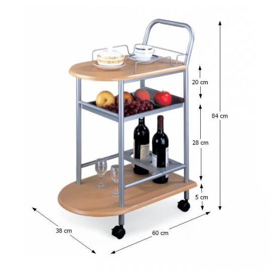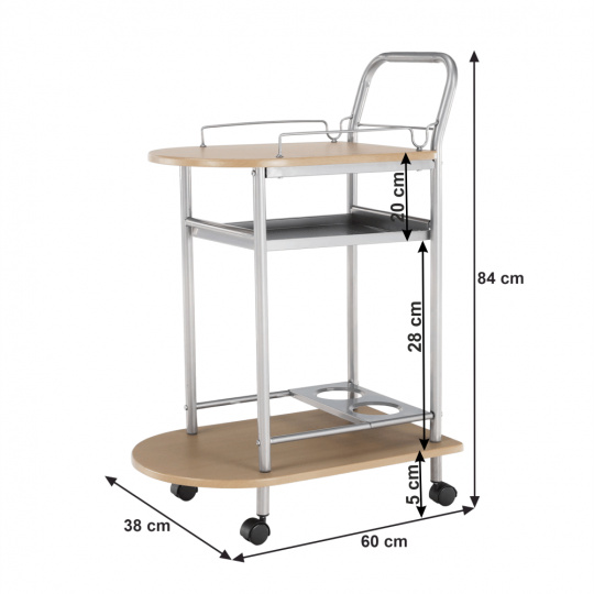 servírovací stolek, provedení: buk (MDF) + stříbrná (kov), rozměry (ŠxHxV): 60x38x84 cm Tloušťka materiálu: 15 mm, čtyři kolečka, dvě kolečka s brzdami. Dodáváno v demontu.