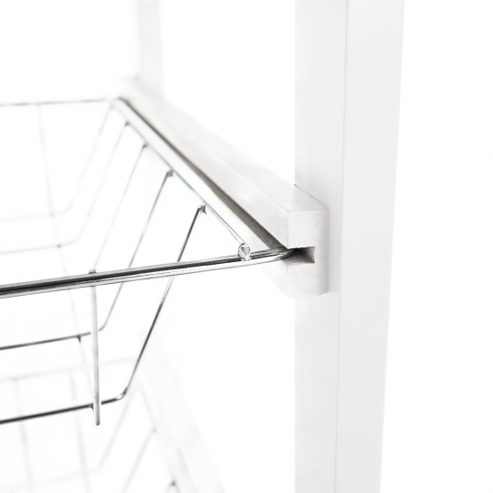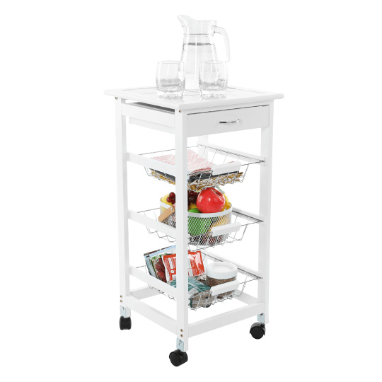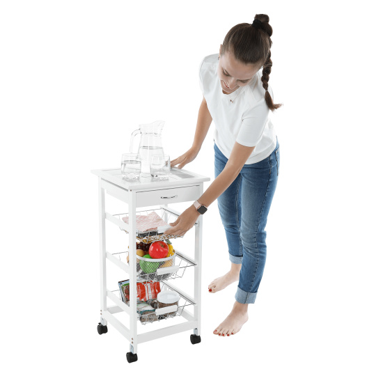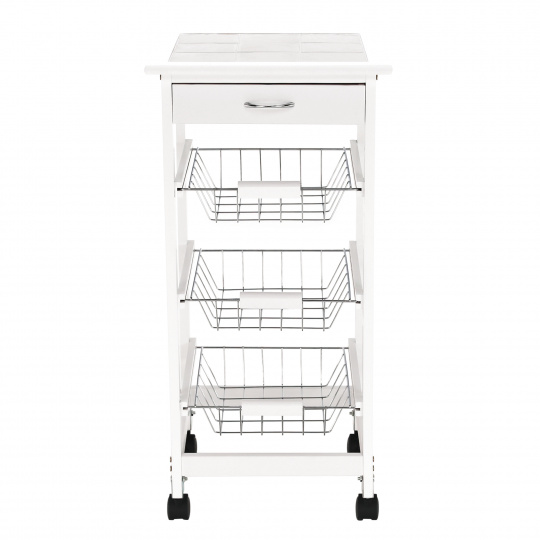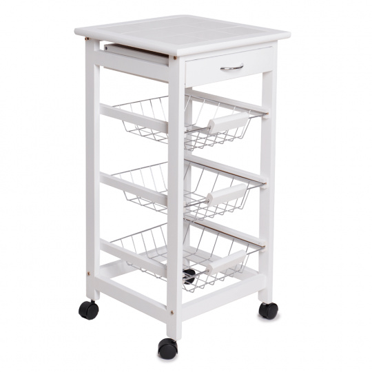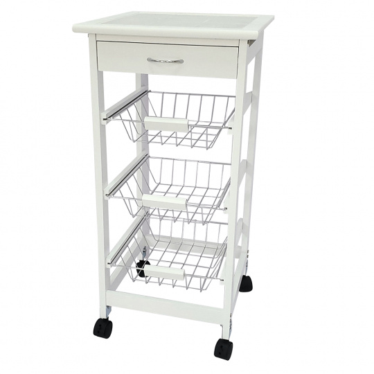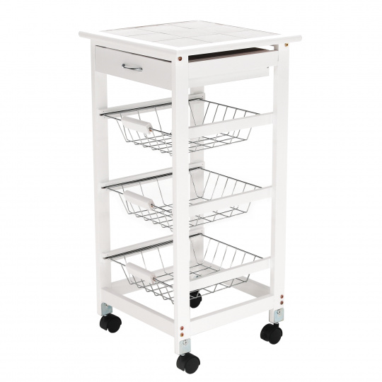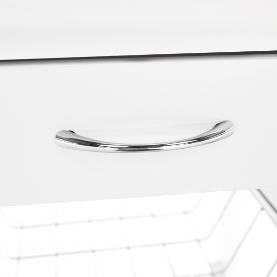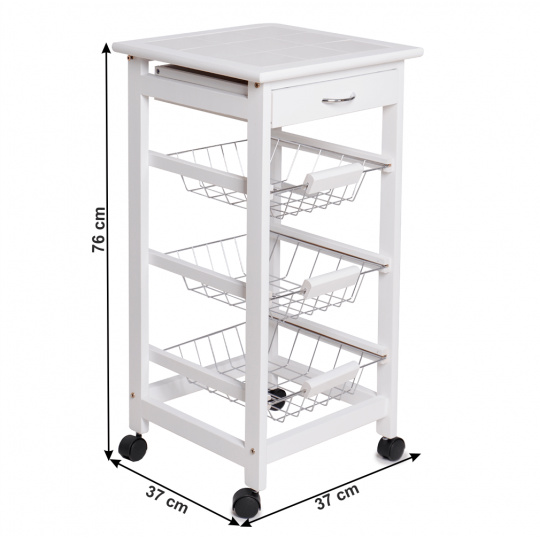 Materiál konstrukce: MDF Barva: bílá Materiál vrchní deska: MDF / keramika Barva: bílá Materiál košíky: kov Rozměry (ŠxHxV): 37x37x76 cm Nosnost vrchní deska: 5 kg Nosnost chromový košík: 3 kg Nutnost rovnoměrného zatěžování S kolečky Se dvěma brzdami Tři kovové košíky Košíky se dají vybrat jedna zásuvka S úchytkami pojízdný Dodávané v demontu