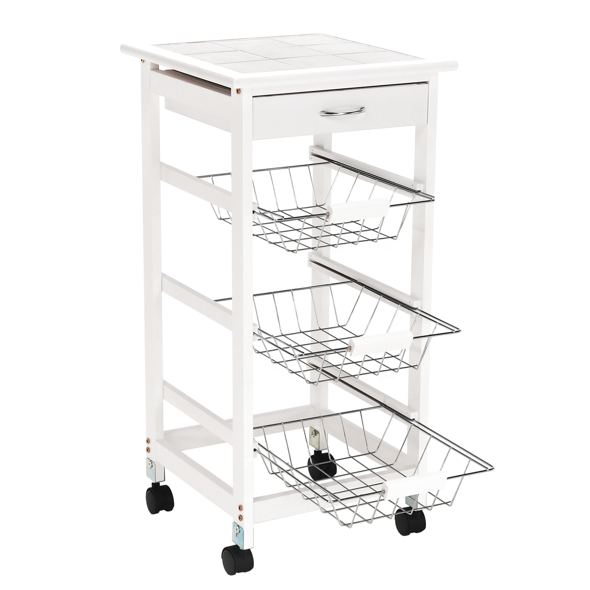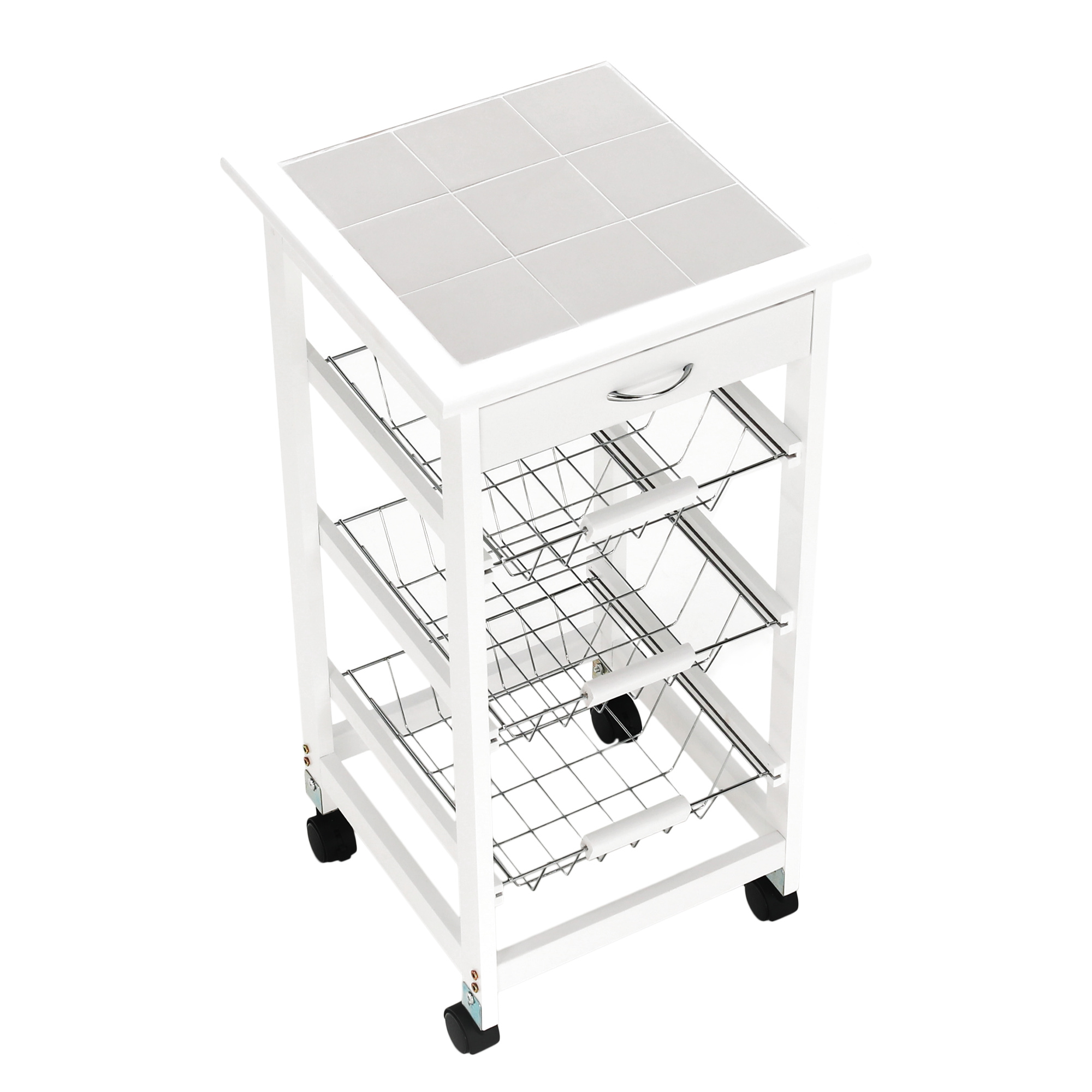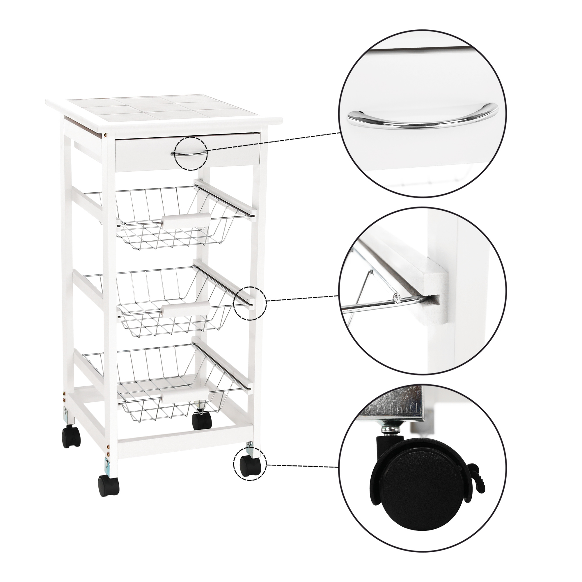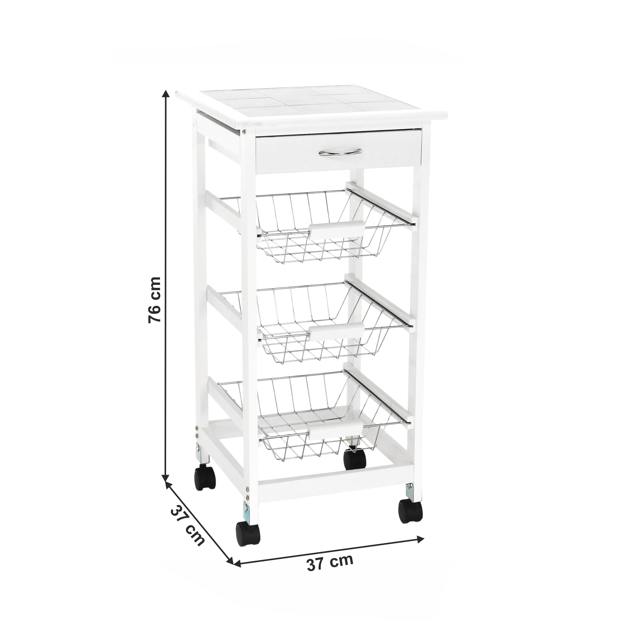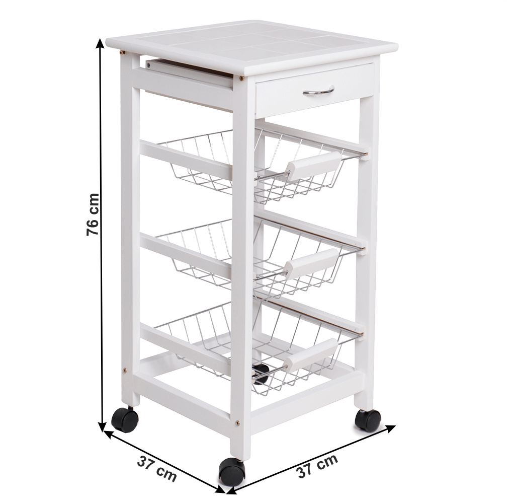 Materiál konstrukce: MDF Barva: bílá Materiál vrchní deska: MDF / keramika Barva: bílá Materiál košíky: kov Rozměry (ŠxHxV): 37x37x76 cm Nosnost vrchní deska: 5 kg Nosnost chromový košík: 3 kg Nutnost rovnoměrného zatěžování S kolečky Se dvěma brzdami Tři kovové košíky Košíky se dají vybrat jedna zásuvka S úchytkami pojízdný Dodávané v demontu