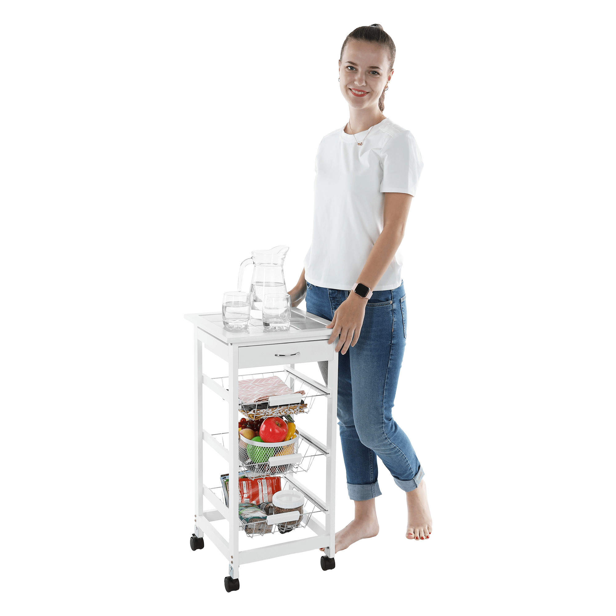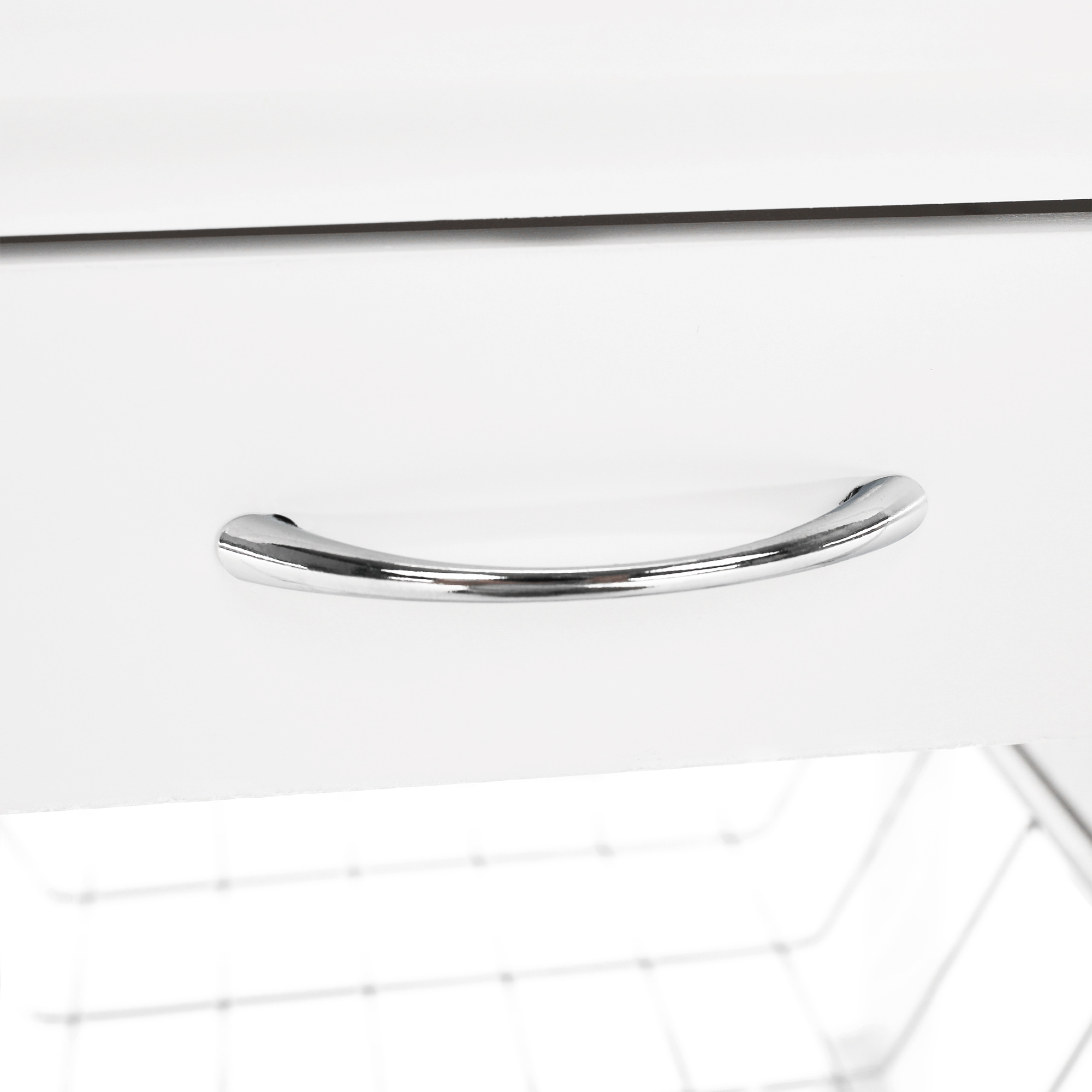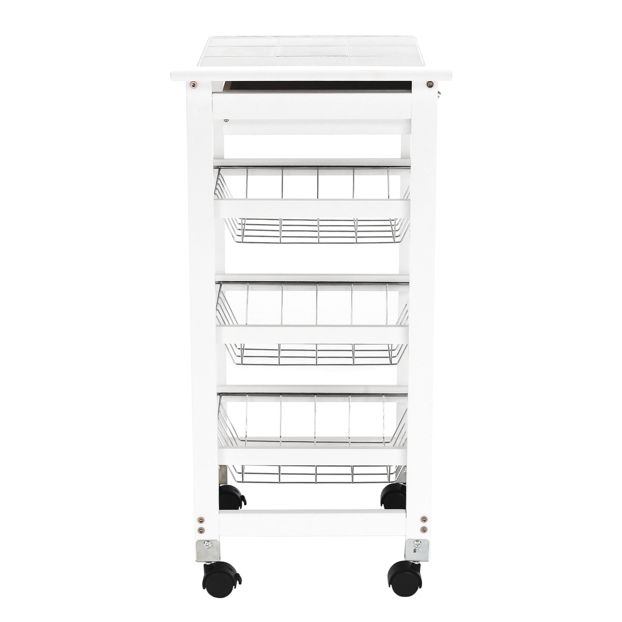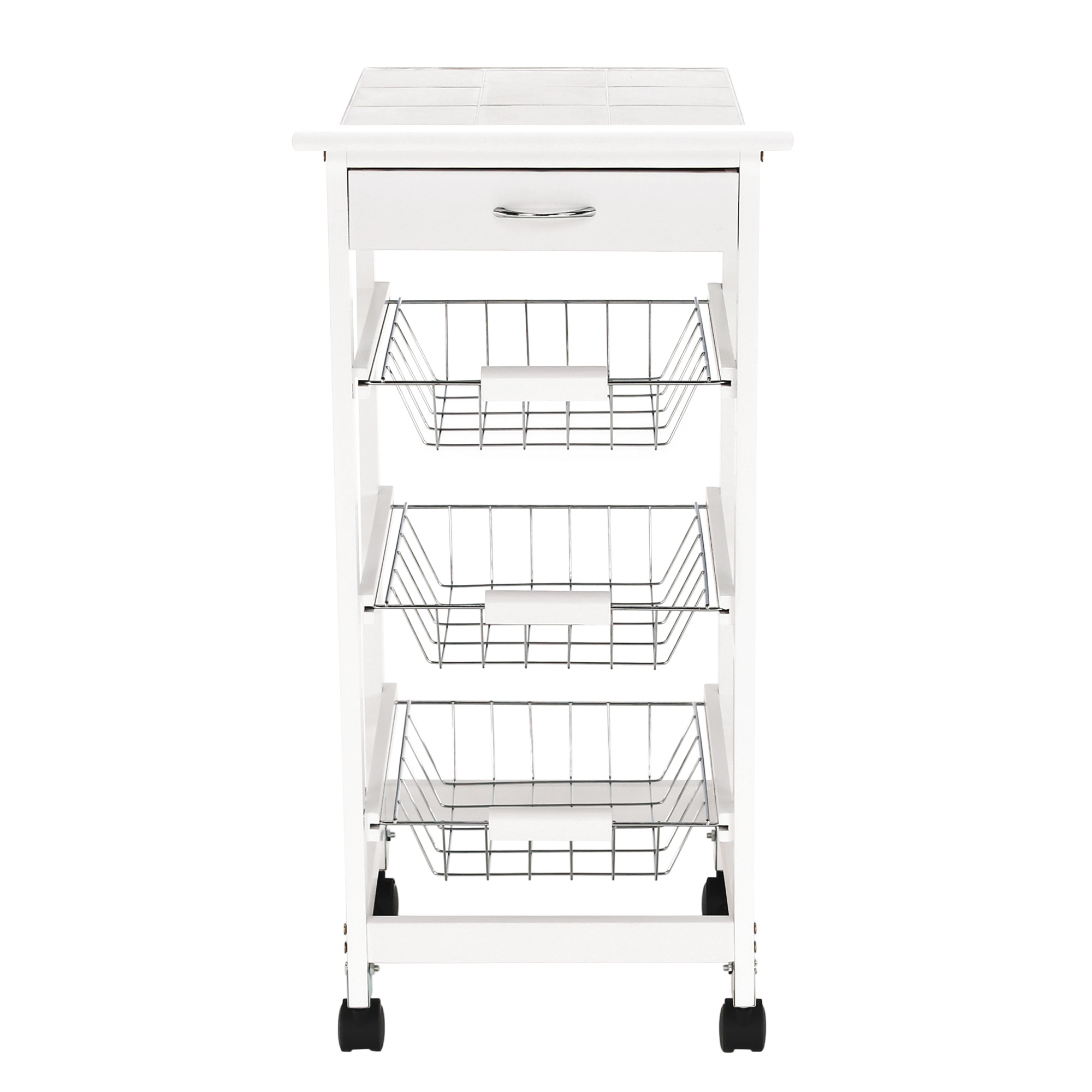 Materiál konstrukce: MDF Barva: bílá Materiál vrchní deska: MDF / keramika Barva: bílá Materiál košíky: kov Rozměry (ŠxHxV): 37x37x76 cm Nosnost vrchní deska: 5 kg Nosnost chromový košík: 3 kg Nutnost rovnoměrného zatěžování S kolečky Se dvěma brzdami Tři kovové košíky Košíky se dají vybrat jedna zásuvka S úchytkami pojízdný Dodávané v demontu