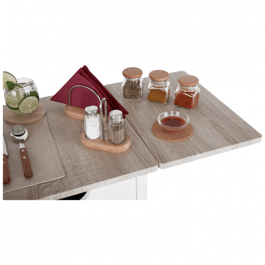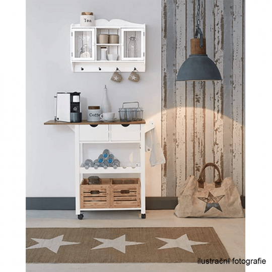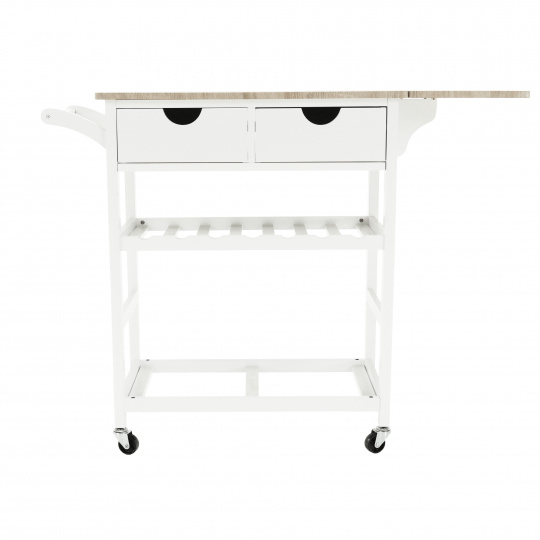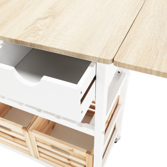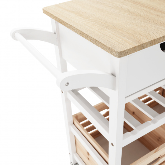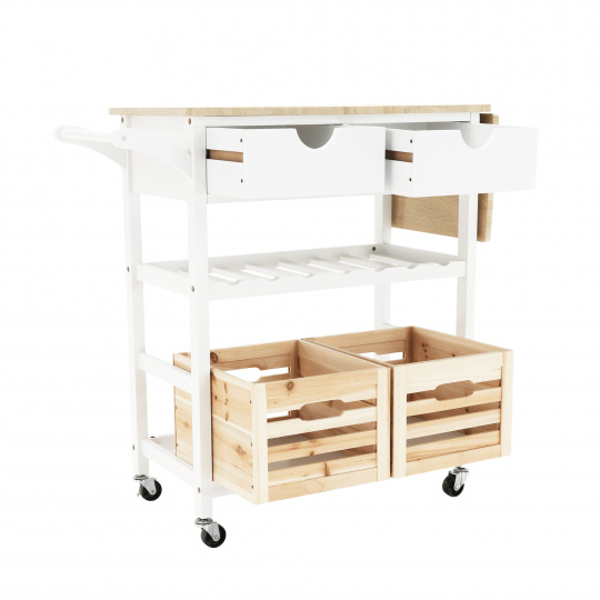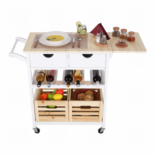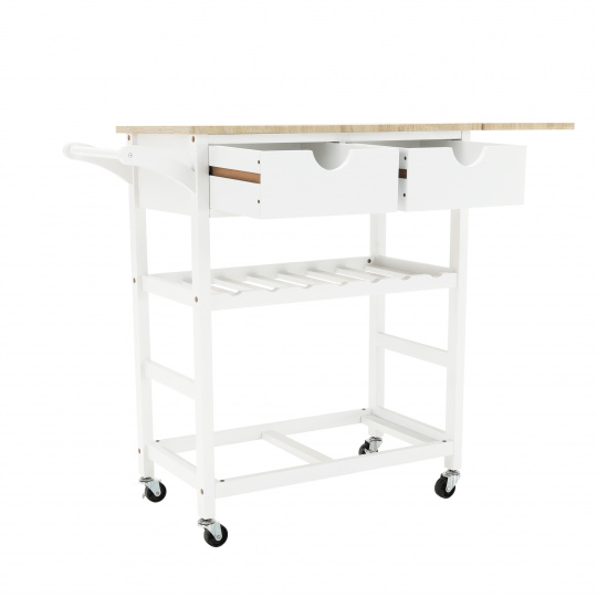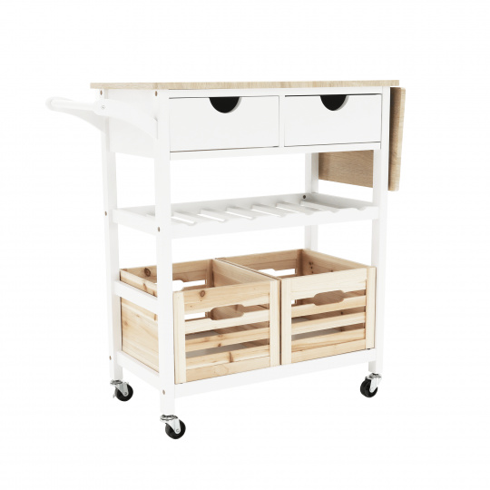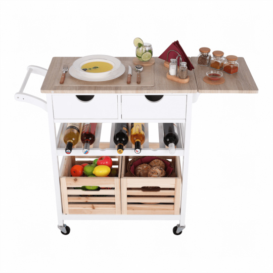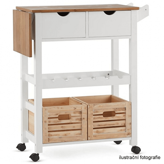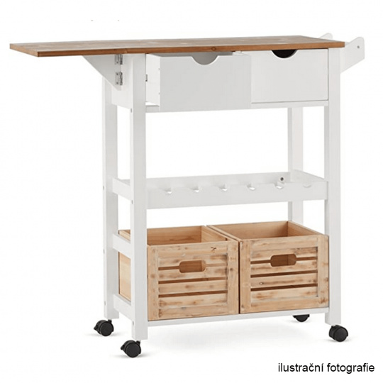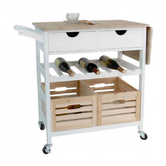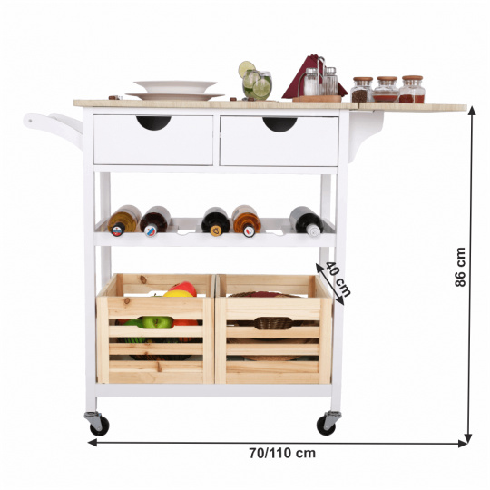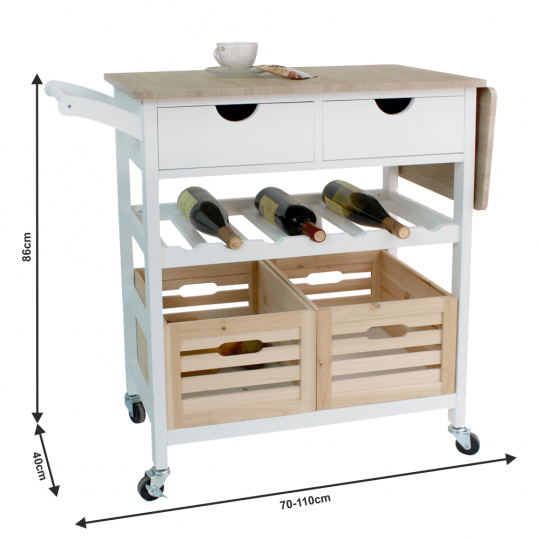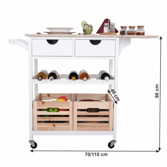 Materiál: MDF / PVC fólie / dřevo Barva: bílá / přírodní Rozměry (ŠxHxV): 70 / 110x40x86 cm Se sklápěcí pracovní deskou na kolečkách S madlem boku 2 šuplíky 2 košíky Košíky se dají vybrat Úložný prostor pro láhve moderní zpracování Dodávané v demontu