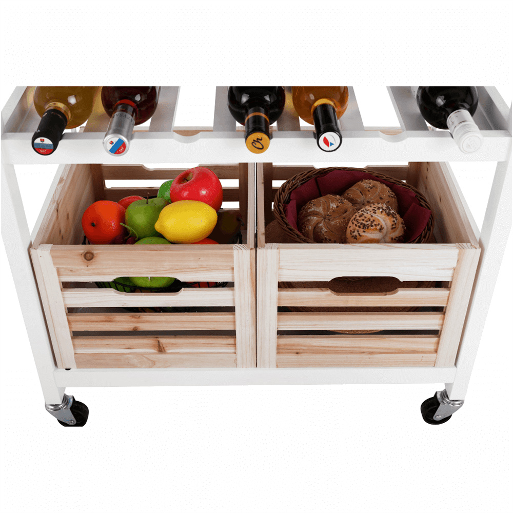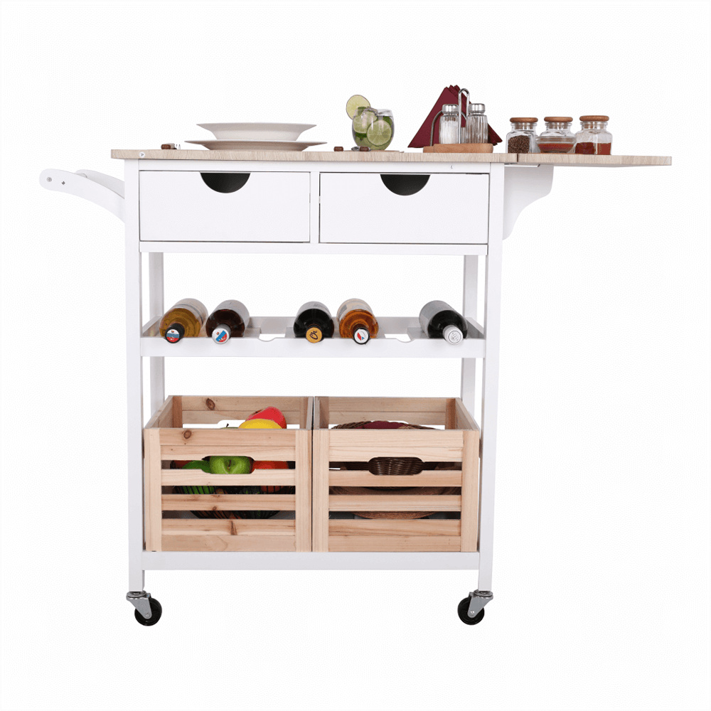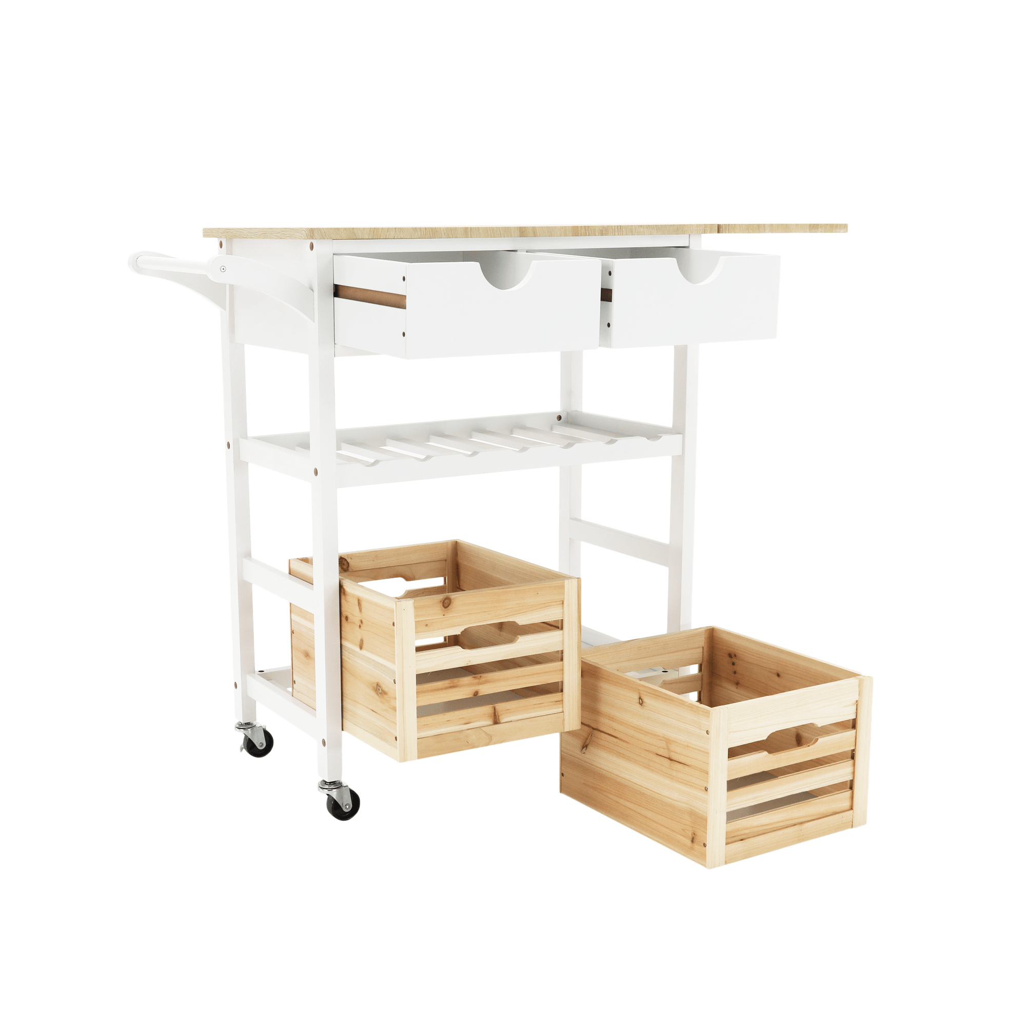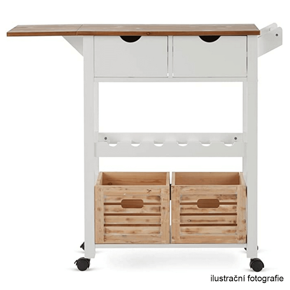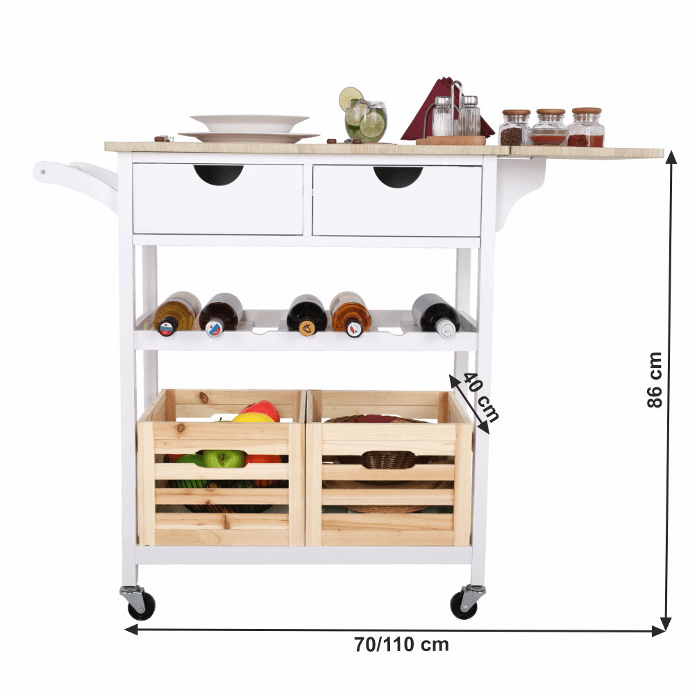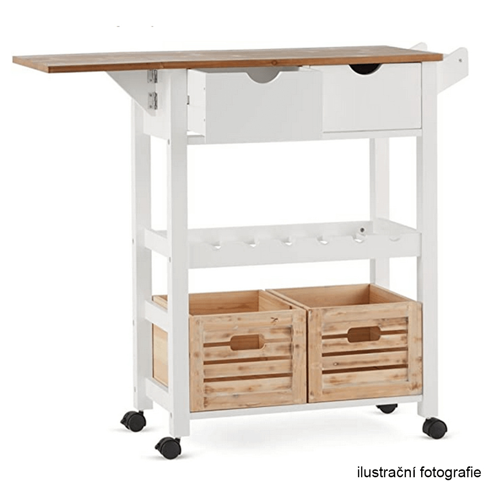 Materiál: MDF / PVC fólie / dřevo Barva: bílá / přírodní Rozměry (ŠxHxV): 70 / 110x40x86 cm Se sklápěcí pracovní deskou na kolečkách S madlem boku 2 šuplíky 2 košíky Košíky se dají vybrat Úložný prostor pro láhve moderní zpracování Dodávané v demontu