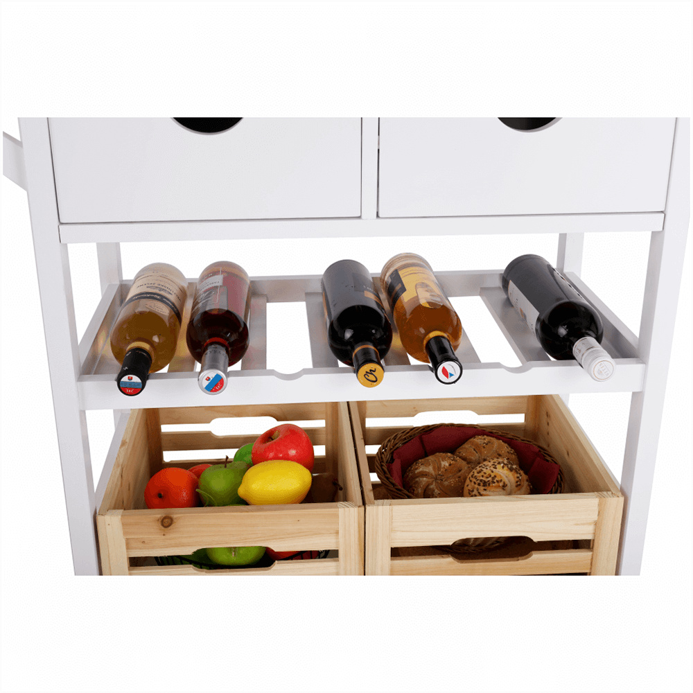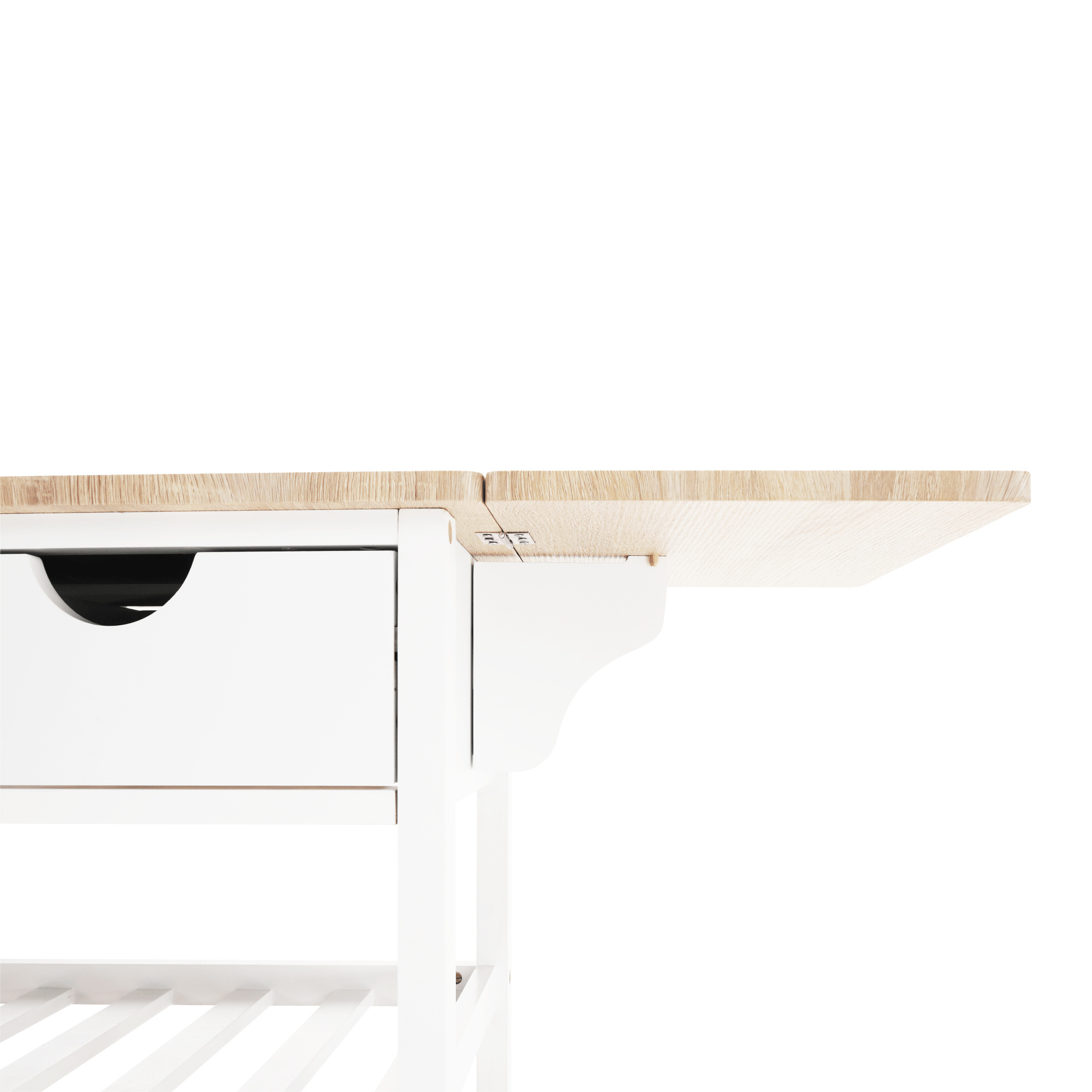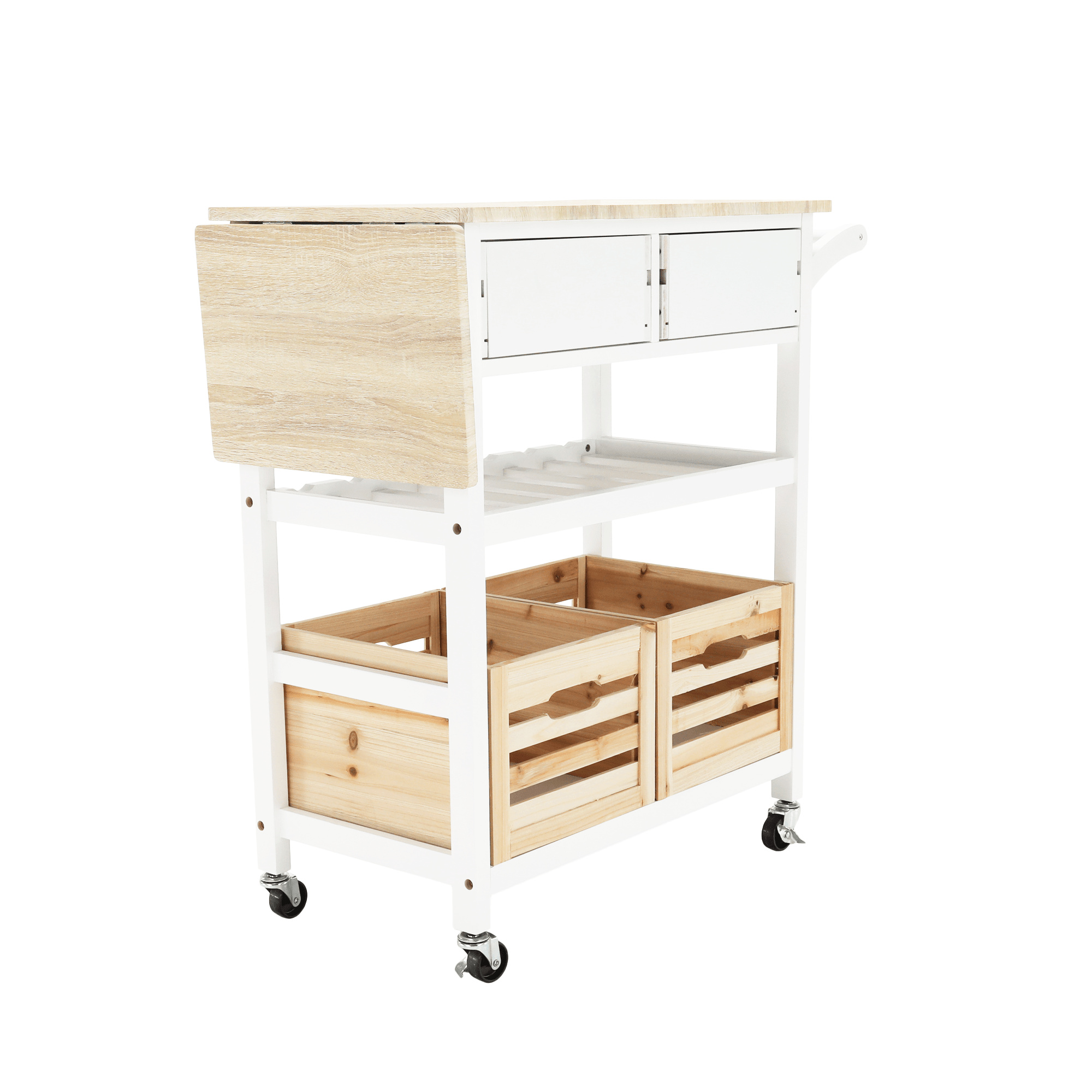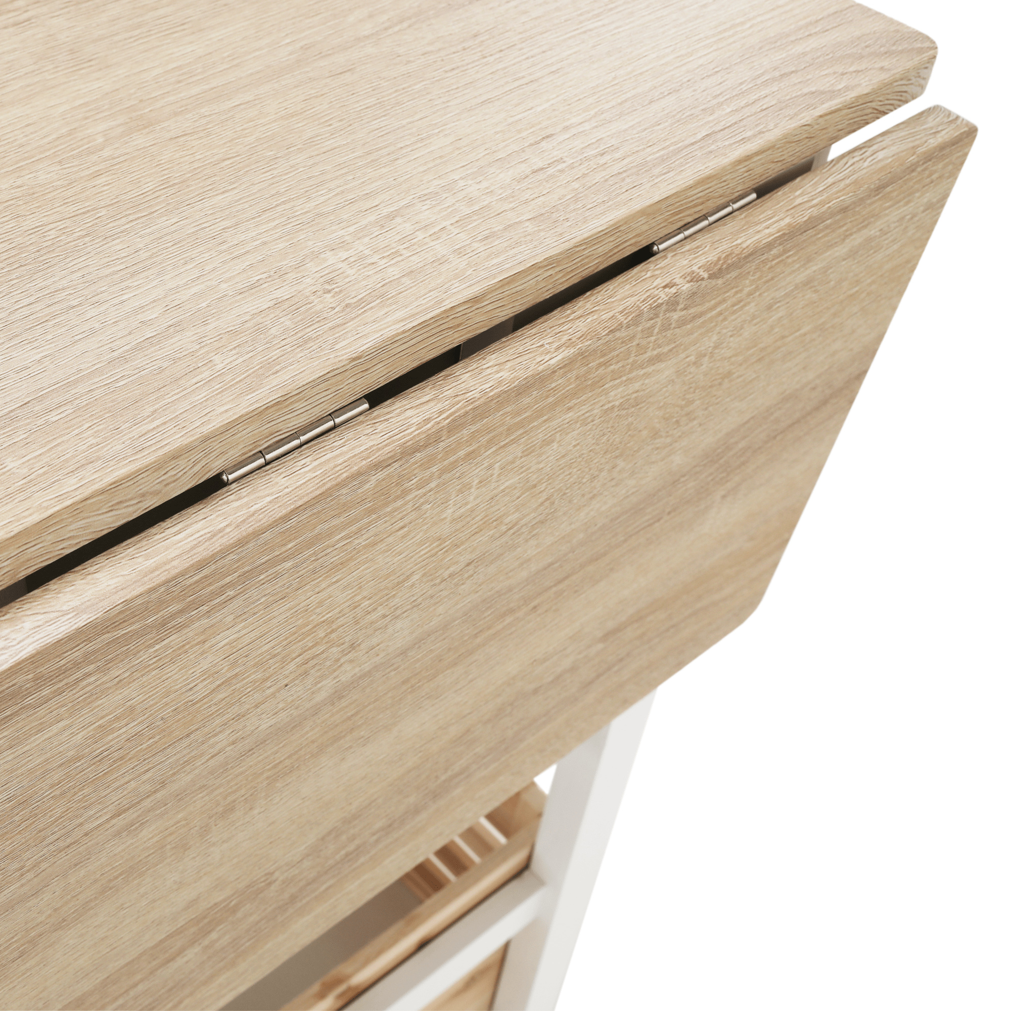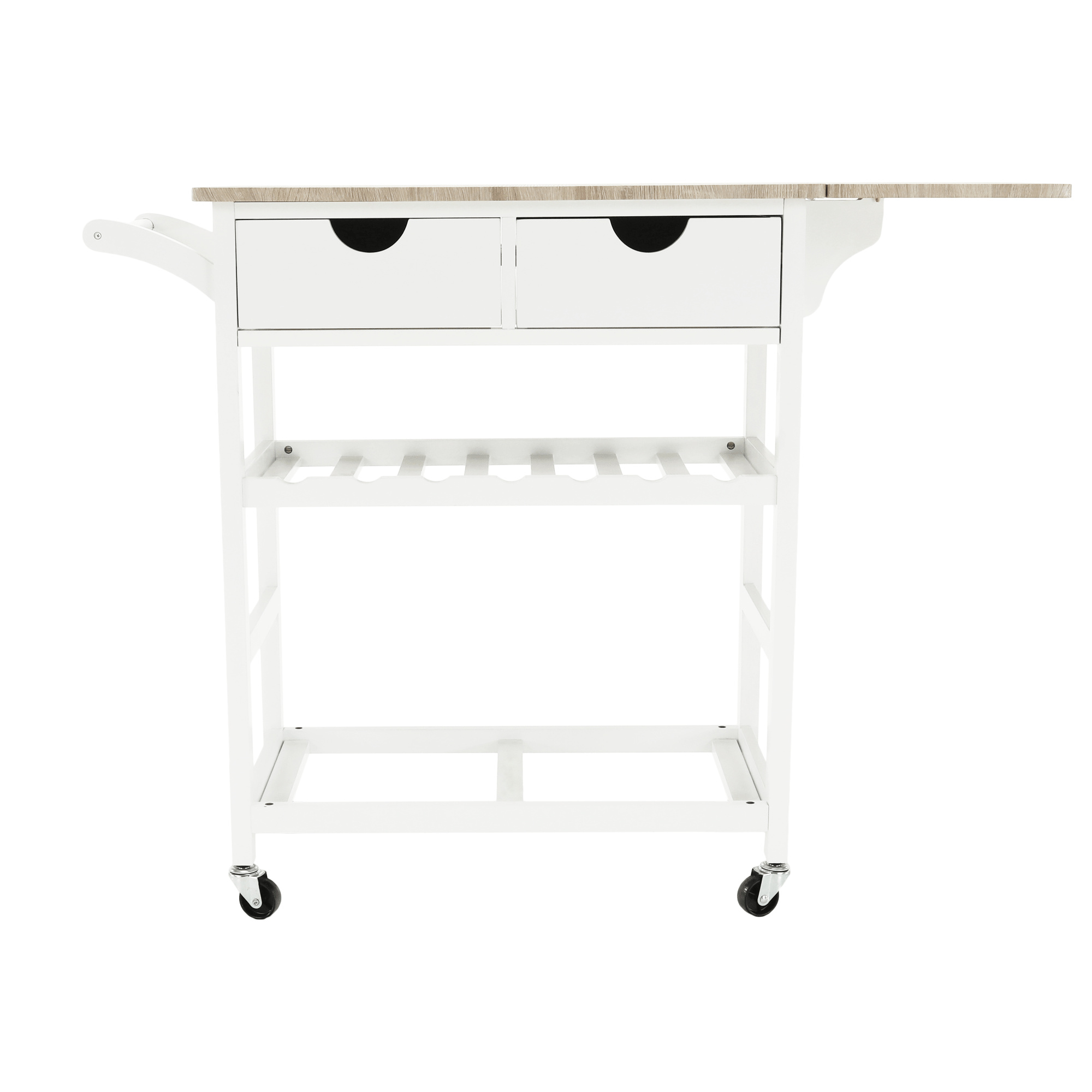 Materiál: MDF / PVC fólie / dřevo Barva: bílá / přírodní Rozměry (ŠxHxV): 70 / 110x40x86 cm Se sklápěcí pracovní deskou na kolečkách S madlem boku 2 šuplíky 2 košíky Košíky se dají vybrat Úložný prostor pro láhve moderní zpracování Dodávané v demontu