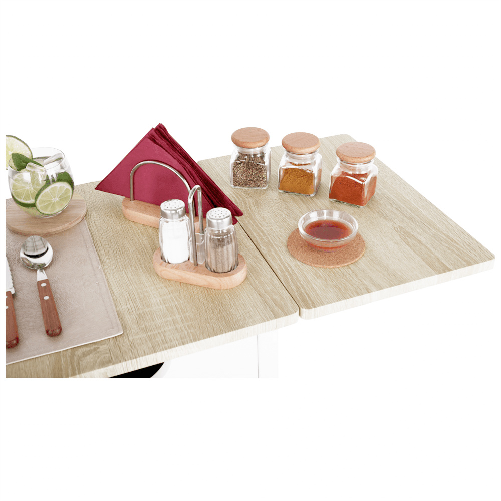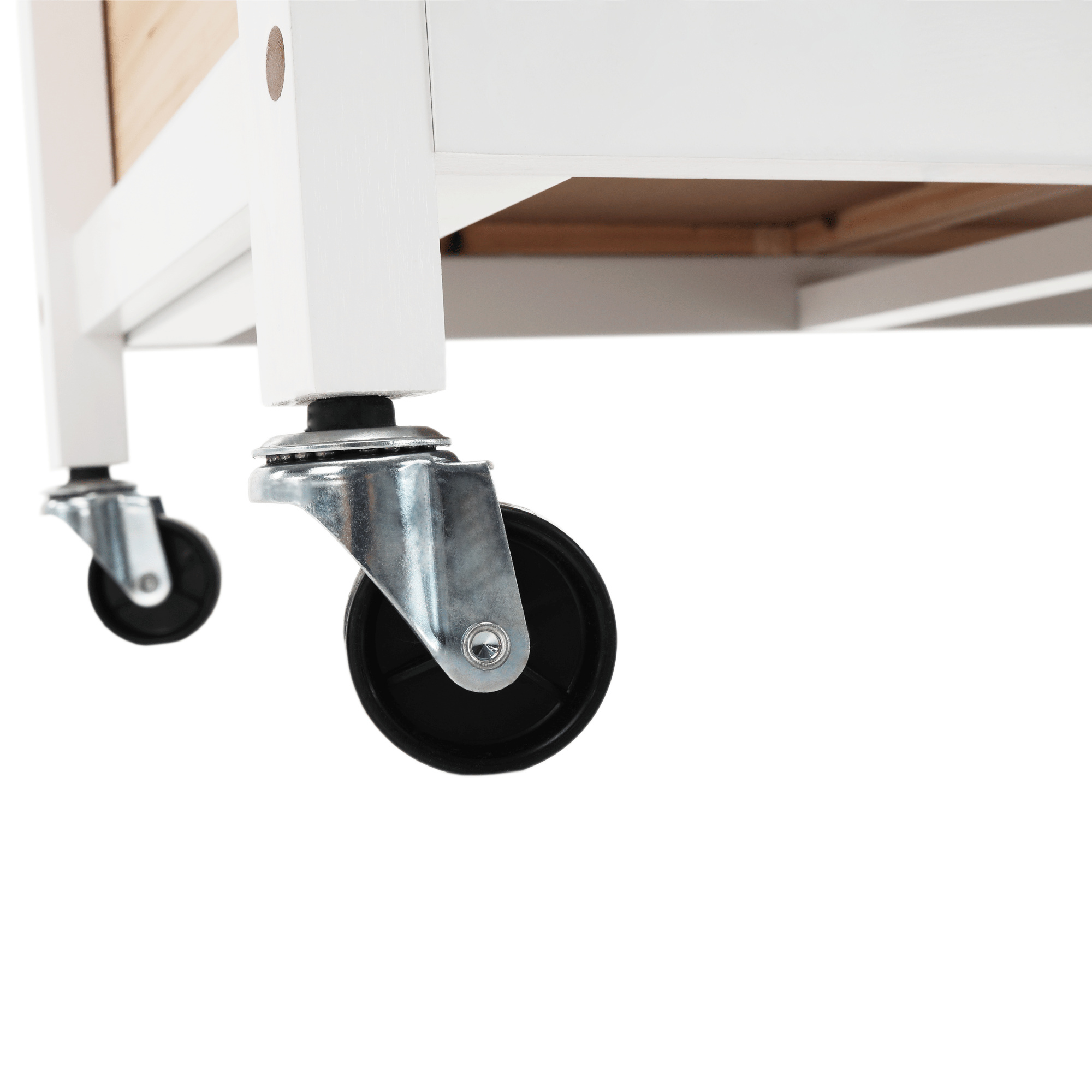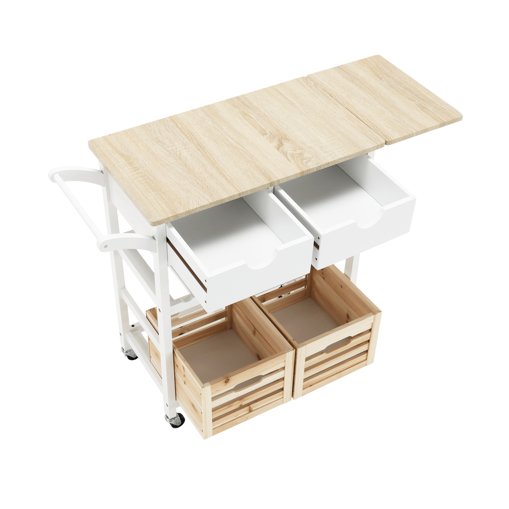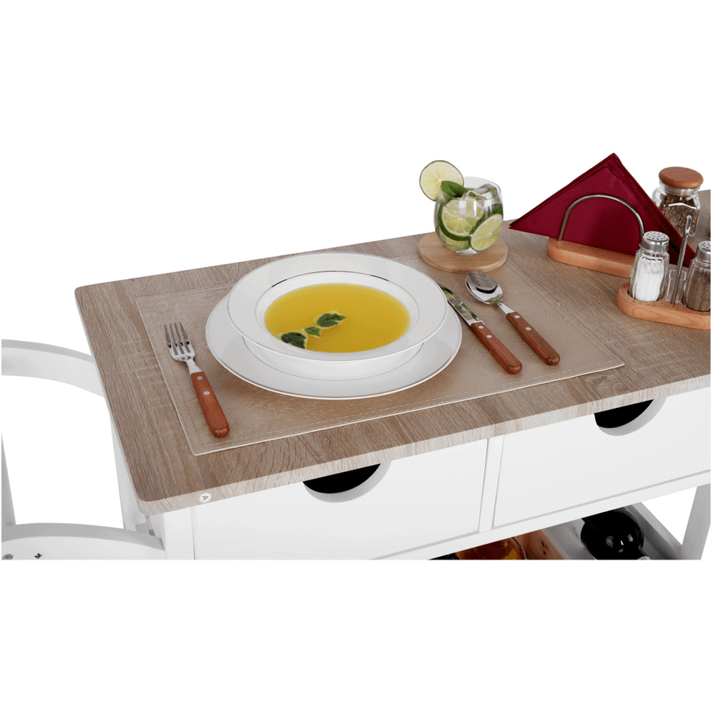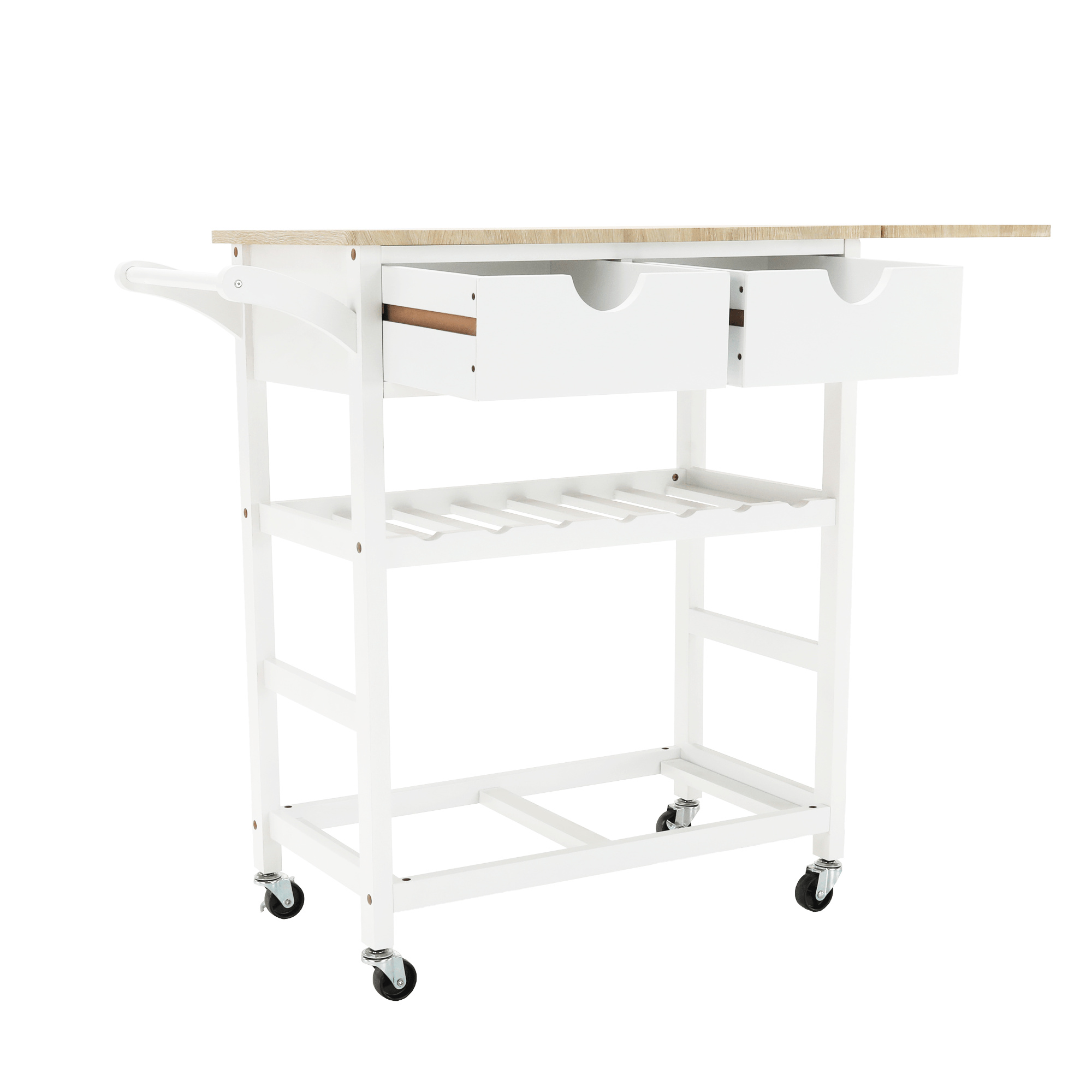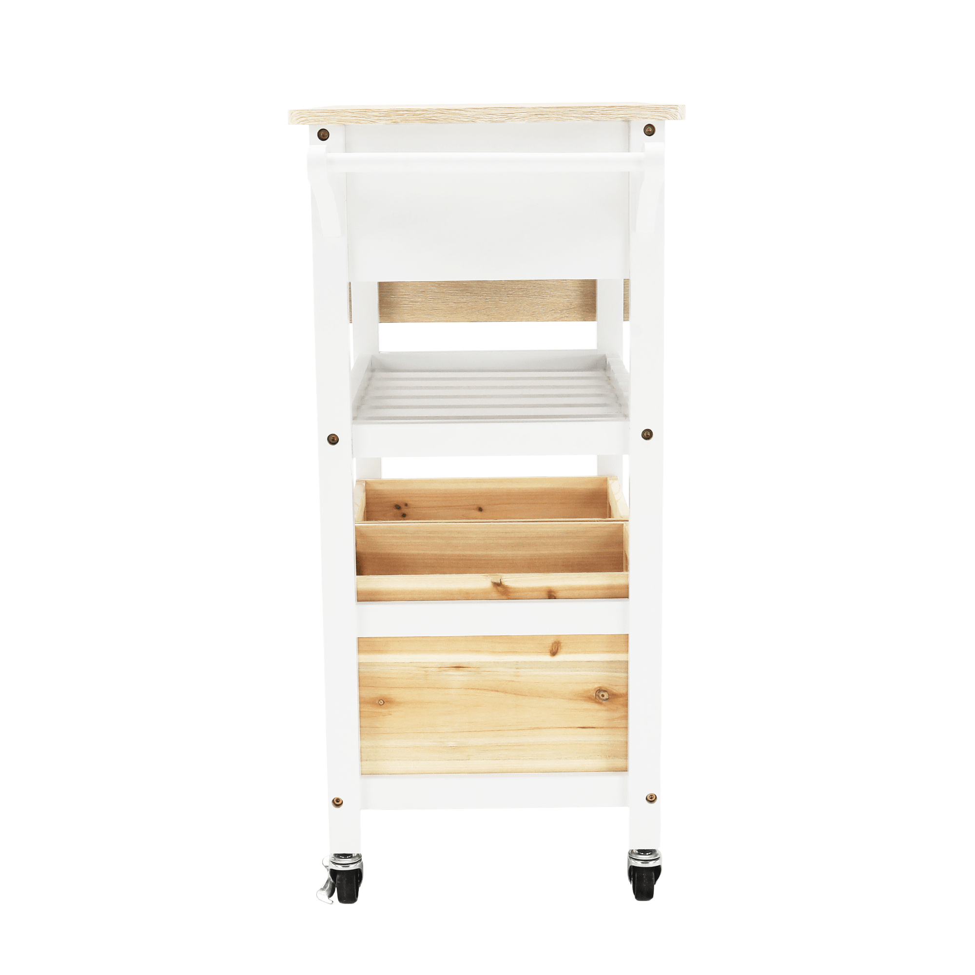 Materiál: MDF / PVC fólie / dřevo Barva: bílá / přírodní Rozměry (ŠxHxV): 70 / 110x40x86 cm Se sklápěcí pracovní deskou na kolečkách S madlem boku 2 šuplíky 2 košíky Košíky se dají vybrat Úložný prostor pro láhve moderní zpracování Dodávané v demontu