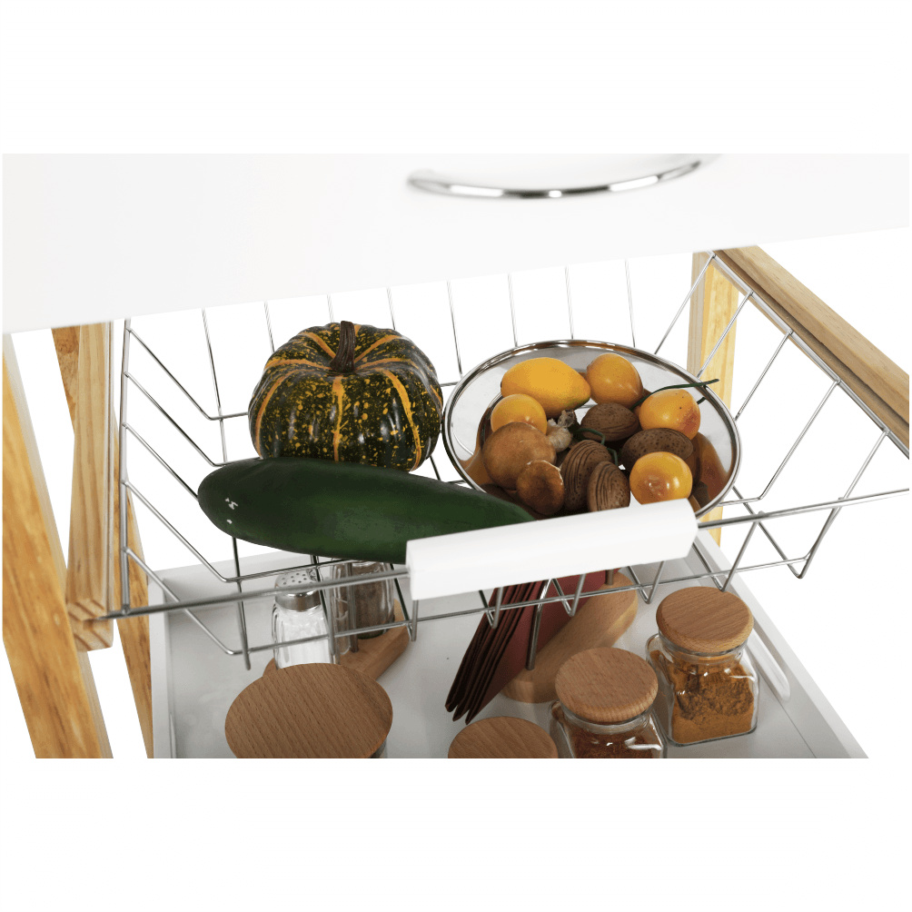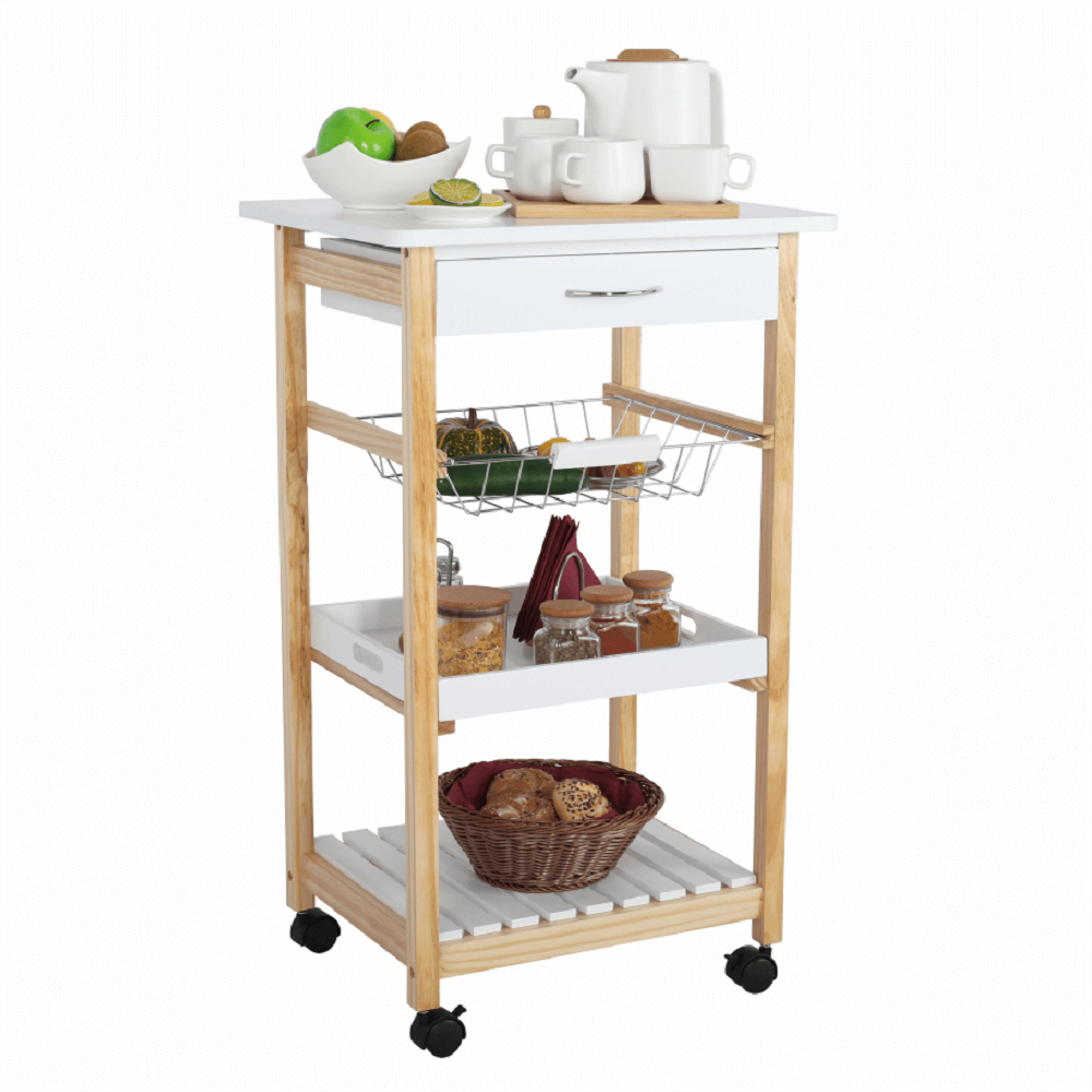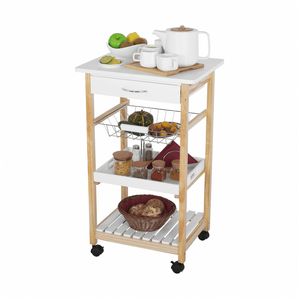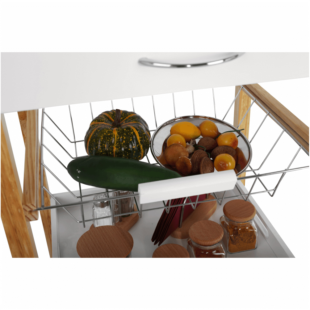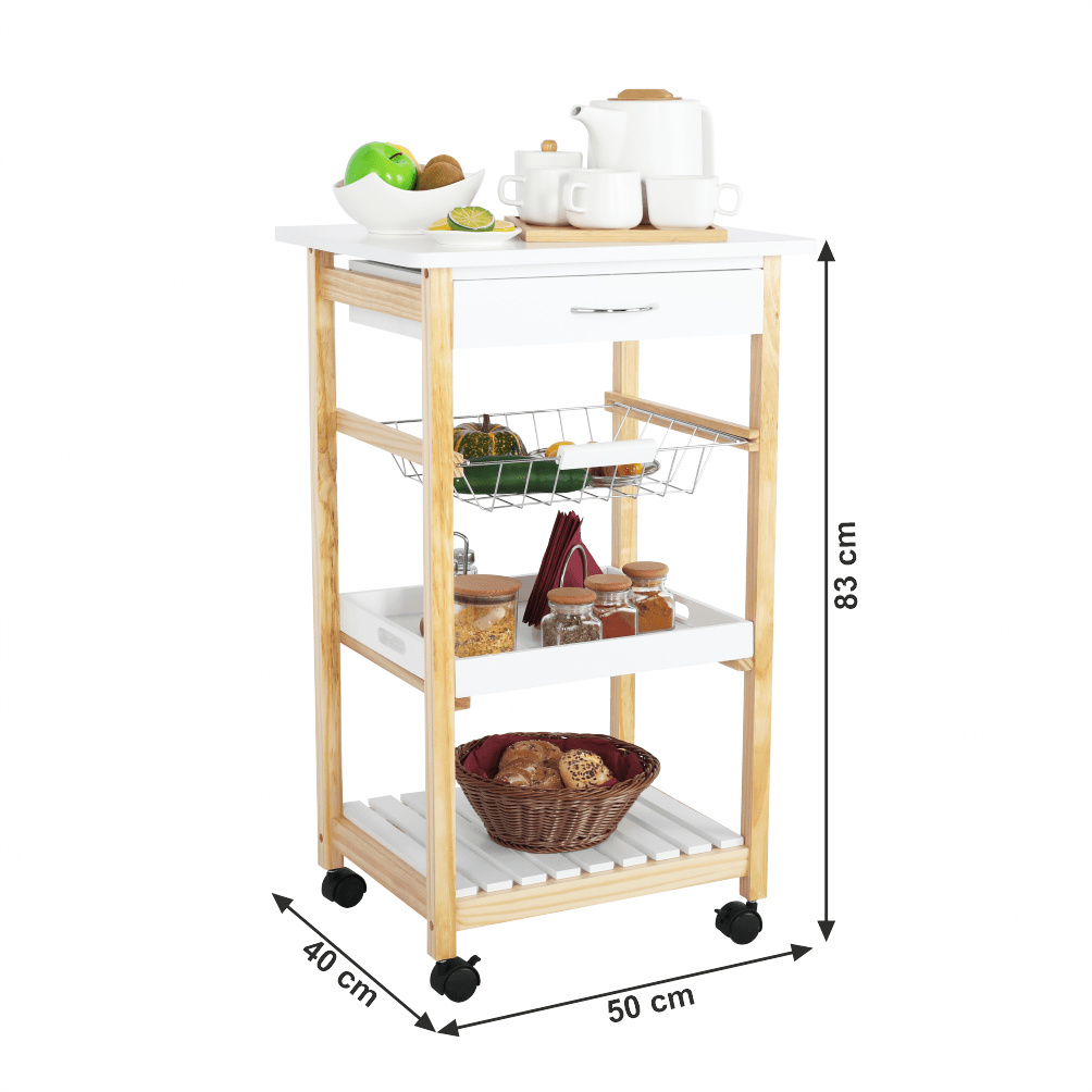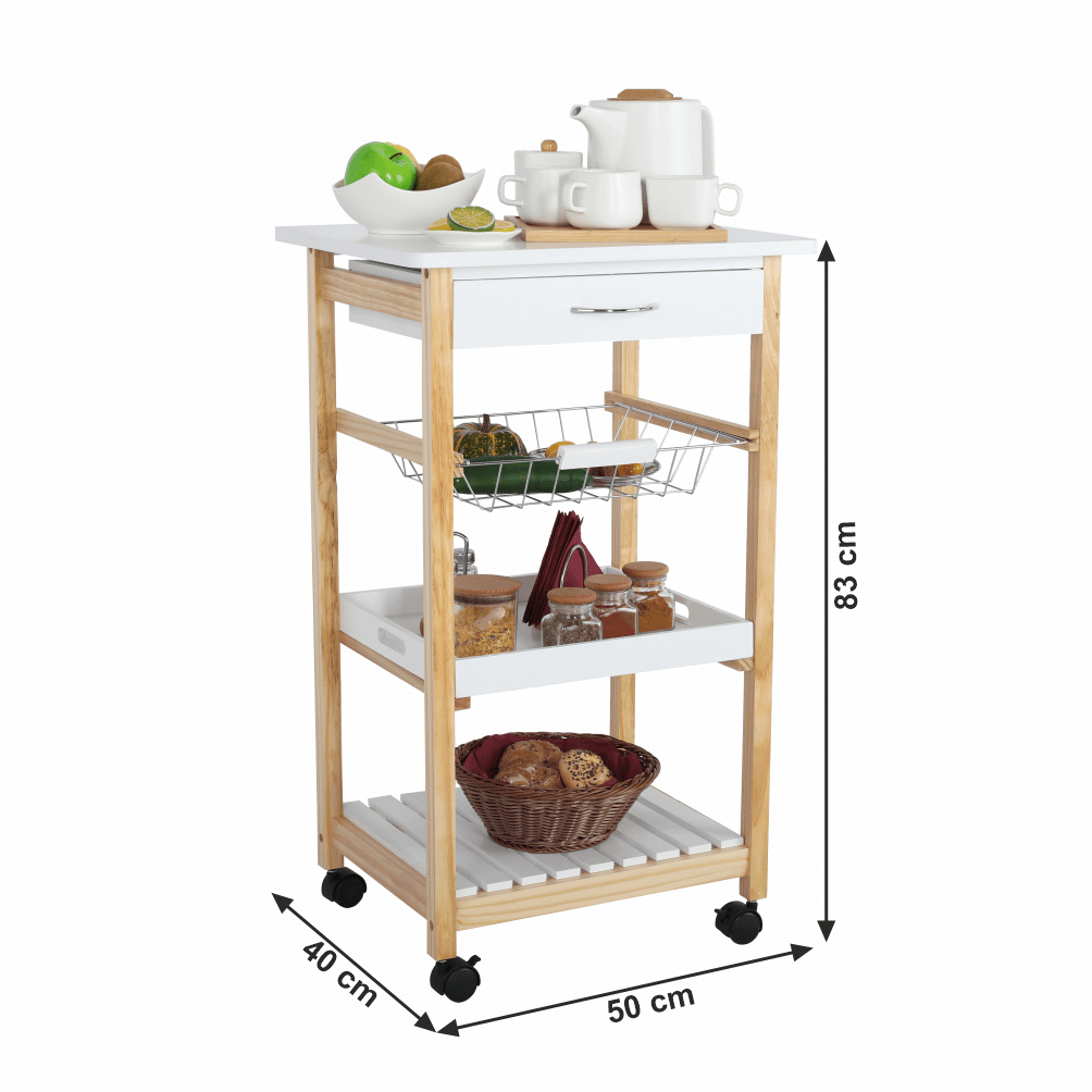 Materiál: MDF / borovicové dřevo Barva: bílá / přírodní Rozměry (ŠxHxV): 50x40x83 cm na kolečkách 2 brzdy šuplík police odnímatelná tácek kovový košík Košík víte vybrat moderní design Dodávané v demontu