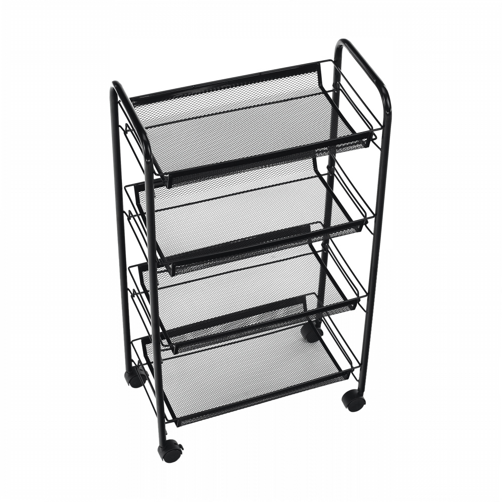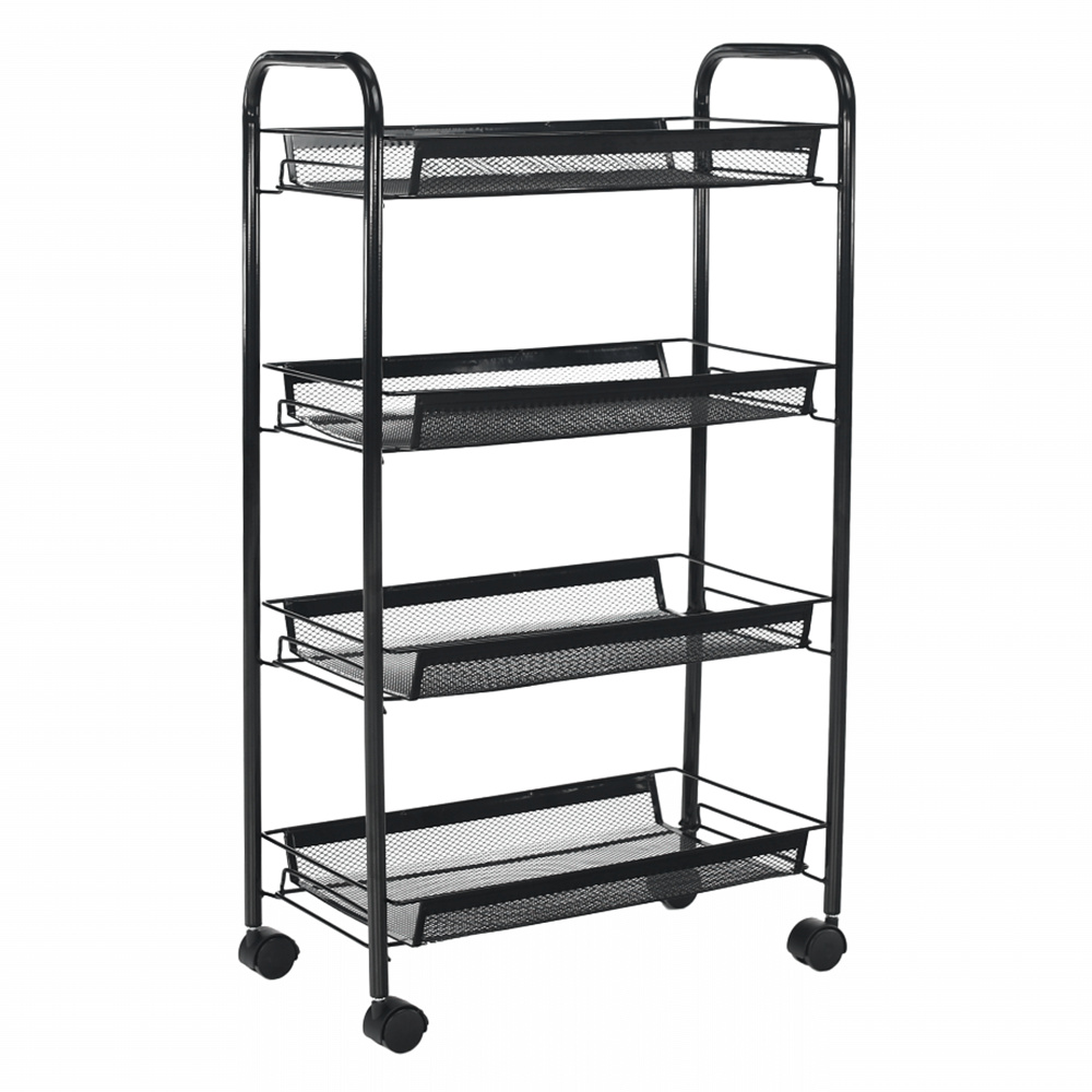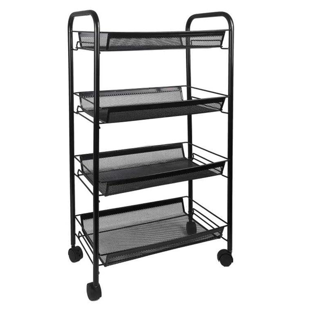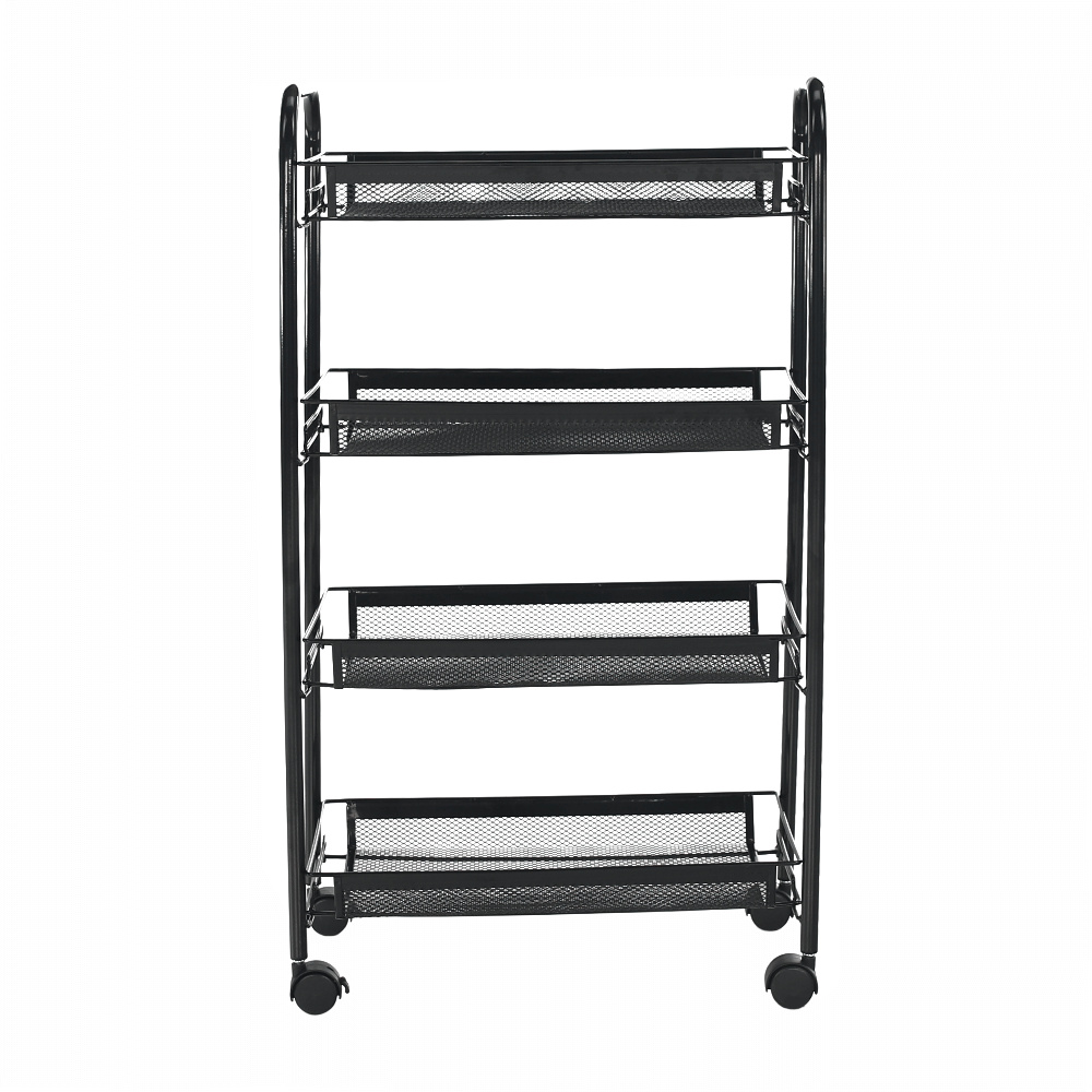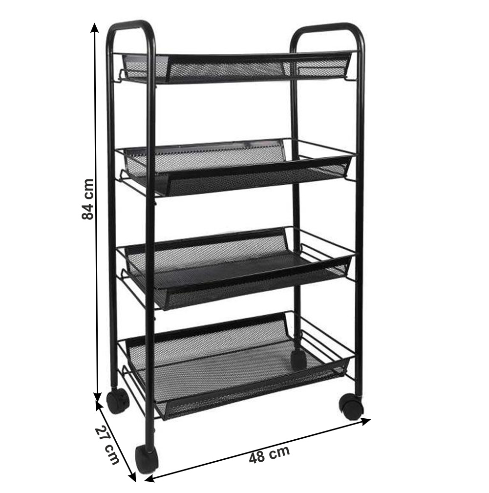Materiál: kov / plast Barva: černá Rozměry (ŠxHxV): 48x27x84 cm S kolečky plastové kolečka Dvě kolečka s brzdami čtyři police 4-patrový Nosnost: 35 kg moderní zpracování Na servírování občerstvení Využití najde v kterékoli místnosti Dodávané v demontu