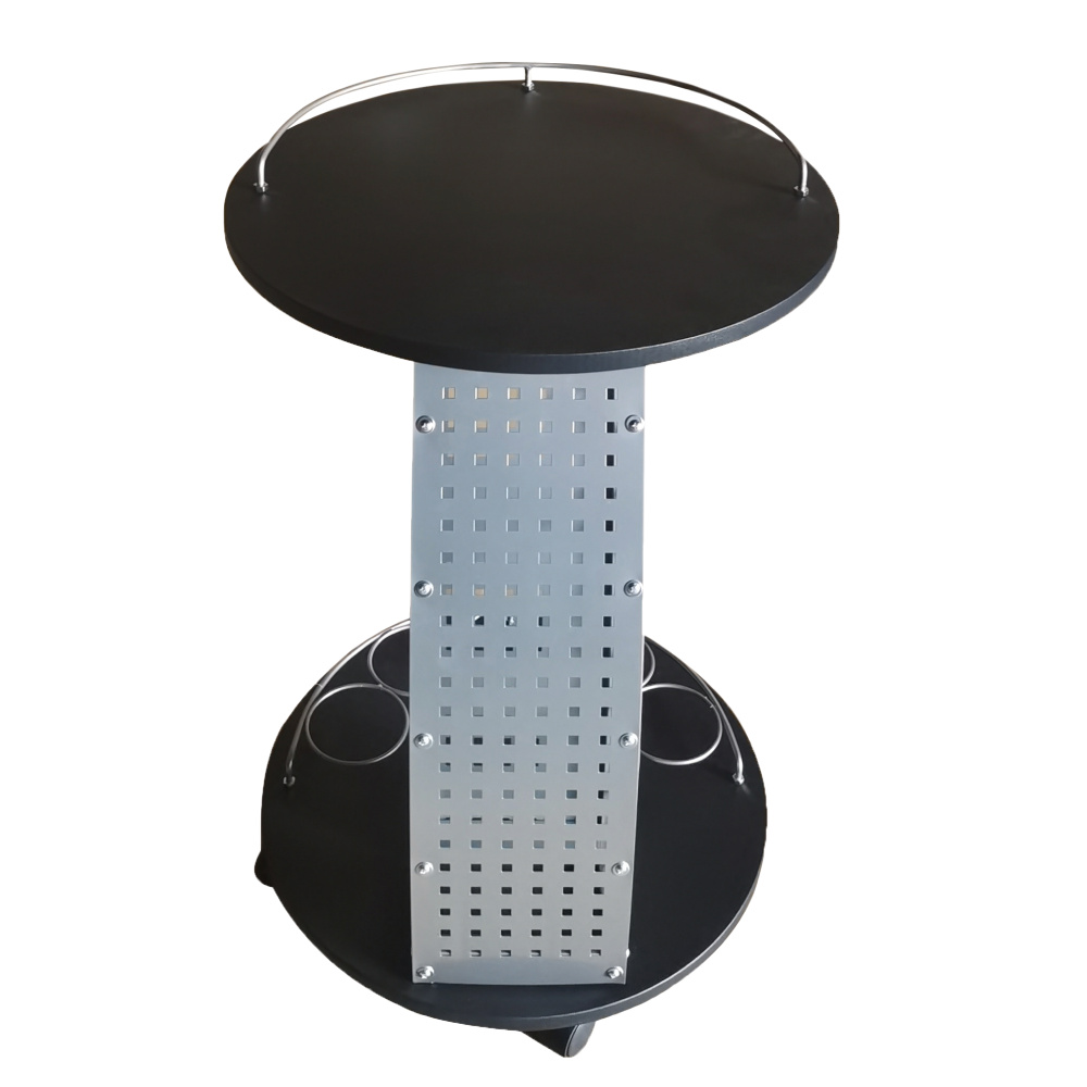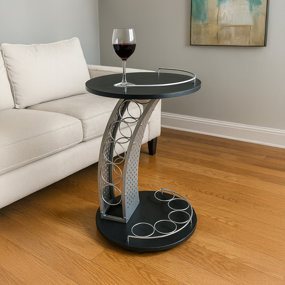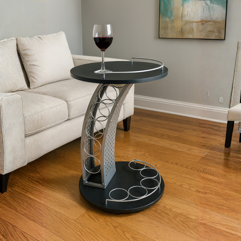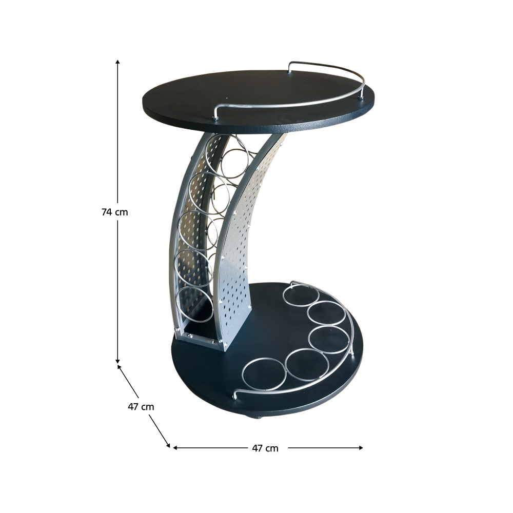 Servírovací stolek ALADAR NEW s kolečky. Materiál: laminovaná DTD/kov Barva: černá/stříbrná Rozměry (ŠxHxV): 47x47x74 cm Tloušťka materiálu: 15 mm Patrová odkládací plocha na láhve Odkládací plocha ve spodní části Další odkládací prostor ve vrchní části Kolečka Dodáváno v demontu
