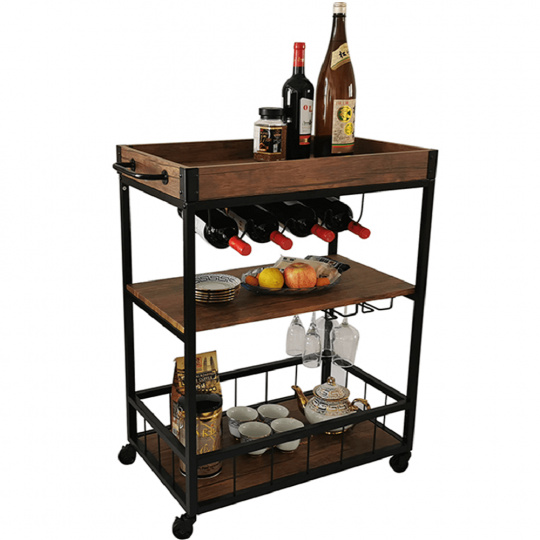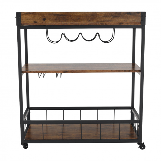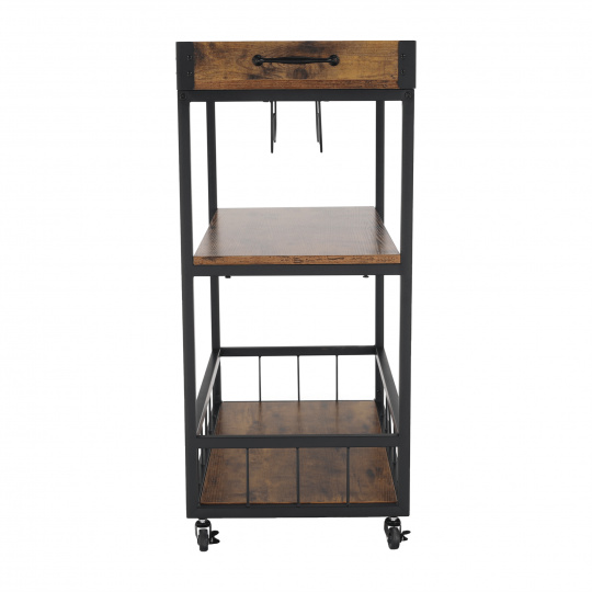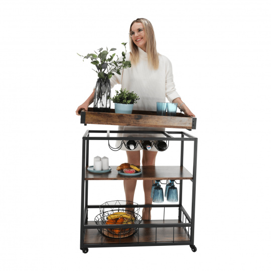Materiál: DTD fóliovaná/kov Barva: dub smoke/černá Rozměry (ŠxHxV): 80x40x90 cm Nosnost: 40 kg Tři poličky Vrchní police má vyvýšená čela Vrchní police je s úchytkami, je odnímatelná Vrchní police poslouží jako podnos či tácek Spodní police s kovovým rámem Boční držák na utěrky Držák na sklenice Držák na láhve Pojízdný S kolečky Se dvěma brzdami Rustikální styl Dodáváno v demontu
