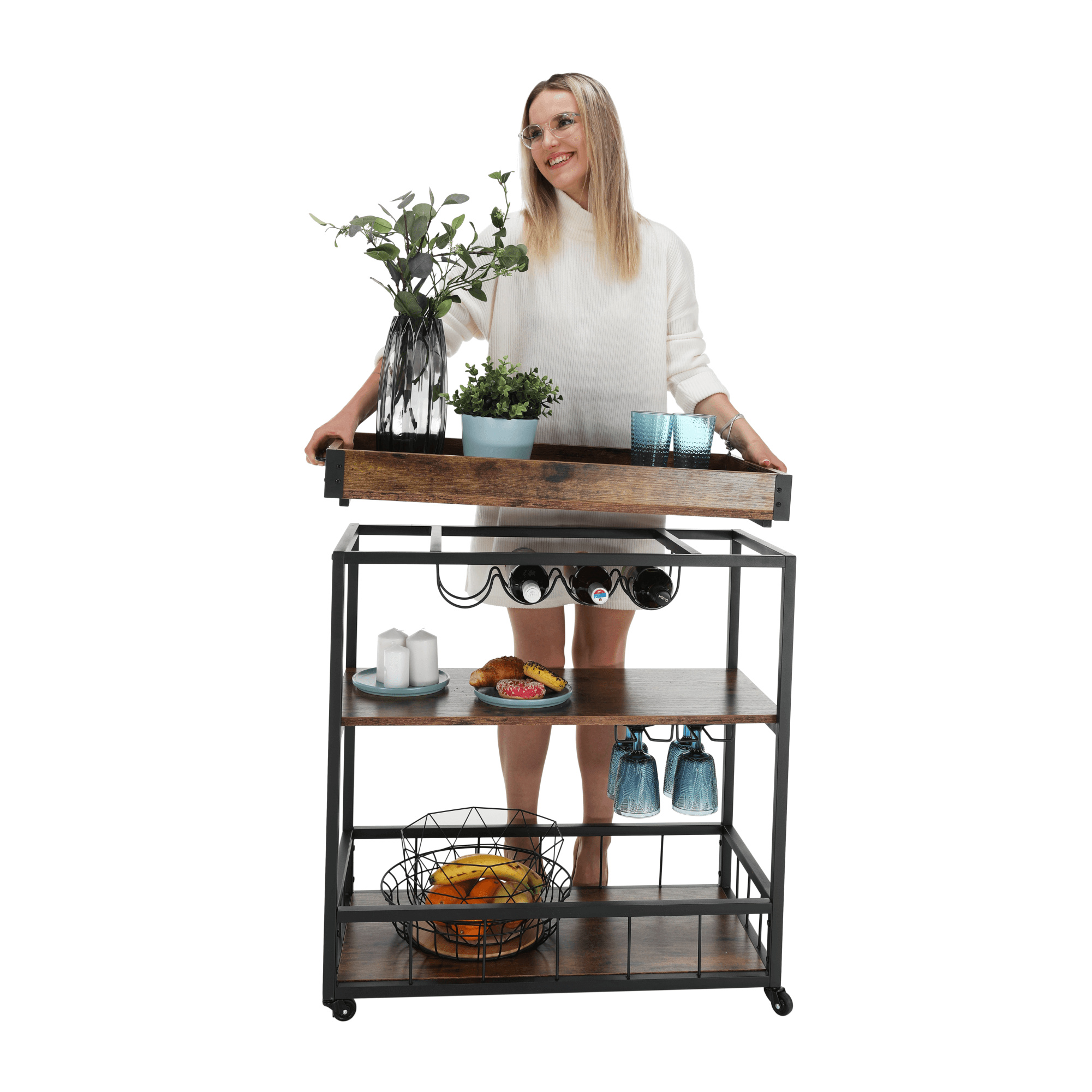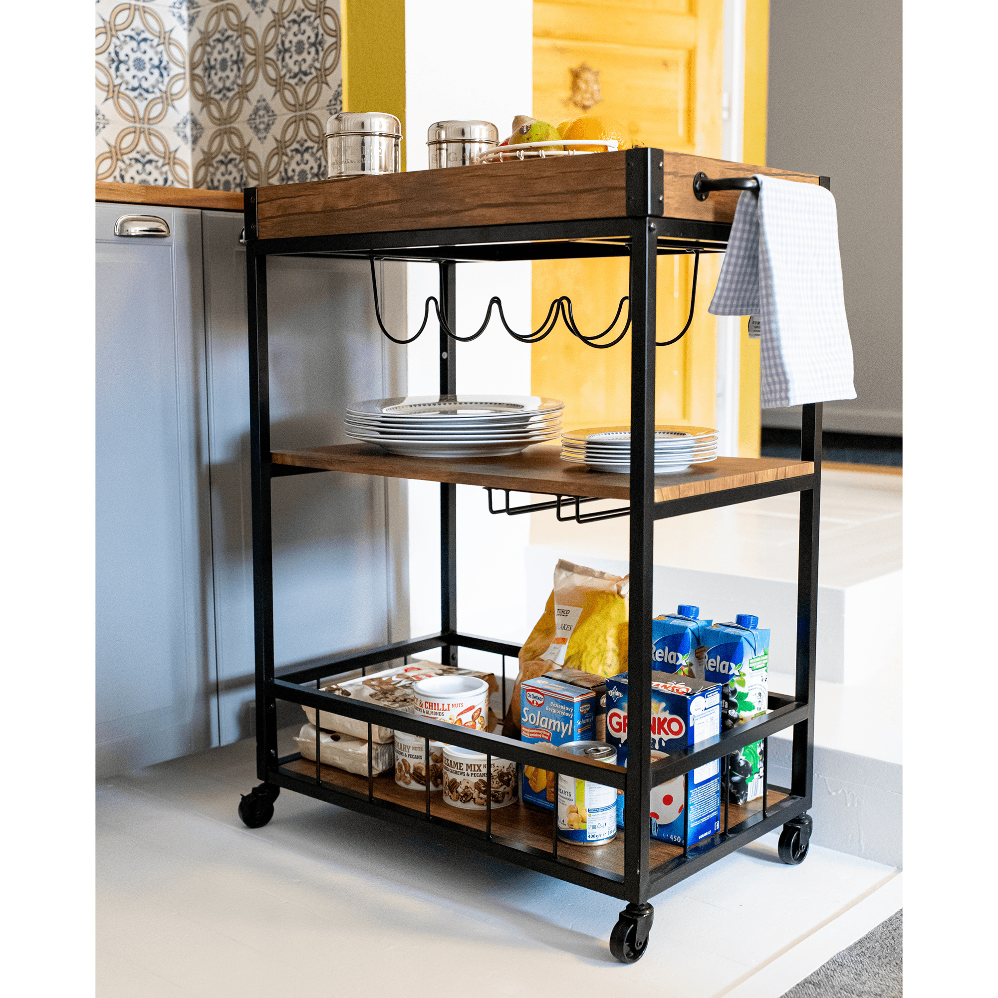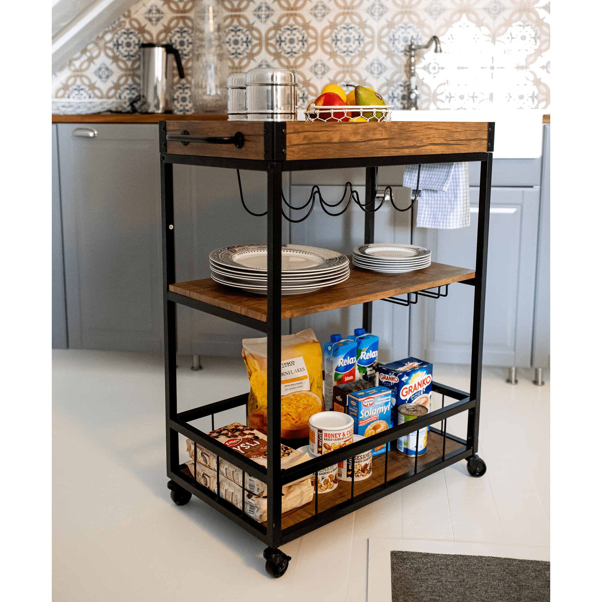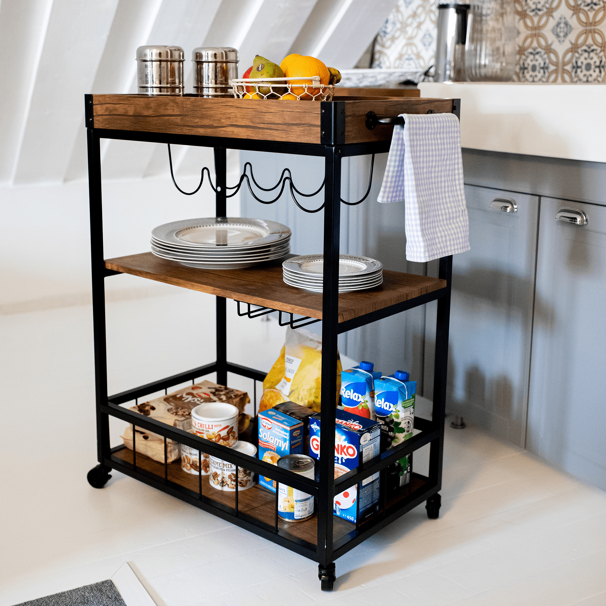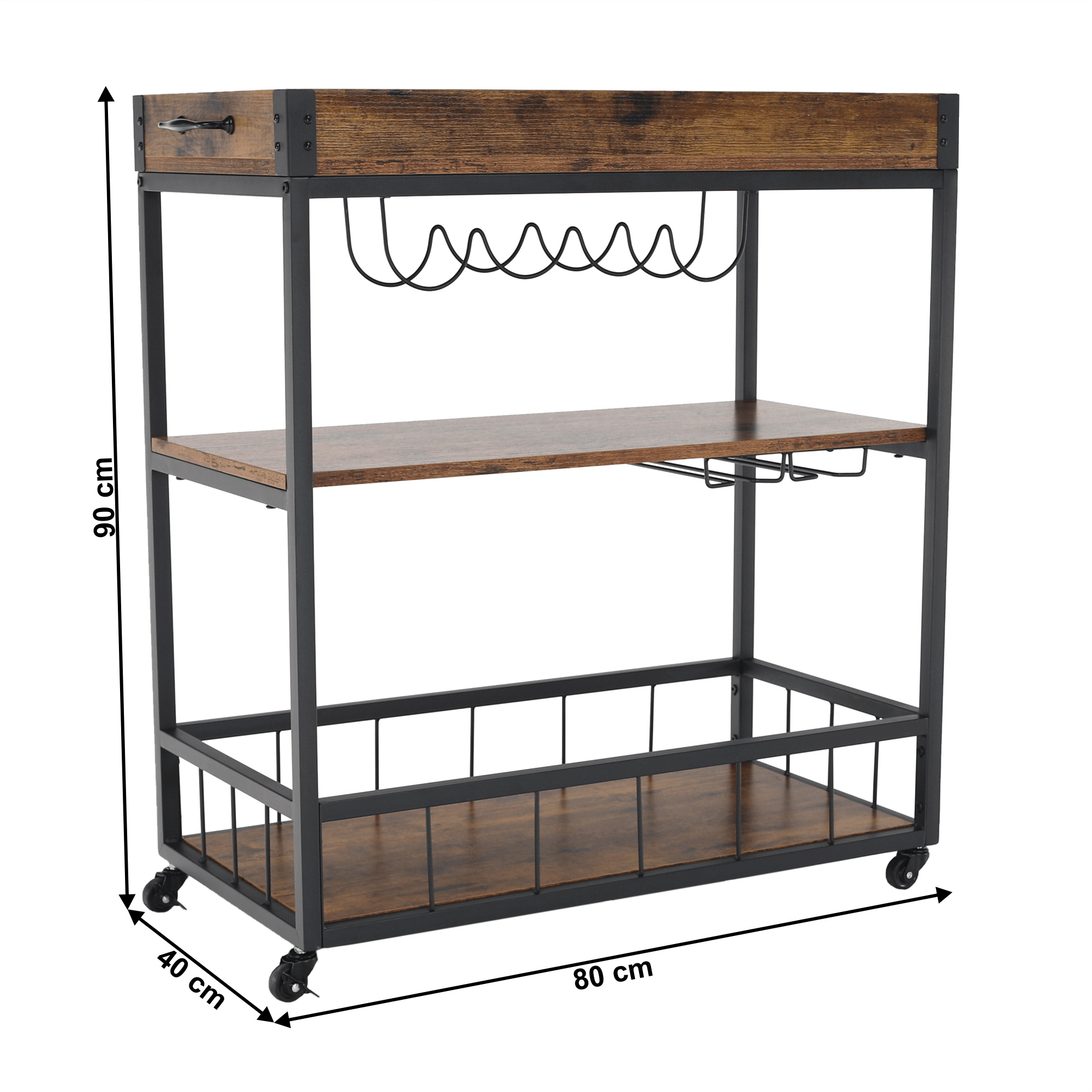 Materiál: DTD fóliovaná/kov Barva: dub smoke/černá Rozměry (ŠxHxV): 80x40x90 cm Nosnost: 40 kg Tři poličky Vrchní police má vyvýšená čela Vrchní police je s úchytkami, je odnímatelná Vrchní police poslouží jako podnos či tácek Spodní police s kovovým rámem Boční držák na utěrky Držák na sklenice Držák na láhve Pojízdný S kolečky Se dvěma brzdami Rustikální styl Dodáváno v demontu