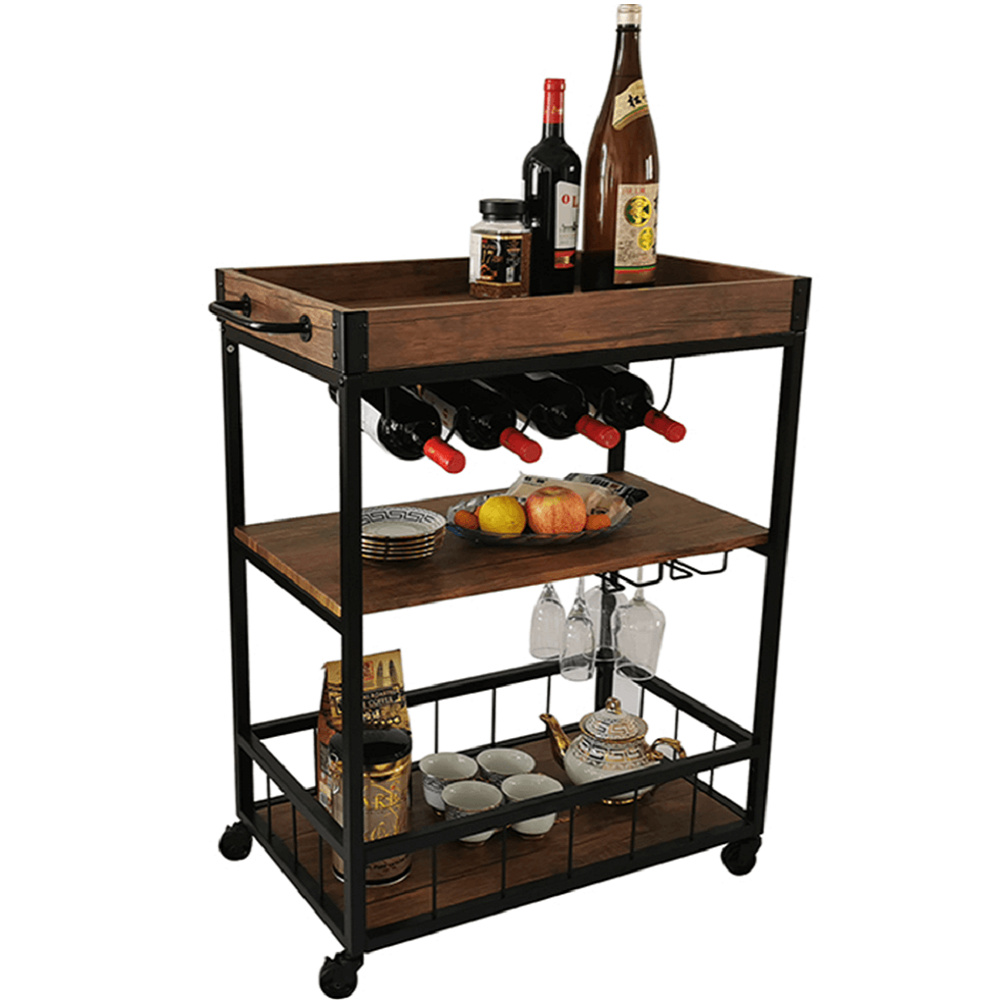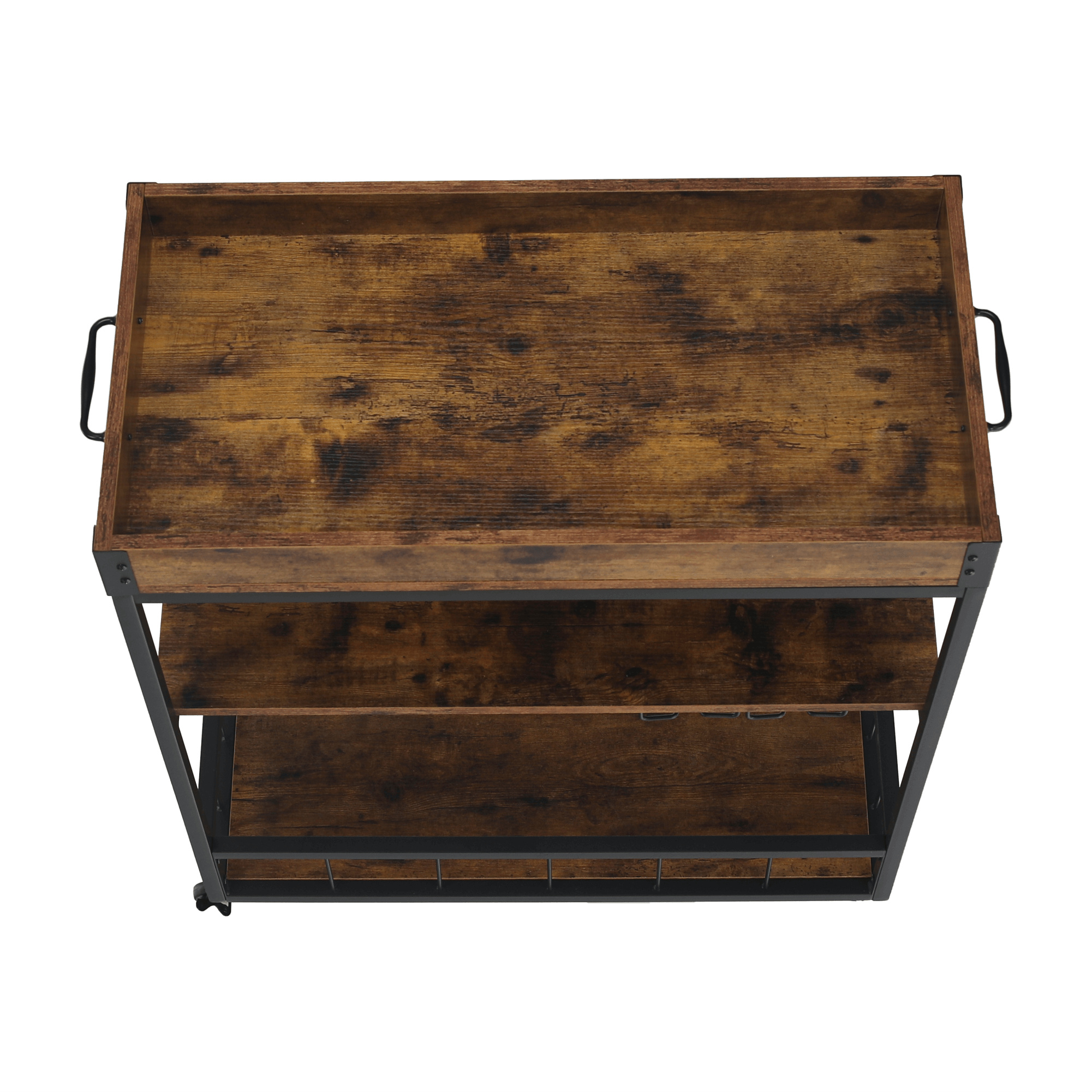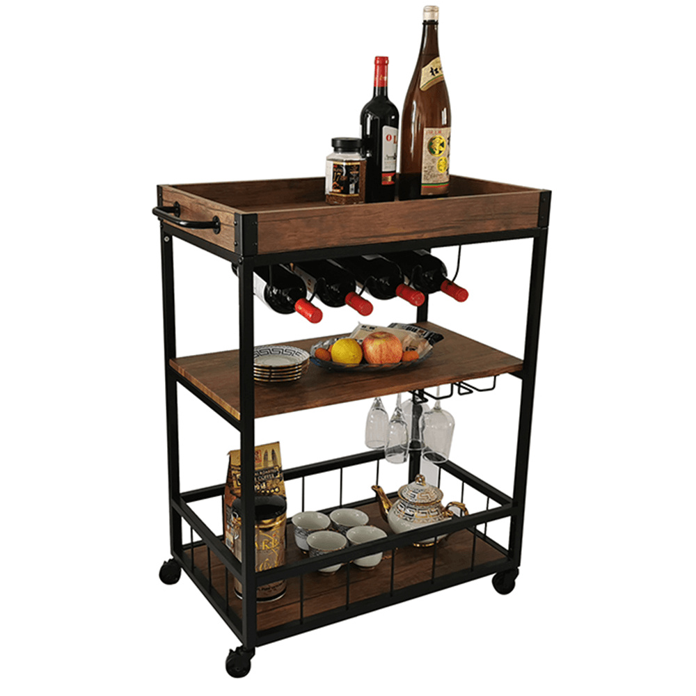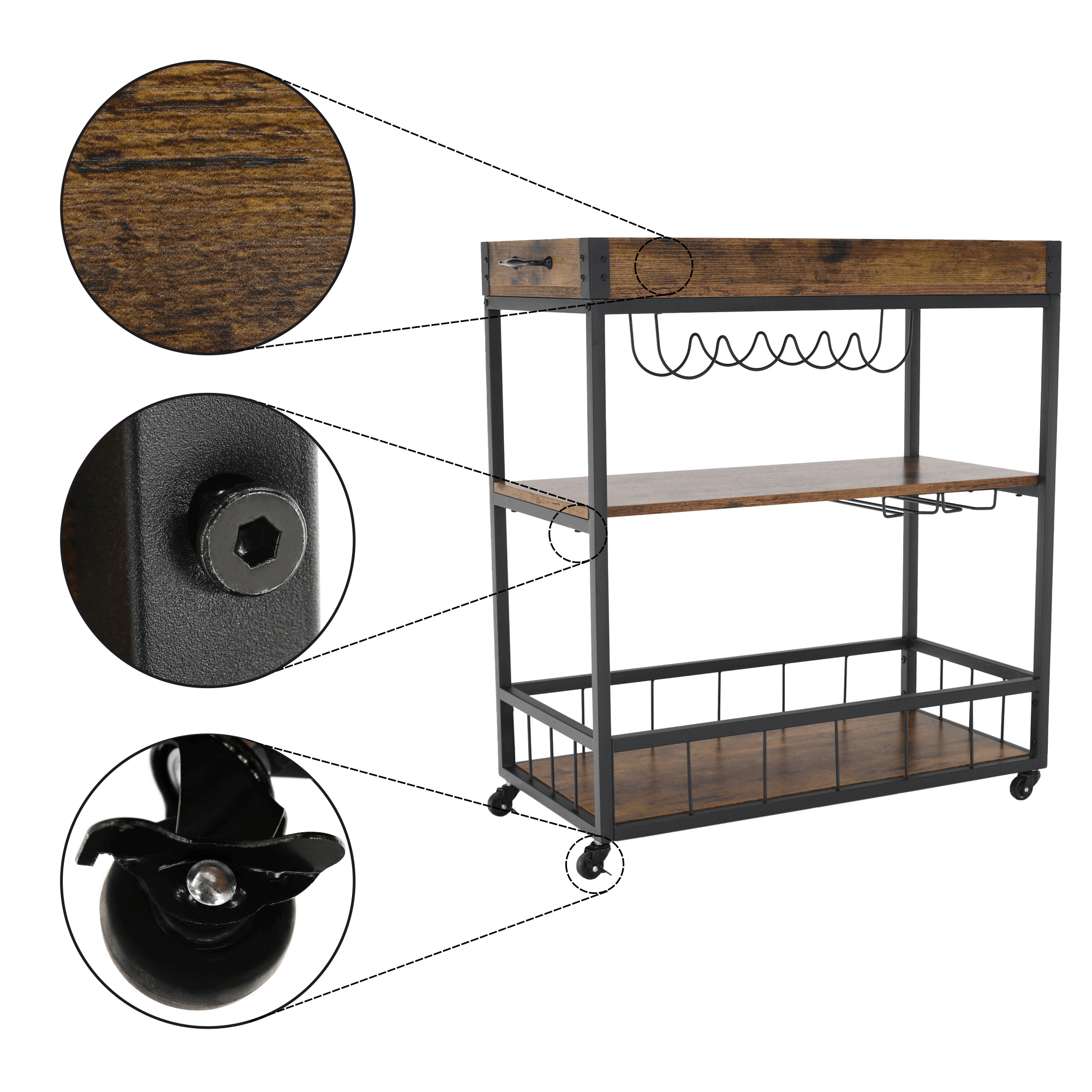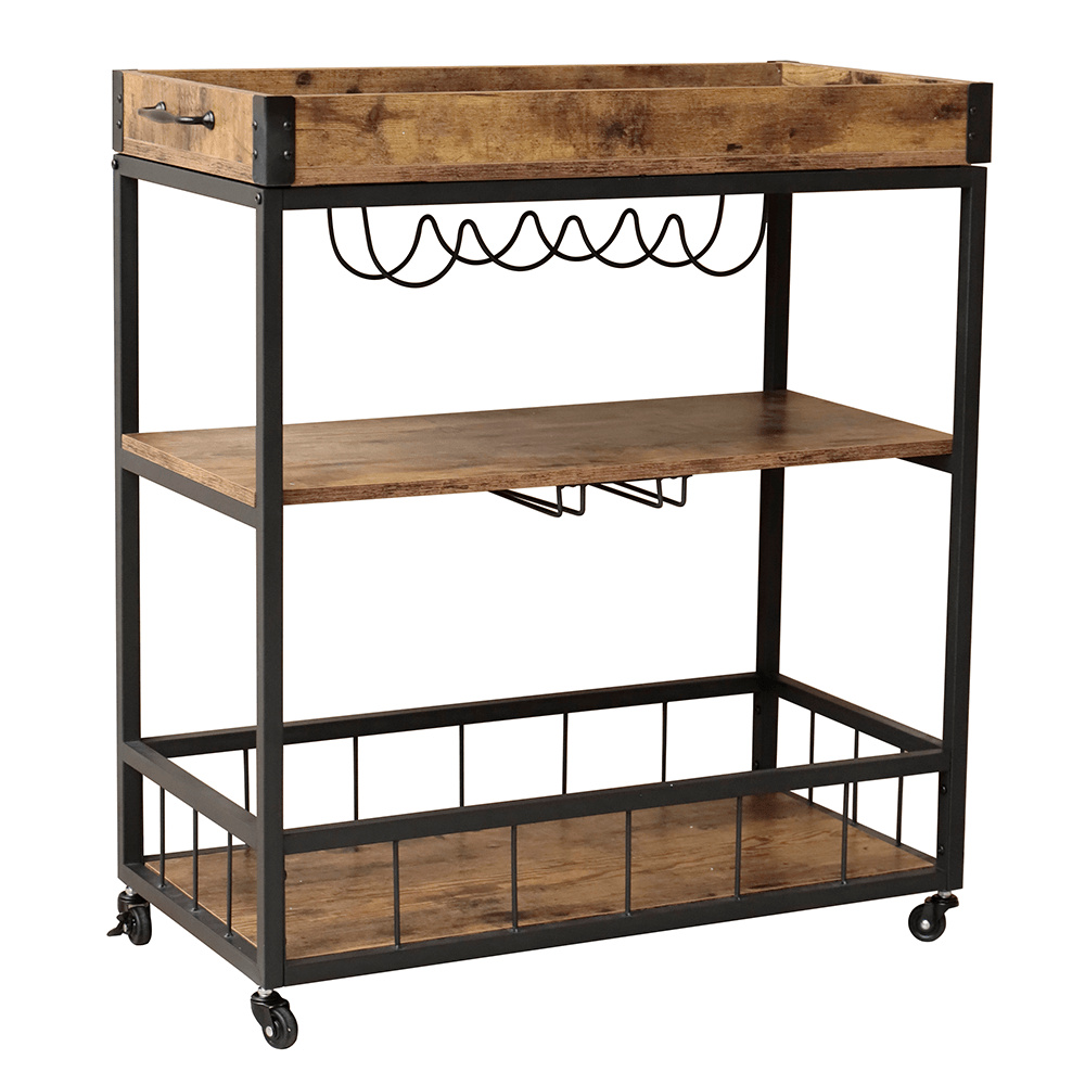 Materiál: DTD fóliovaná/kov Barva: dub smoke/černá Rozměry (ŠxHxV): 80x40x90 cm Nosnost: 40 kg Tři poličky Vrchní police má vyvýšená čela Vrchní police je s úchytkami, je odnímatelná Vrchní police poslouží jako podnos či tácek Spodní police s kovovým rámem Boční držák na utěrky Držák na sklenice Držák na láhve Pojízdný S kolečky Se dvěma brzdami Rustikální styl Dodáváno v demontu