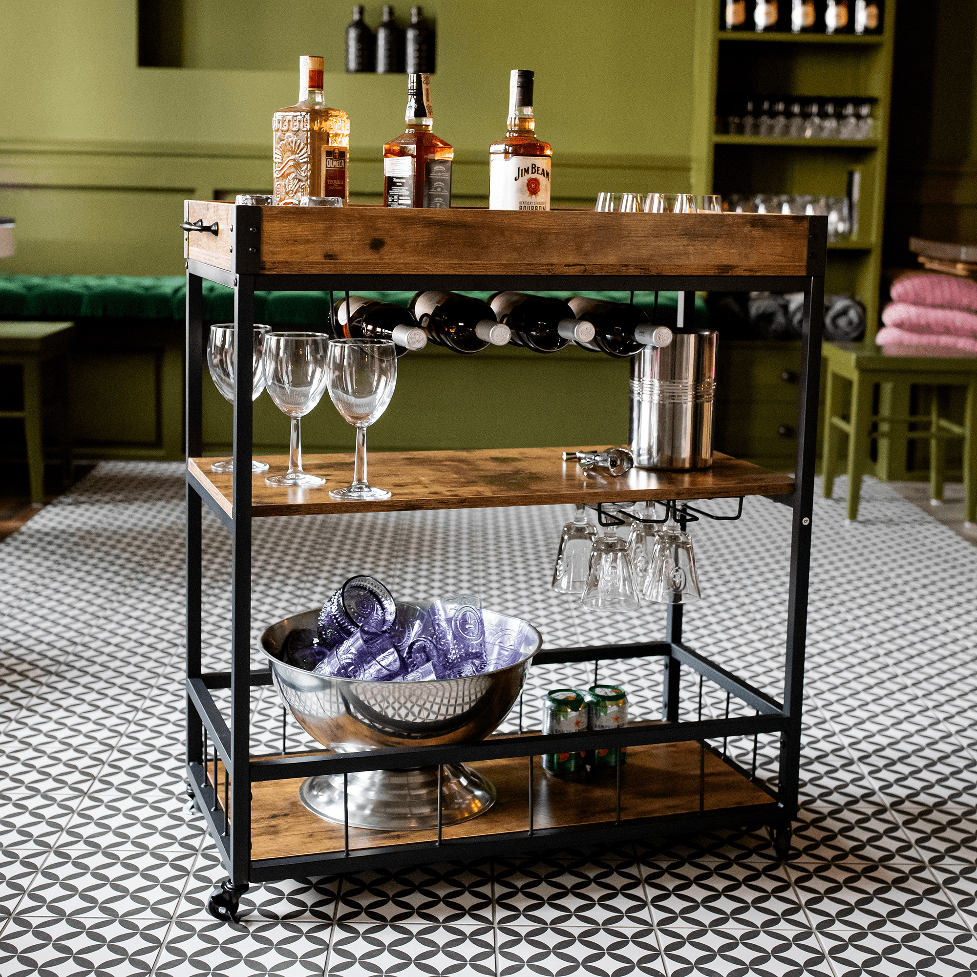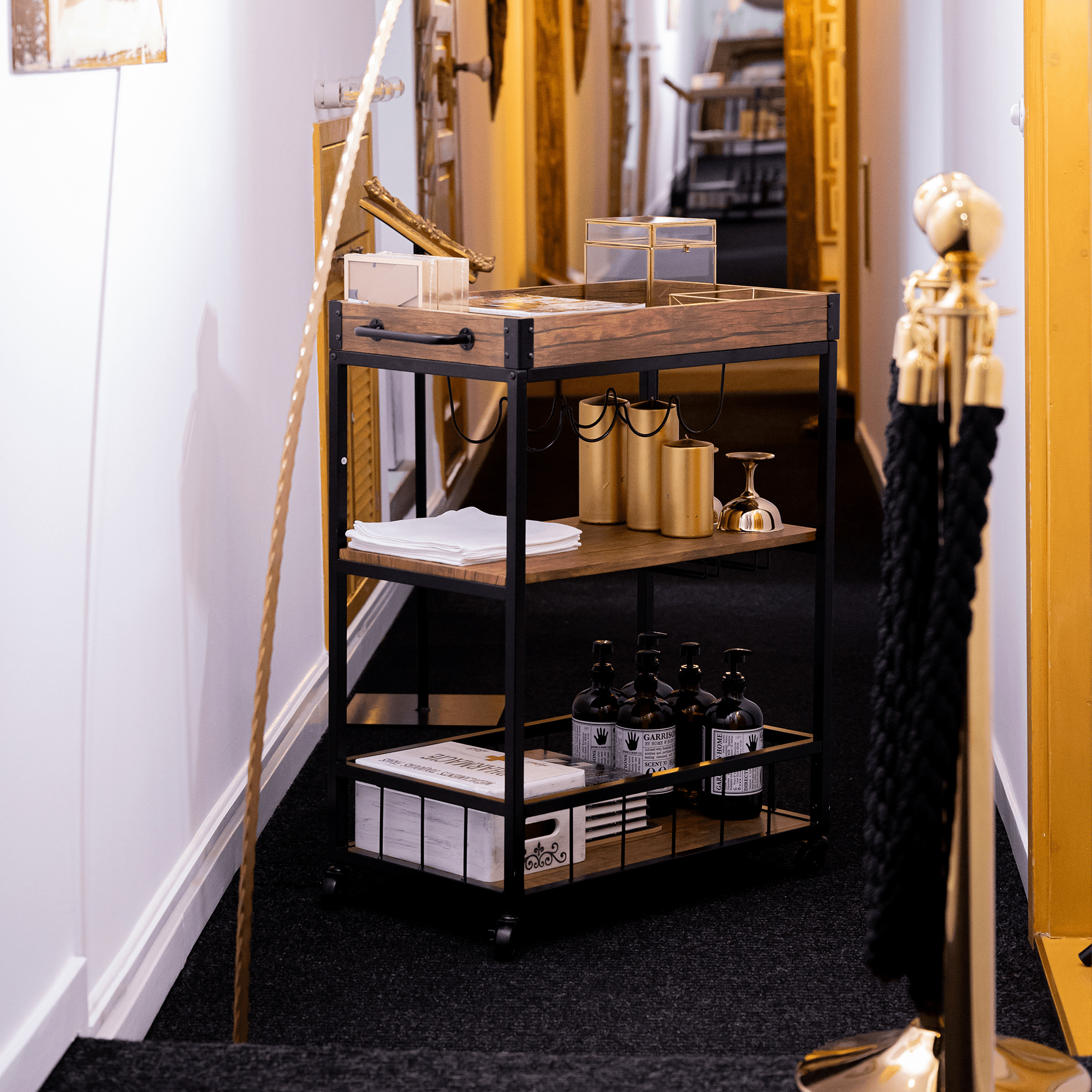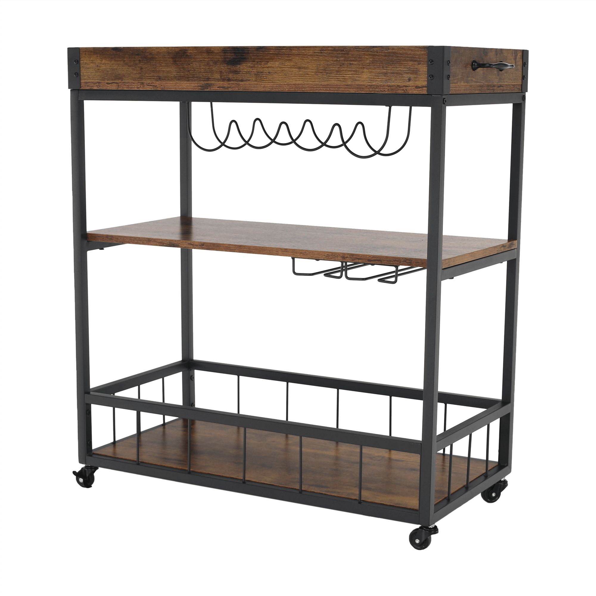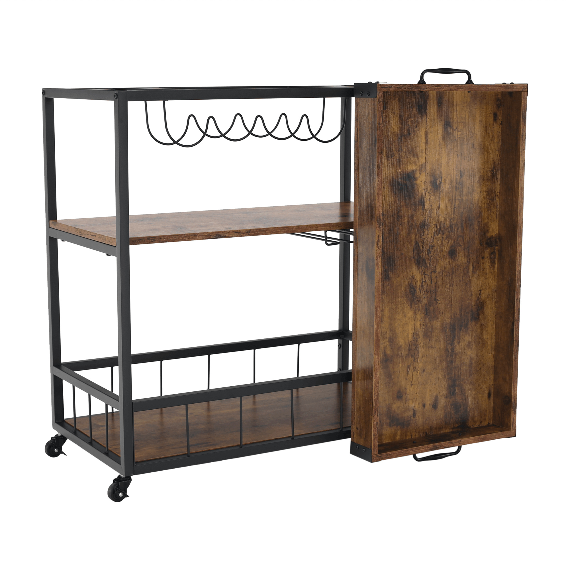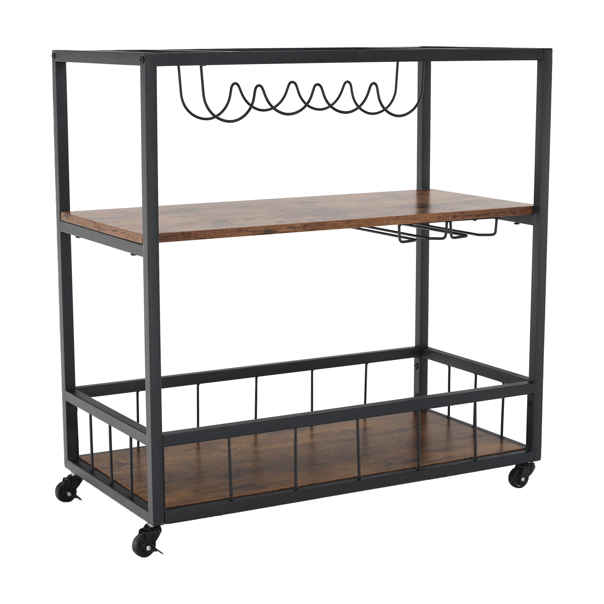 Materiál: DTD fóliovaná/kov Barva: dub smoke/černá Rozměry (ŠxHxV): 80x40x90 cm Nosnost: 40 kg Tři poličky Vrchní police má vyvýšená čela Vrchní police je s úchytkami, je odnímatelná Vrchní police poslouží jako podnos či tácek Spodní police s kovovým rámem Boční držák na utěrky Držák na sklenice Držák na láhve Pojízdný S kolečky Se dvěma brzdami Rustikální styl Dodáváno v demontu