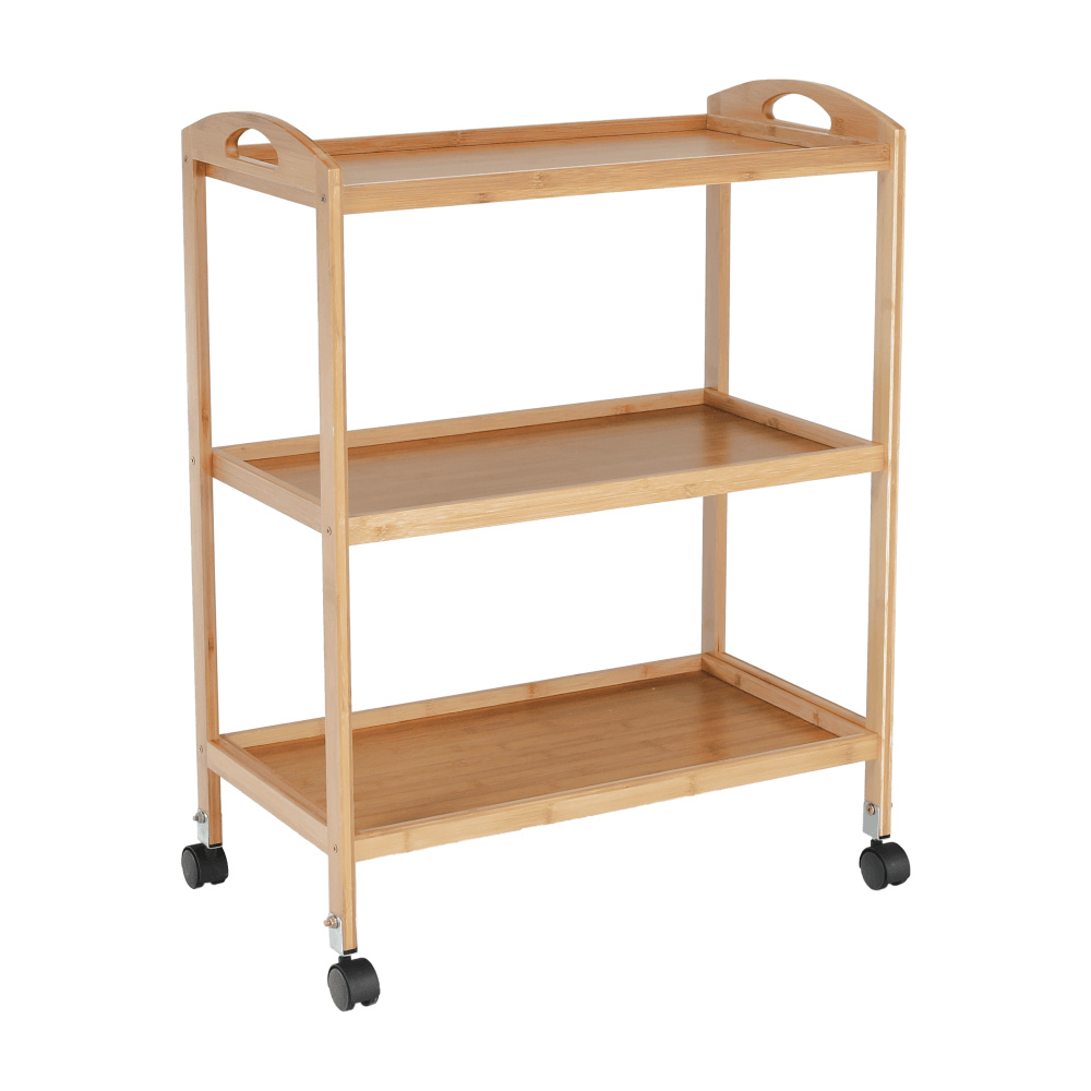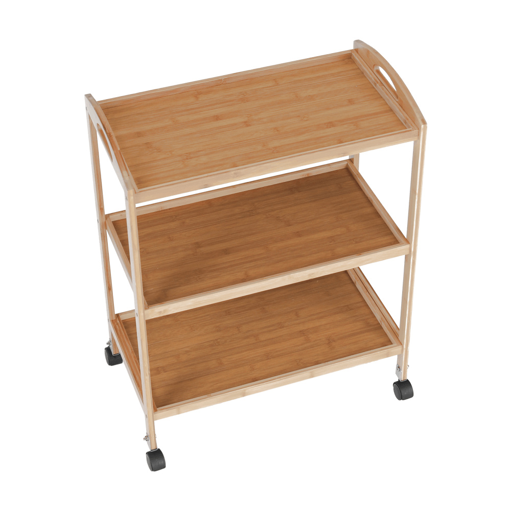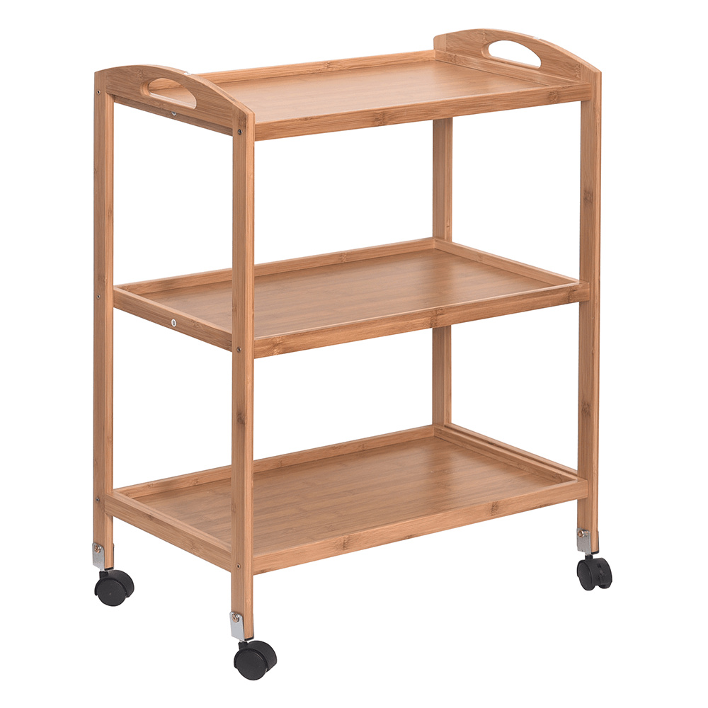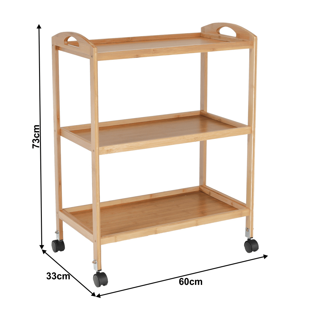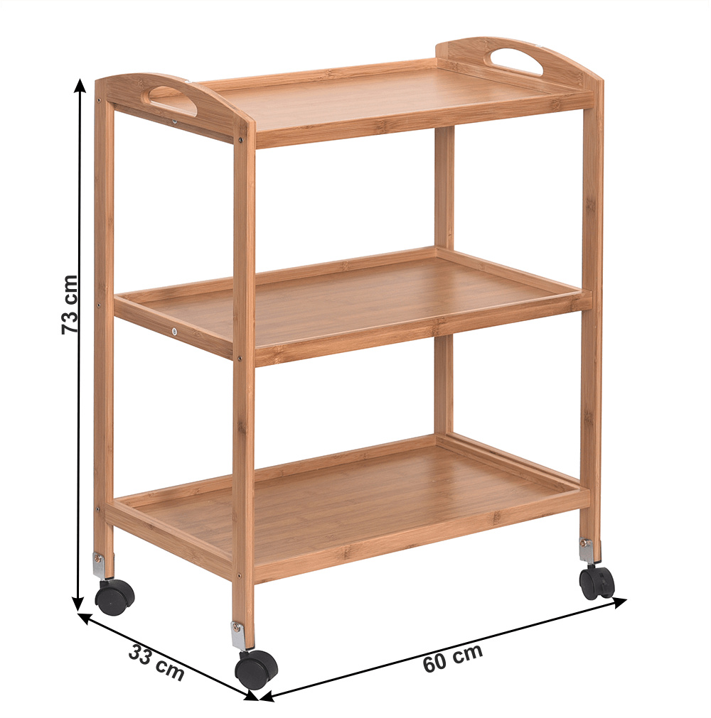 Materiál: lakovaný bambus Barva: přírodní Rozměry (ŠxHxV): 60x33x73 cm 3-patrový 3-police na kolečkách servírovací Dodávané v demontu