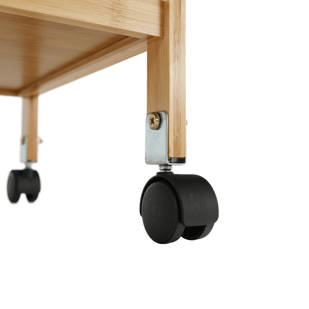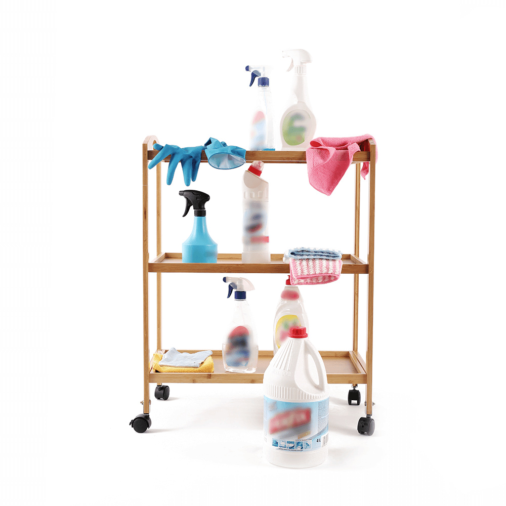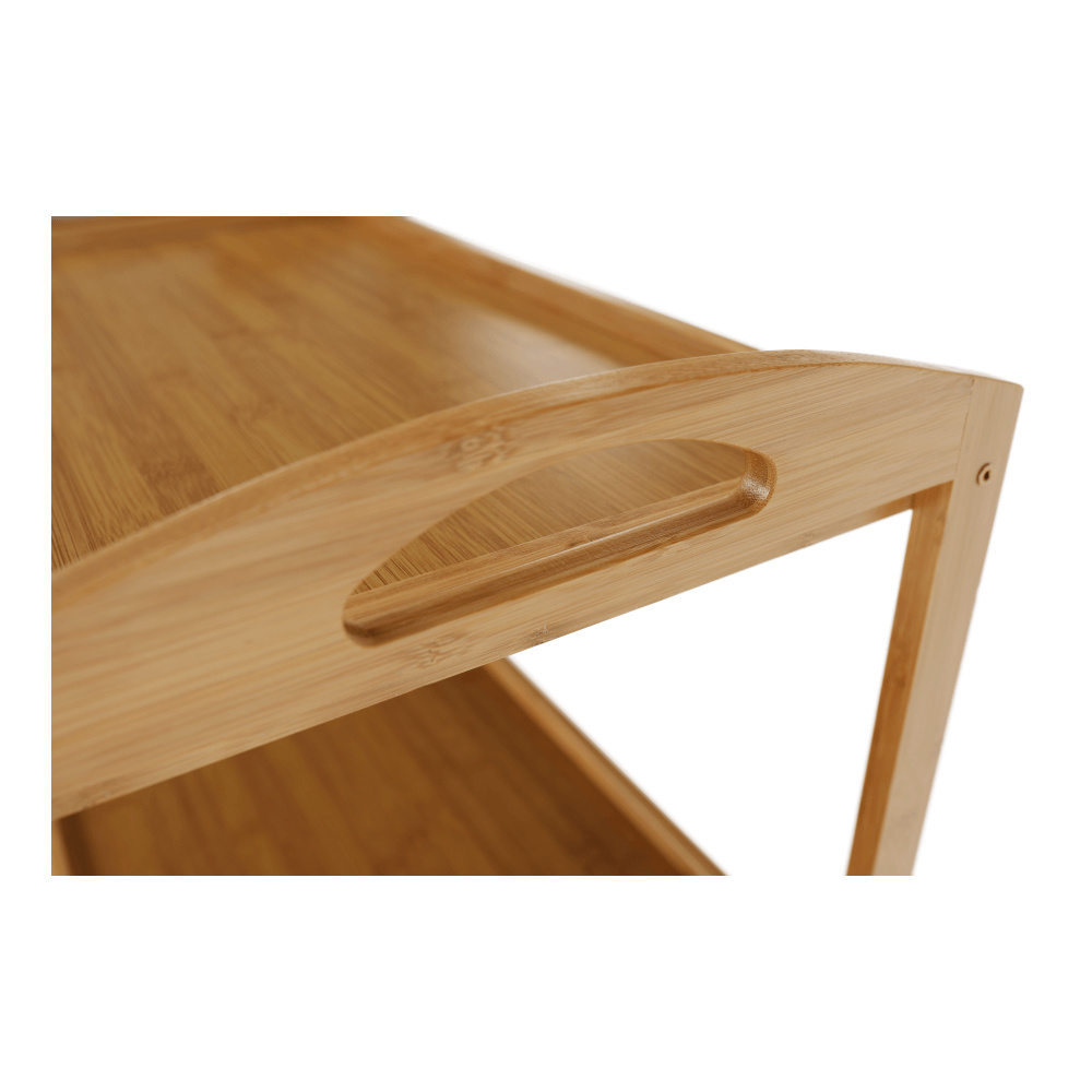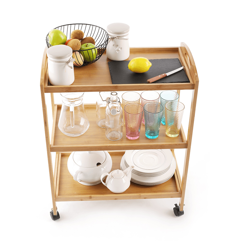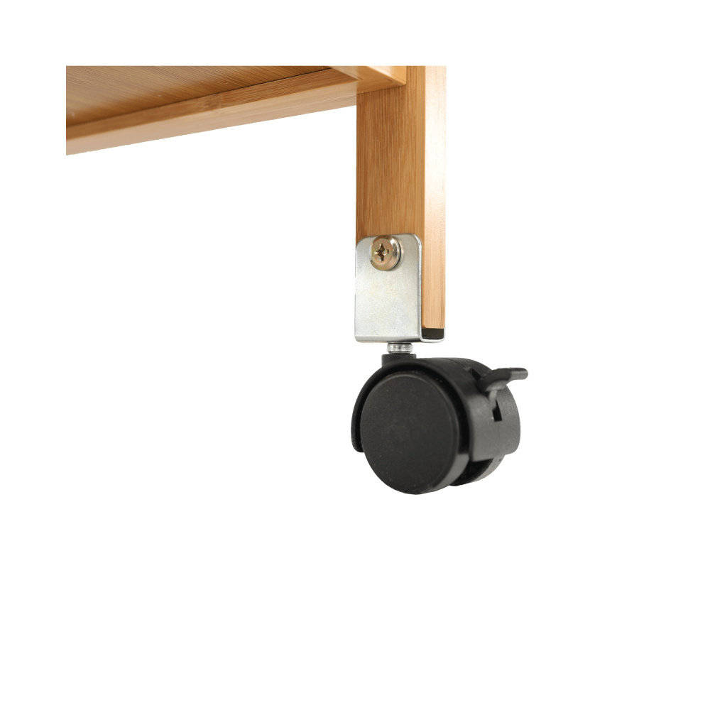 Materiál: lakovaný bambus Barva: přírodní Rozměry (ŠxHxV): 60x33x73 cm 3-patrový 3-police na kolečkách servírovací Dodávané v demontu