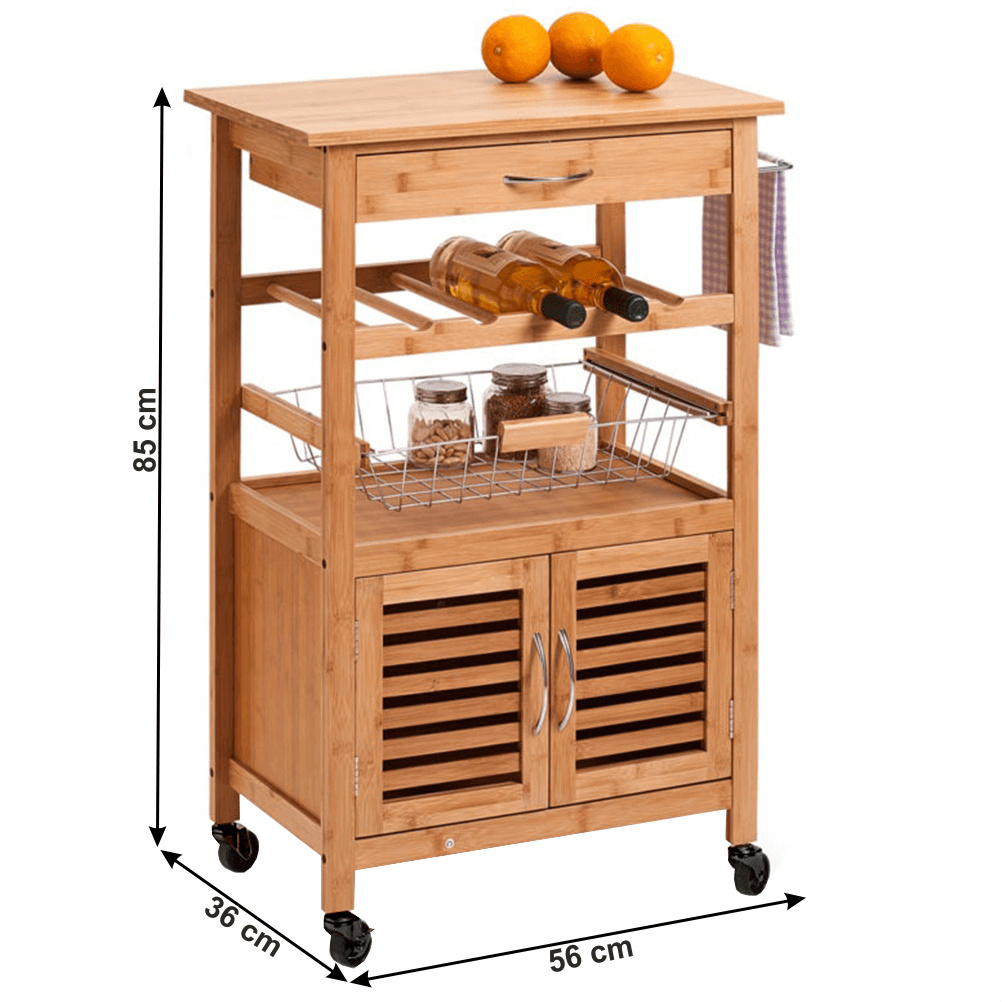 Materiál: bambus Barva: přírodní Materiál výsuvný košík: kov Rozměry (ŠxHxV): 56x36x85 cm Nosnost: max. 20 kg se zásuvkou S poličkou na láhve S výsuvným košíkem Košík lze vybrat dvoudveřová skříňka na kolečkách Dvě kolečka s brzdami pojízdný servírovací Rozměry zásuvky (ŠxHxV): 46,5x26x7cm Rozměry skříňky (ŠxHxV): 46,5x30,5x28cm Výška prostoru na kovový košík: 20,5cm Výška prostoru na láhve: 7,5cm Výška spodního prostoru od podlahy: 8cm Výška koleček: 4cm Dodávané v demontu