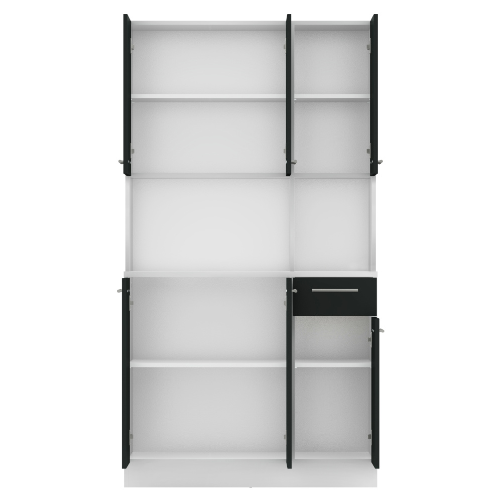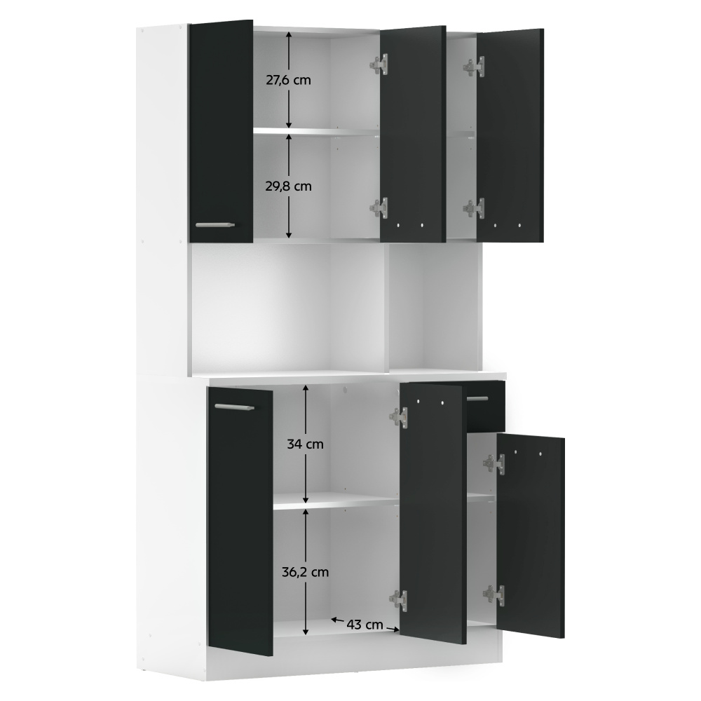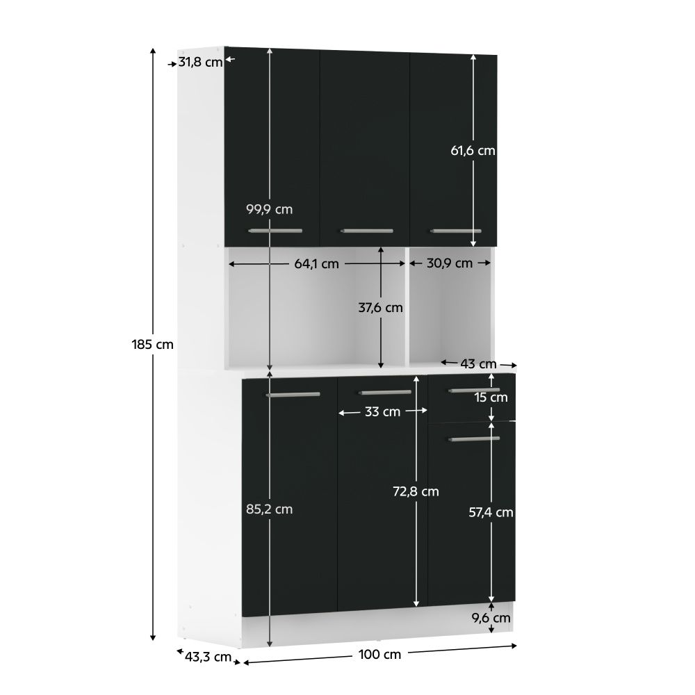 Materiál: DTD laminovaná Barva: bílá/černá Rozměry (ŠxHxV): 100x43,3x185 cm Tloušťka materiálu: 1,6 cm Tloušťka vrchního plátu spodní skříňky: 2,2 cm Šestidveřový Policový Nosnost police: 5 kg 1 zásuvka Rozměry zásuvky (ŠxV): 30,9x15 cm S úchytkami Materiál úchytek: PVC Barva úchytek: stříbrná Na kluzácích Praktický Víceúčelový Kvalitní slovenský výrobek Doporučujeme připevnit ke zdi Dodáváno v demontu