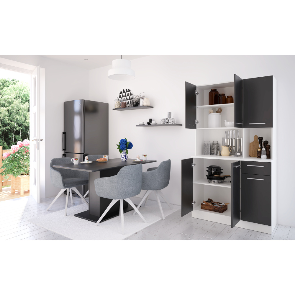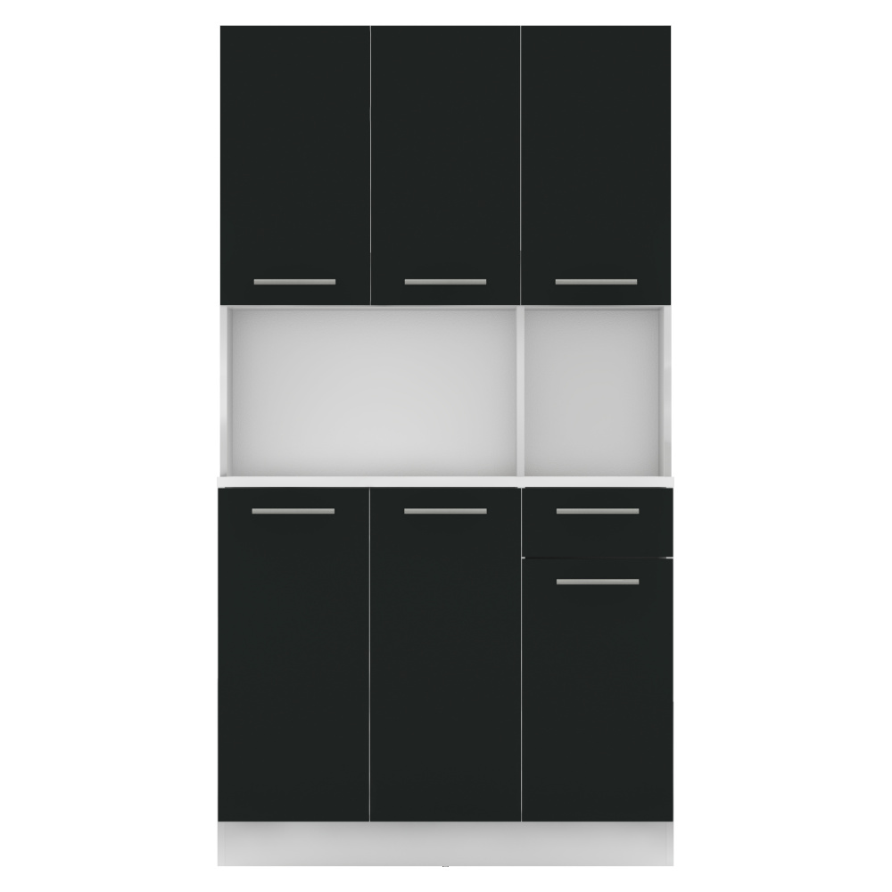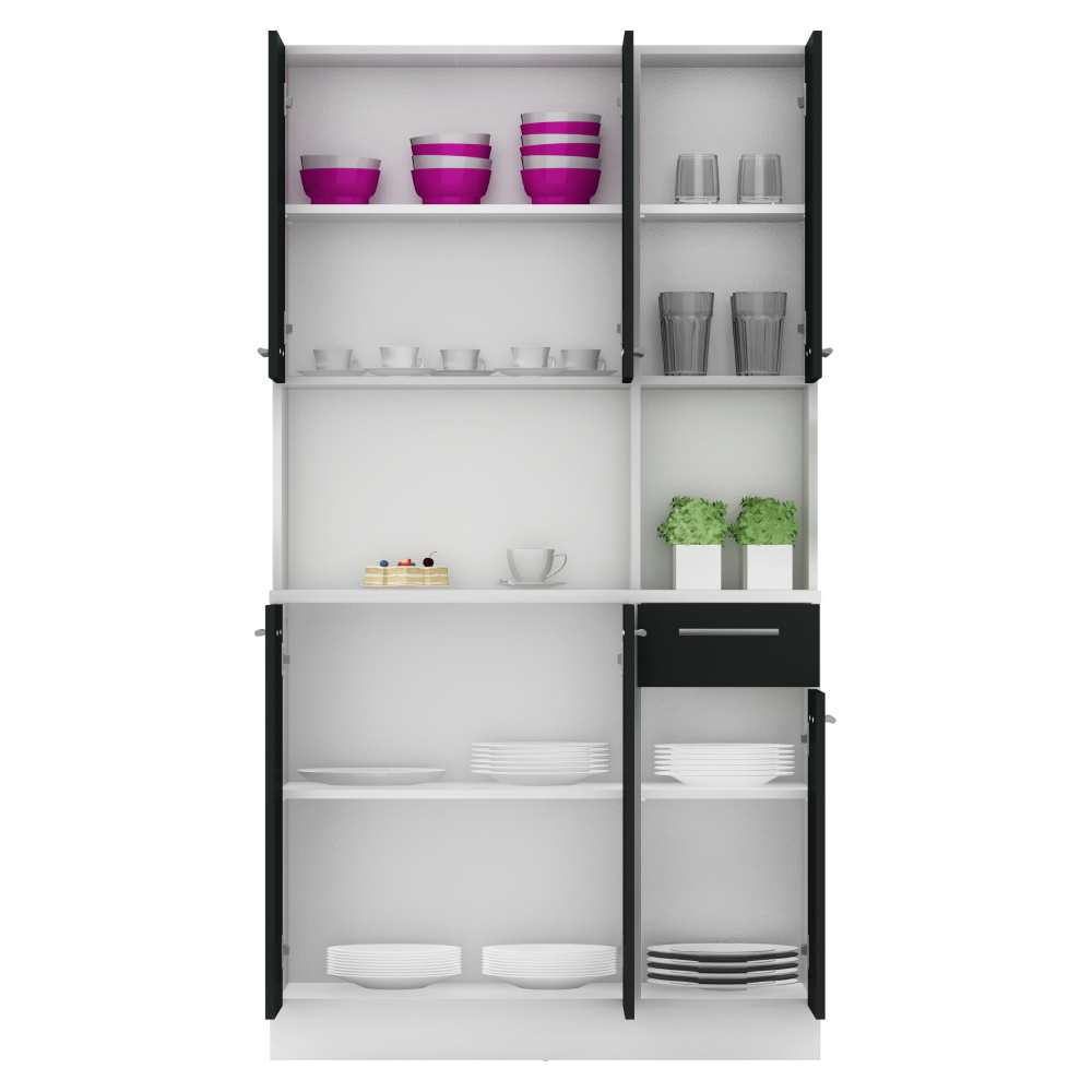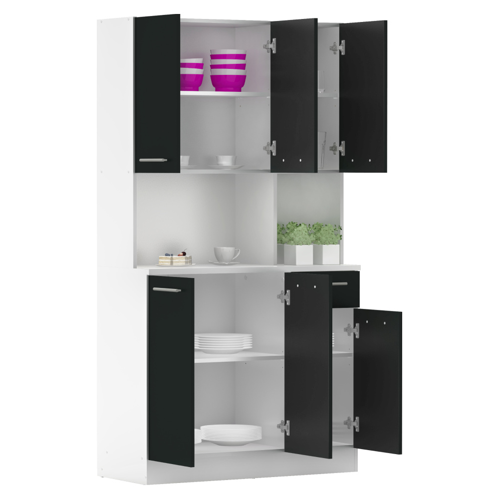 Materiál: DTD laminovaná Barva: bílá/černá Rozměry (ŠxHxV): 100x43,3x185 cm Tloušťka materiálu: 1,6 cm Tloušťka vrchního plátu spodní skříňky: 2,2 cm Šestidveřový Policový Nosnost police: 5 kg 1 zásuvka Rozměry zásuvky (ŠxV): 30,9x15 cm S úchytkami Materiál úchytek: PVC Barva úchytek: stříbrná Na kluzácích Praktický Víceúčelový Kvalitní slovenský výrobek Doporučujeme připevnit ke zdi Dodáváno v demontu