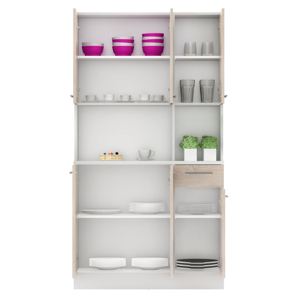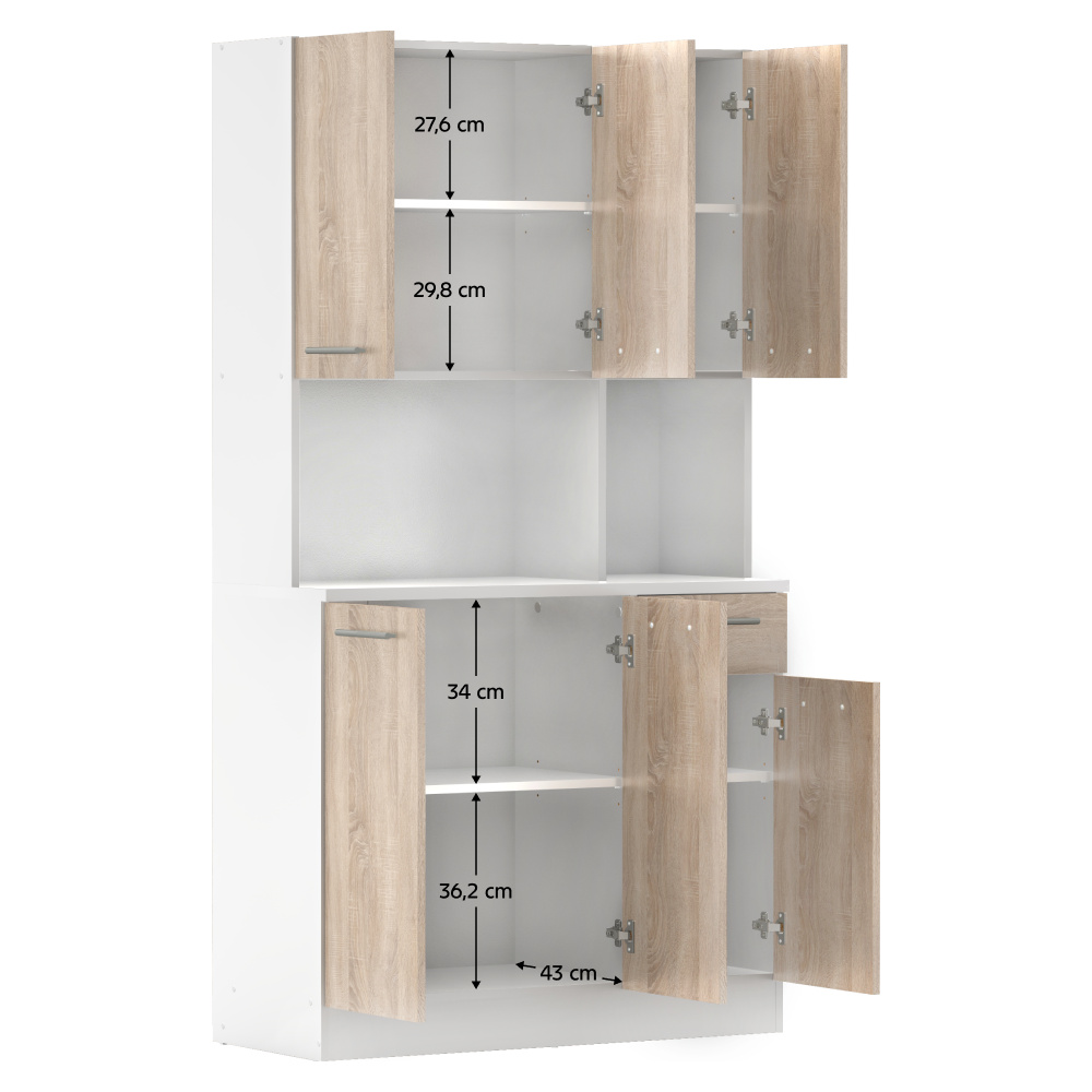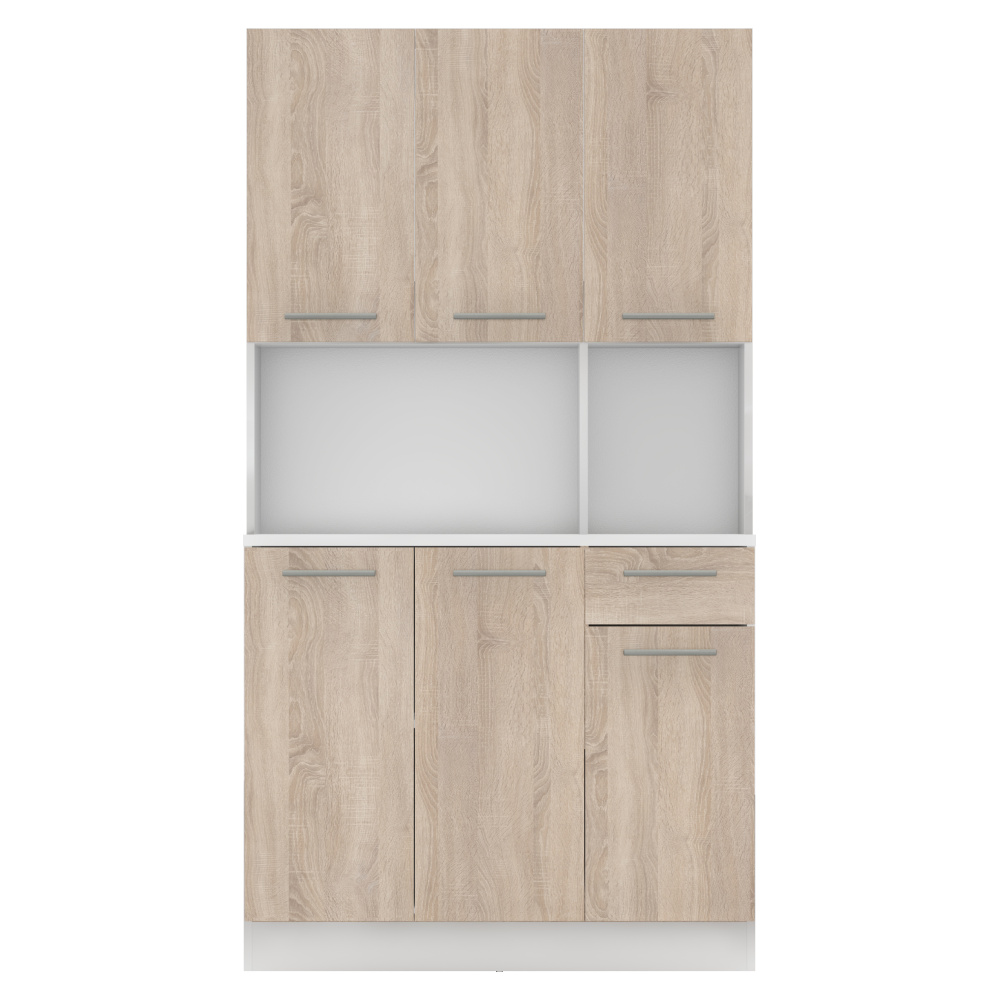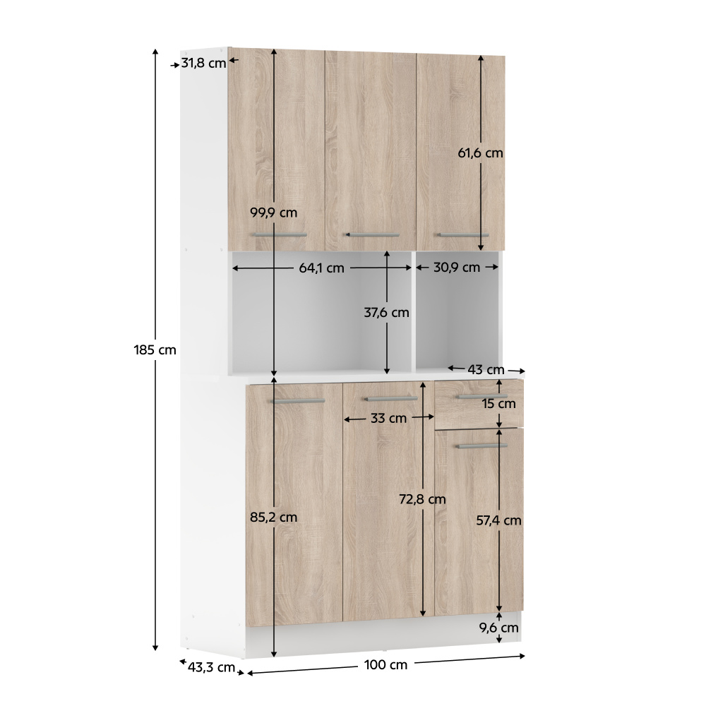 Materiál: DTD laminovaná Barva: bílá/dub sonoma Rozměry (ŠxHxV): 100x43,3x185 cm Tloušťka materiálu: 1,6 cm Tloušťka vrchního plátu spodní skříňky: 2,2 cm Šestidveřový Policový Nosnost police: 5 kg 1 zásuvka Rozměry zásuvky (ŠxV): 30,9x15 cm S úchytkami Materiál úchytek: PVC Barva úchytek: stříbrná Na kluzácích Praktický Víceúčelový Kvalitní slovenský výrobek Doporučujeme připevnit ke zdi Dodáváno v demontu