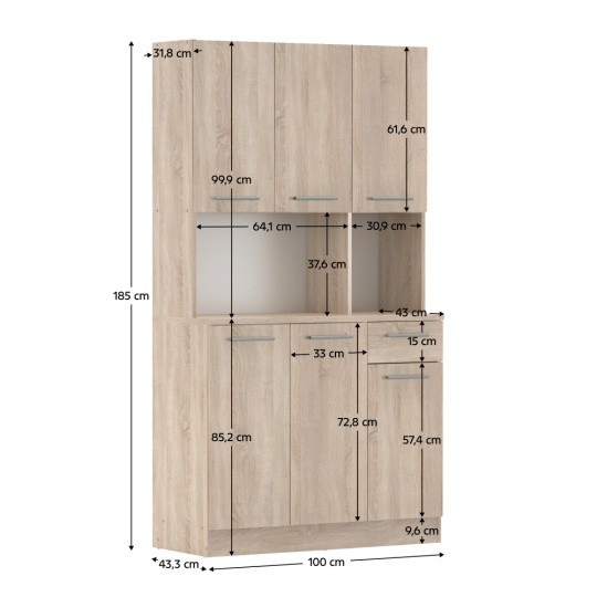 Materiál: DTD laminovaná Barva: dub sonoma Rozměry (ŠxHxV): 100x43,3x185 cm Tloušťka materiálu: 1,6 cm Tloušťka vrchního plátu spodní skříňky: 2,2 cm Šestidveřový Policový Nosnost police: 5 kg 1 zásuvka Rozměry zásuvky (ŠxV): 30,9x15 cm S úchytkami Materiál úchytek: PVC Barva úchytek: stříbrná Na kluzácích Praktický Víceúčelový Kvalitní slovenský výrobek Doporučujeme připevnit ke zdi Dodáváno v demontu