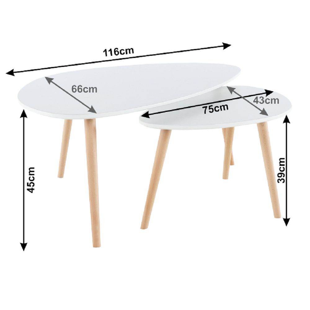 Materiál: MDF / dřevo Barva: bílá / nohy v provedení buk Rozměry většího stolku (ŠxHxV): 116x66x45 cm Rozměry menšího stolku (ŠxHxV): 75x43x39 cm Tloušťka materiálu: 18 mm Dodávané v demontu.