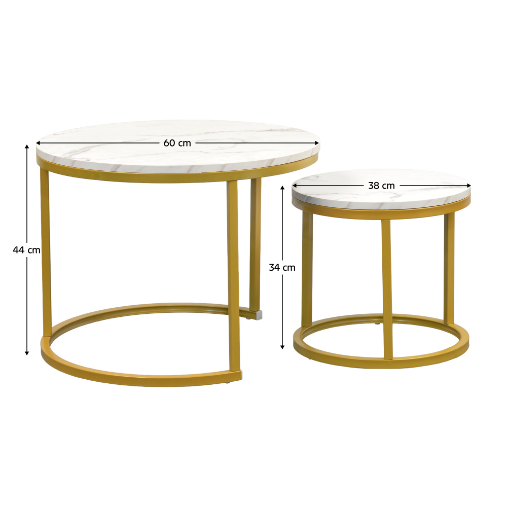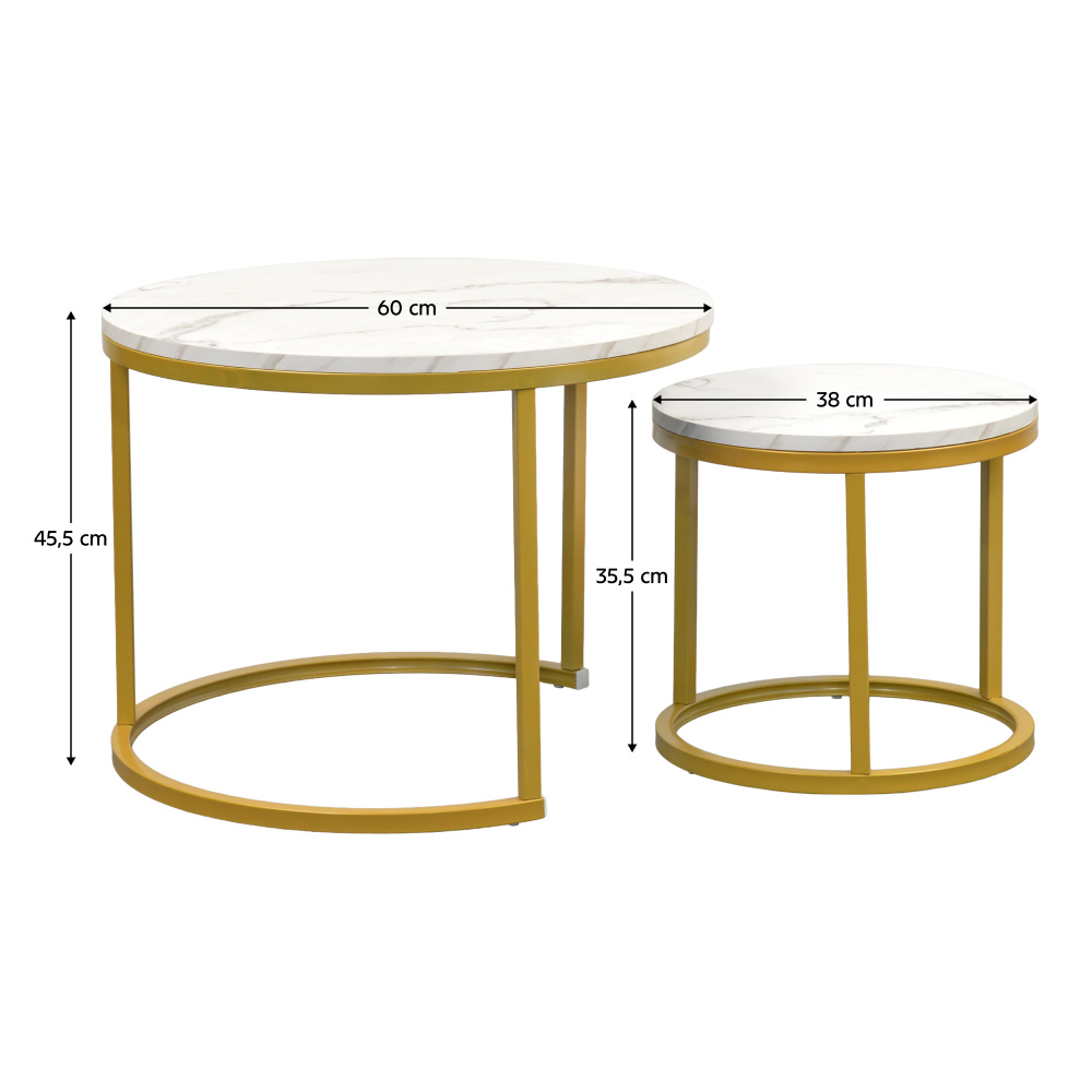 Materiál: foliovaná MDF/kov Barevné provedení: bílá vzor mramor/zlatá Rozměry většího stolku (PxV): 60x45,5 cm Rozměry menšího stolku (PxV): 38x35,5 cm Tloušťka platu stolu: 1,5 cm Set 2 kusů Možnost zasunutí menšího pod větší stolek Kulatý Moderní a stylový Nosnost většího stolku: 15 kg Nosnost menšího stolku: 10 kg Dodáváno v demontu