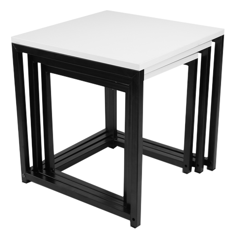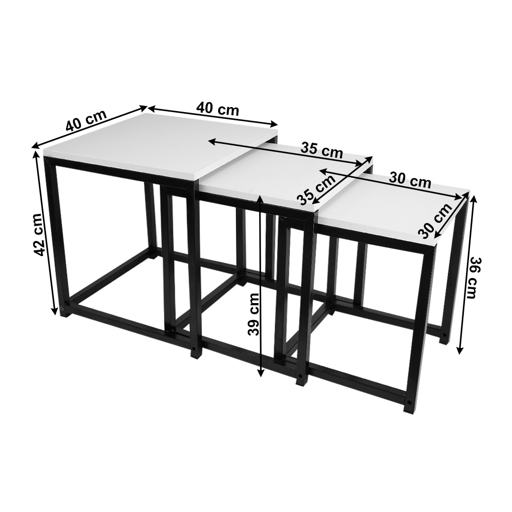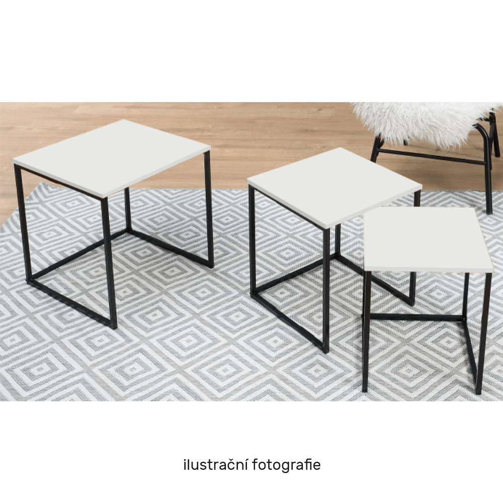 Set 3 konferenčních stolků KASTLER NEW TYP 3 Materiál: MDF / kov Barva: bílá matná / černá Rozměry větší stolek (ŠxHxV): 40x40x42 cm Rozměry střední stolek (ŠxHxV): 35x35x39 cm Rozměry menší stolek (ŠxHxV): 30x30x36 cm Tloušťka materiálu: 15 mm Dodávané v demontu.
