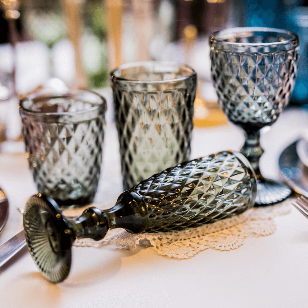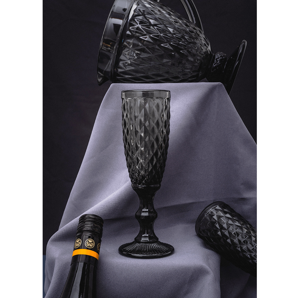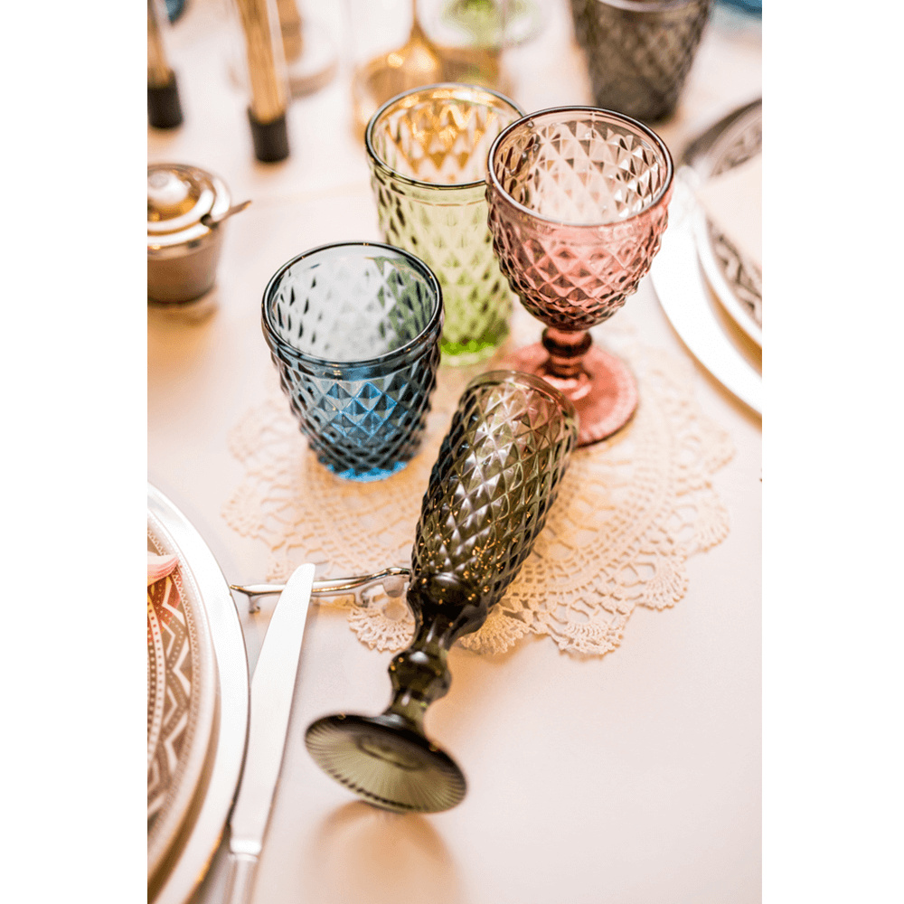 Set 4 ks sklenic Materiál: sklo Barva: šedá / zelená / růžová / modrá Pohár (priemerxV): 7x20 cm Objem poháru: 150 ml Sklenice na šampaňské Vhodné do myčky nádobí Nedoporučuje se použití v mikrovlnné troubě