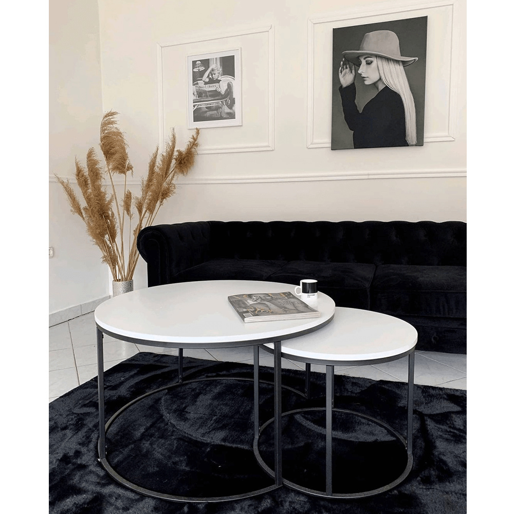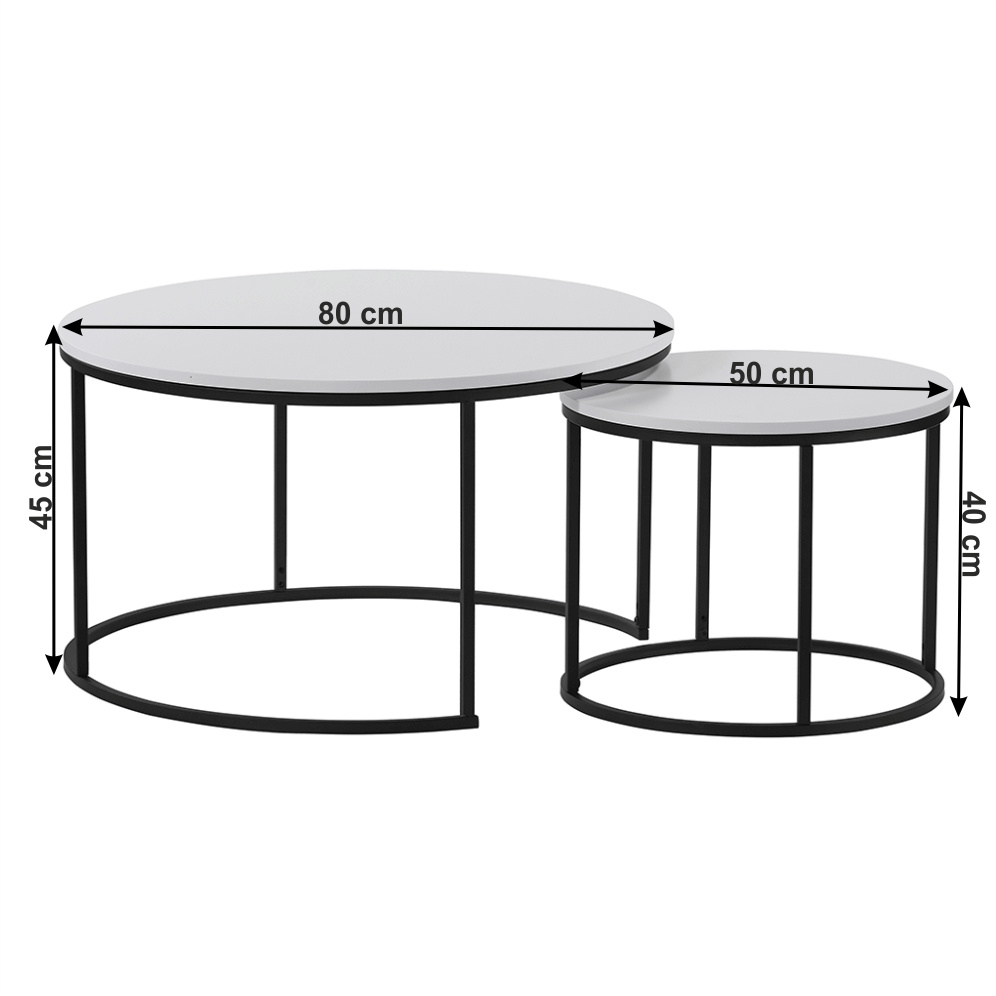 Set dvou konferenčních stolků Iklin Materiál: MDF / kov Barevné provedení: bílá / černá Rozměry větší (průměr x V): 80x45 cm Rozměry menší (průměr x V): 50x40 cm Nosnost: 30 kg Dodávané v demontu.