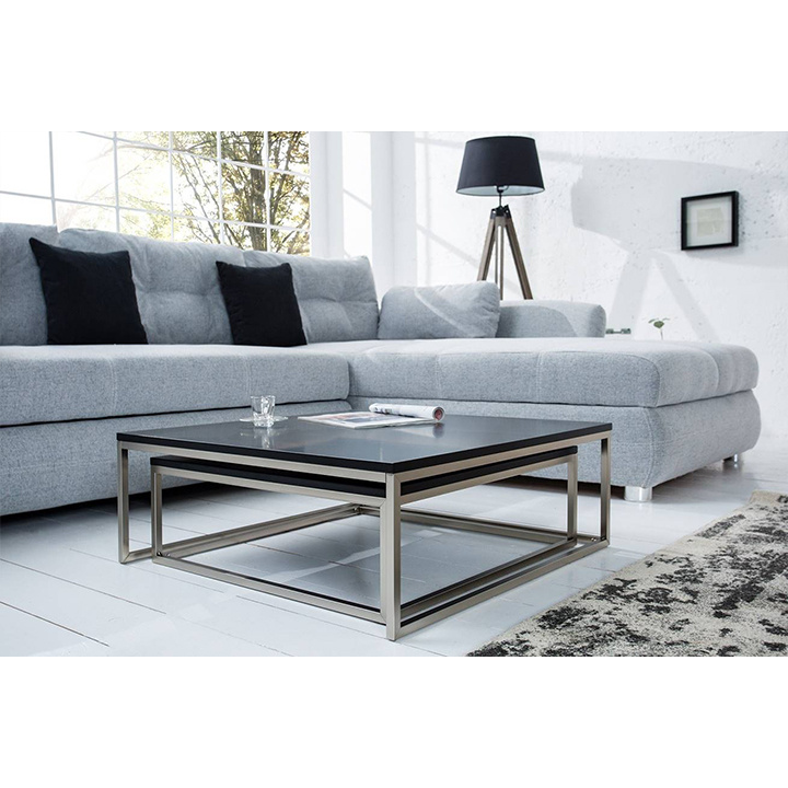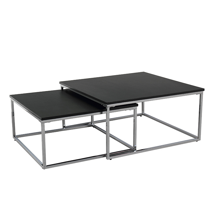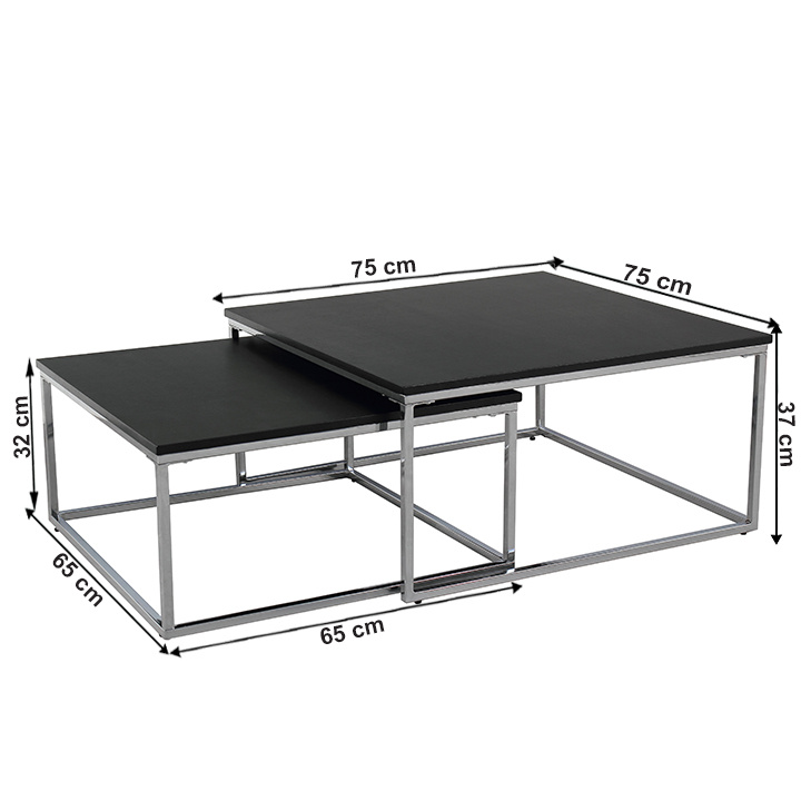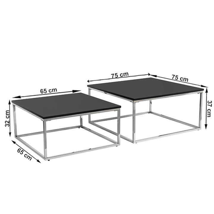 Set dvou konferenčních stolků, AMIAS Materiál: MDF / kov Barva: černá / chrom Rozměry většího stolku (ŠxHxV): 75x75x37 cm Rozměry menšího stolku (ŠxHxV): 65x65x32 cm Tloušťka materiálu: 15 mm Dodávané v demontu.