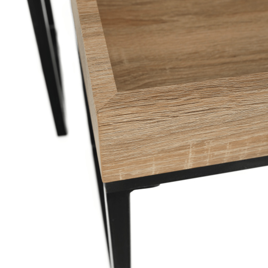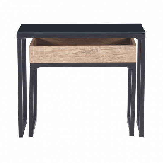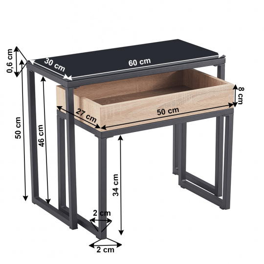 Materiál: MDF / sklo / kov Barva: dub / černá Rozměry vrchního stolku (ŠxHxV): 60x30x50 cm Rozměry spodního stolku (ŠxHxV): 50x27x44 cm Výška spodního stolku (od země): 34 cm Úložný prostor tvořený rámem z MDF Výška MDF rámu: 8 cm Vnitřní rozměry rámu (ŠxH): 47x27 cm Tloušťka kovového rámu (ŠxH): 2x2 cm Skleněná úložná plocha vrchního stolku Tloušťka skla: 0,6 cm Nosnost: 25 kg Úložný prostor tvořený rámem z MDF moderní design elegantní vzhled variabilní rozmístění industriální styl Dodávané v demontu