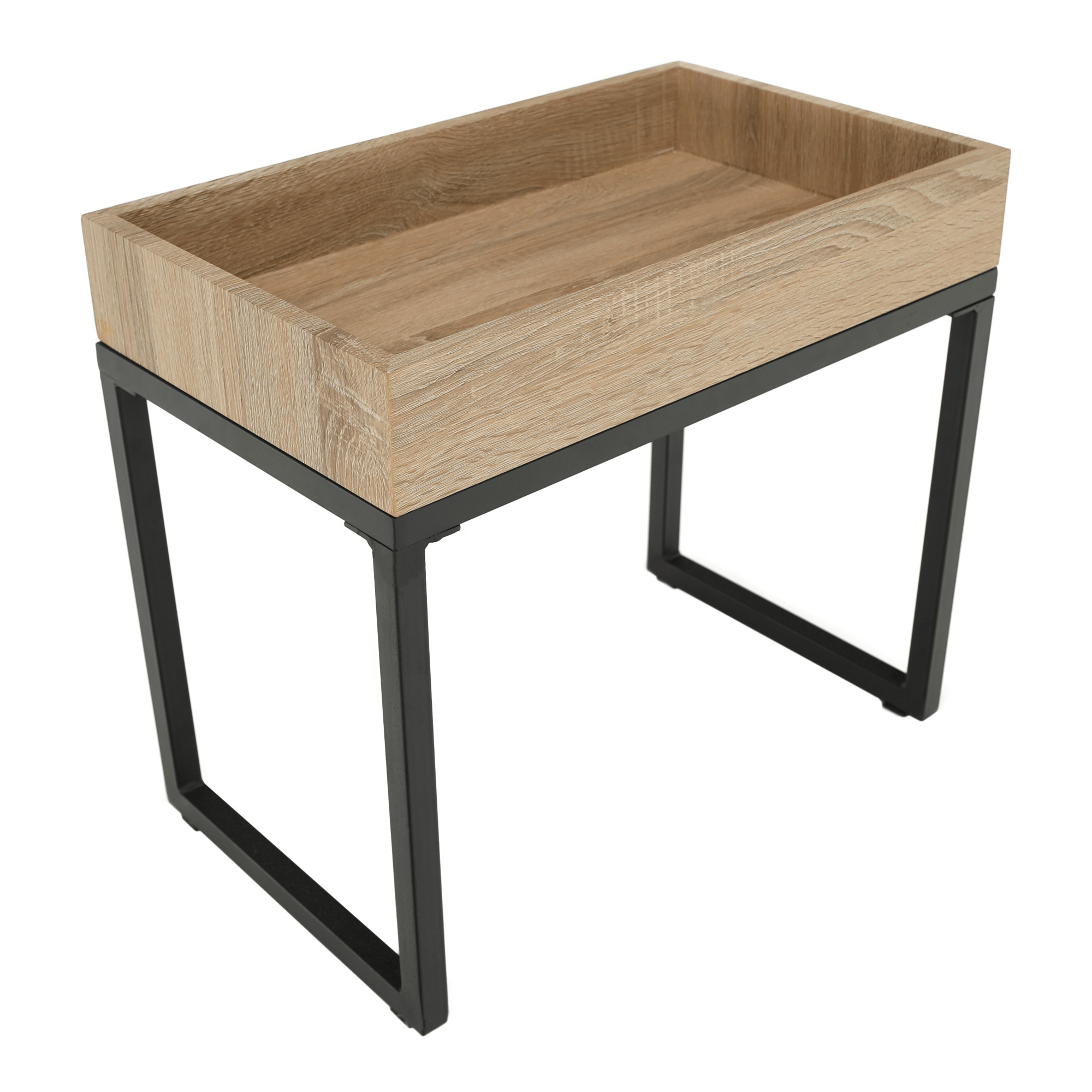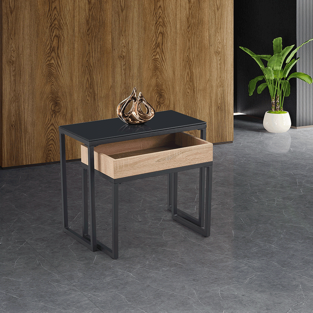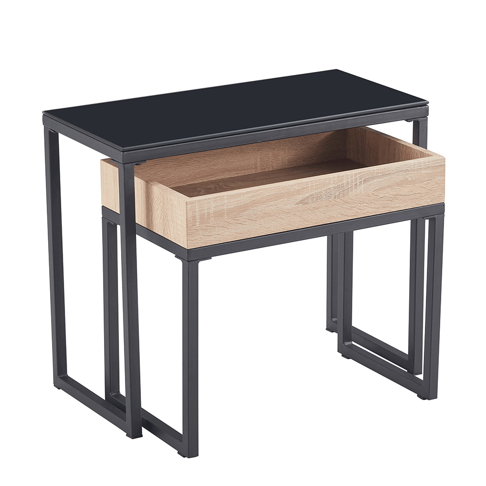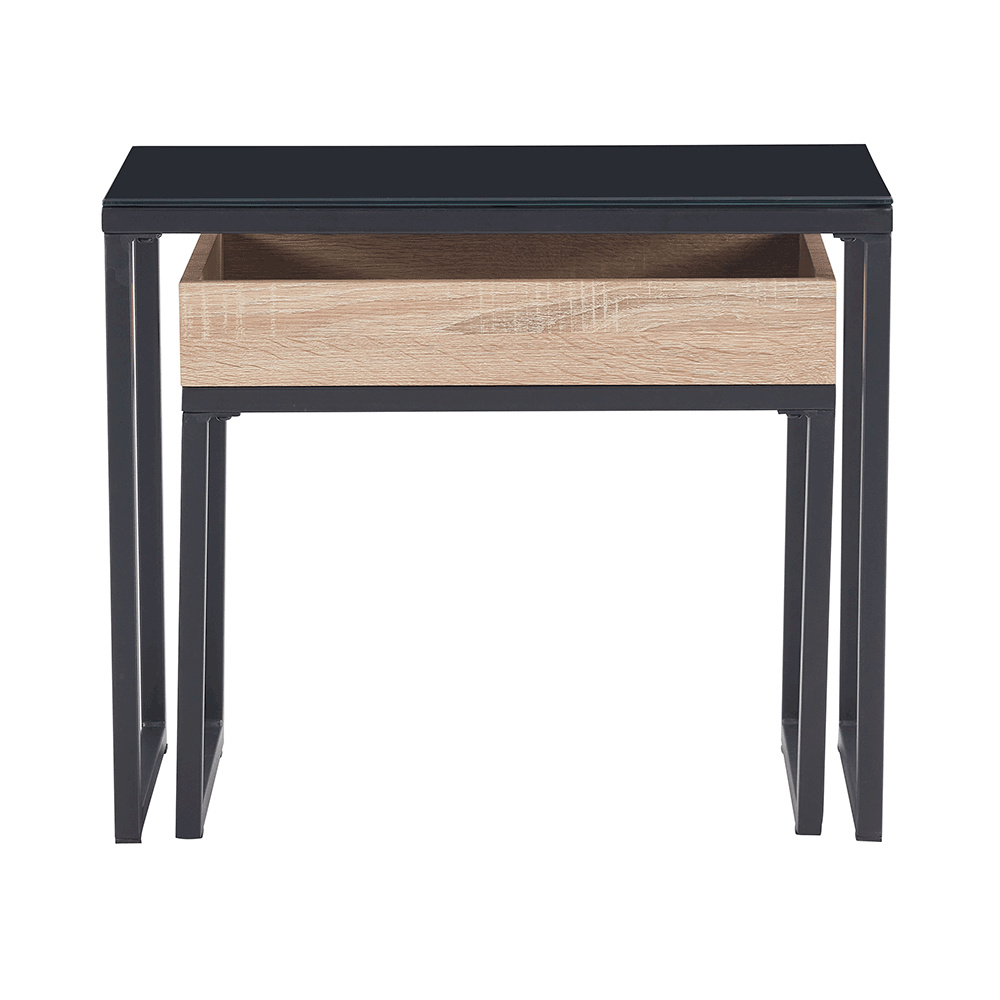 Materiál: MDF / sklo / kov Barva: dub / černá Rozměry vrchního stolku (ŠxHxV): 60x30x50 cm Rozměry spodního stolku (ŠxHxV): 50x27x44 cm Výška spodního stolku (od země): 34 cm Úložný prostor tvořený rámem z MDF Výška MDF rámu: 8 cm Vnitřní rozměry rámu (ŠxH): 47x27 cm Tloušťka kovového rámu (ŠxH): 2x2 cm Skleněná úložná plocha vrchního stolku Tloušťka skla: 0,6 cm Nosnost: 25 kg Úložný prostor tvořený rámem z MDF moderní design elegantní vzhled variabilní rozmístění industriální styl Dodávané v demontu