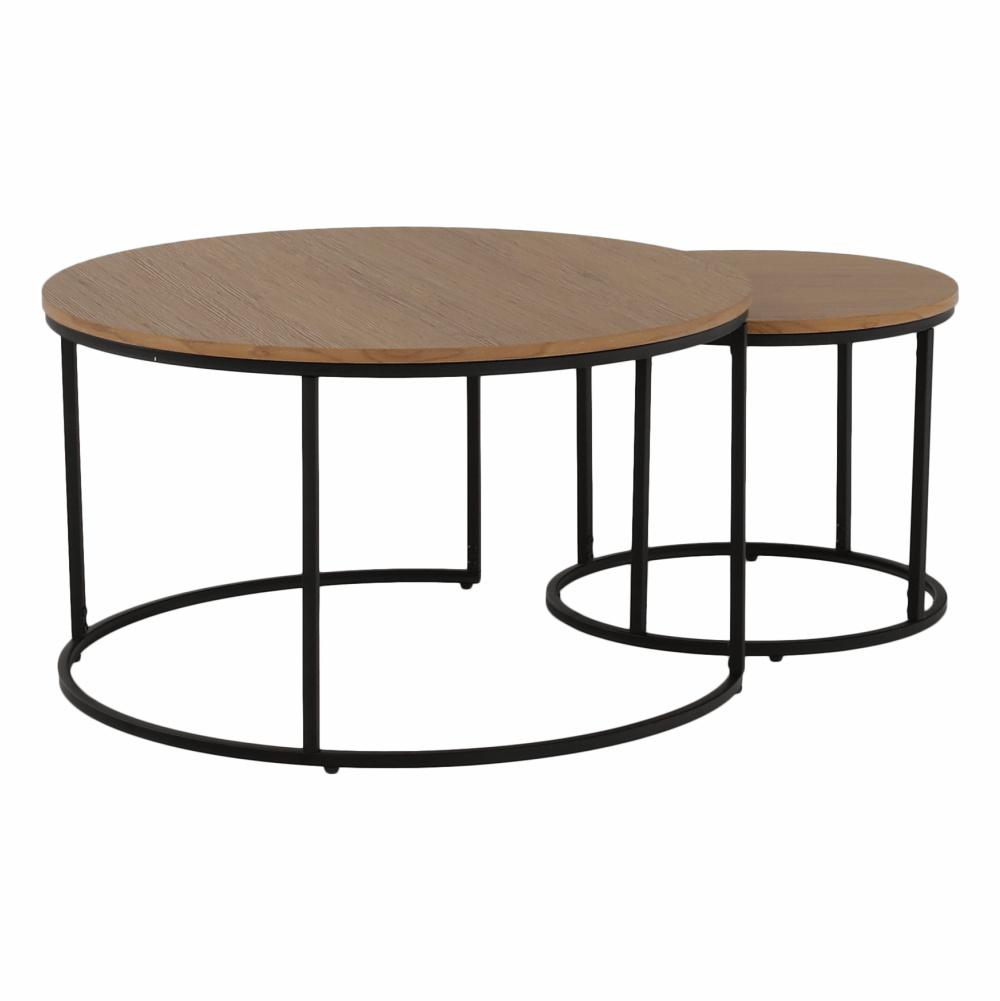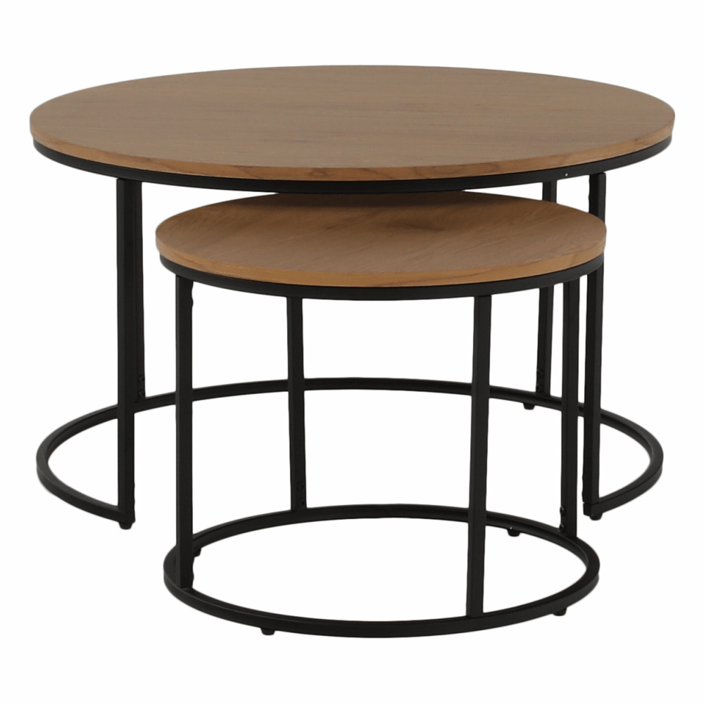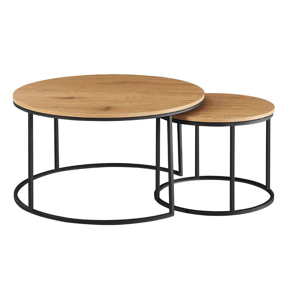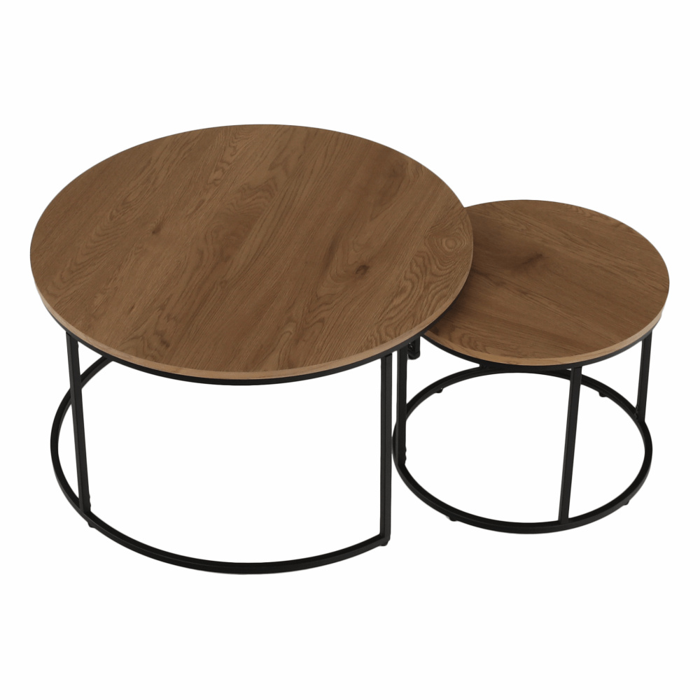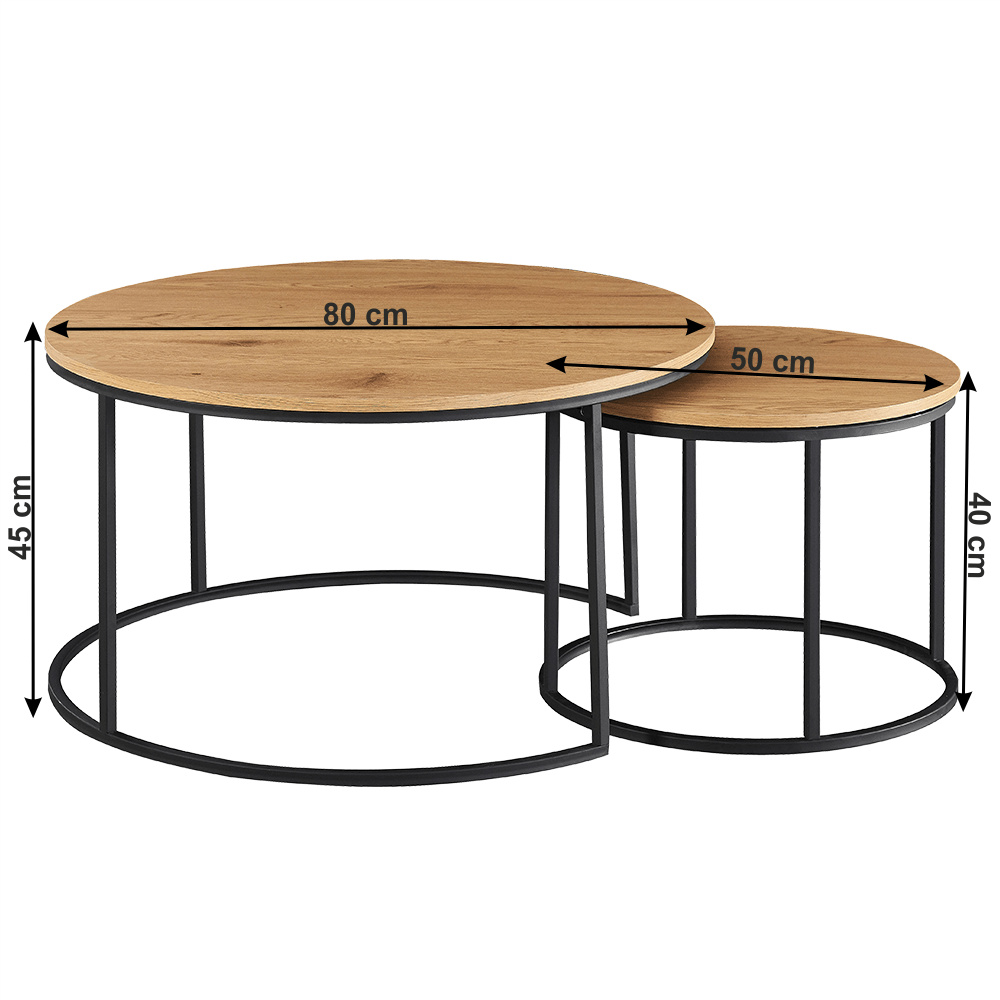 Set dvou konferenčních stolků IKLIN Materiál: MDF / kov Barevné provedení: dub / černý kov Rozměry větší (průměr x V): 80x45 cm Rozměry menší (průměr x V): 50x40 cm Nosnost: 30 kg Dodávané v demontu.